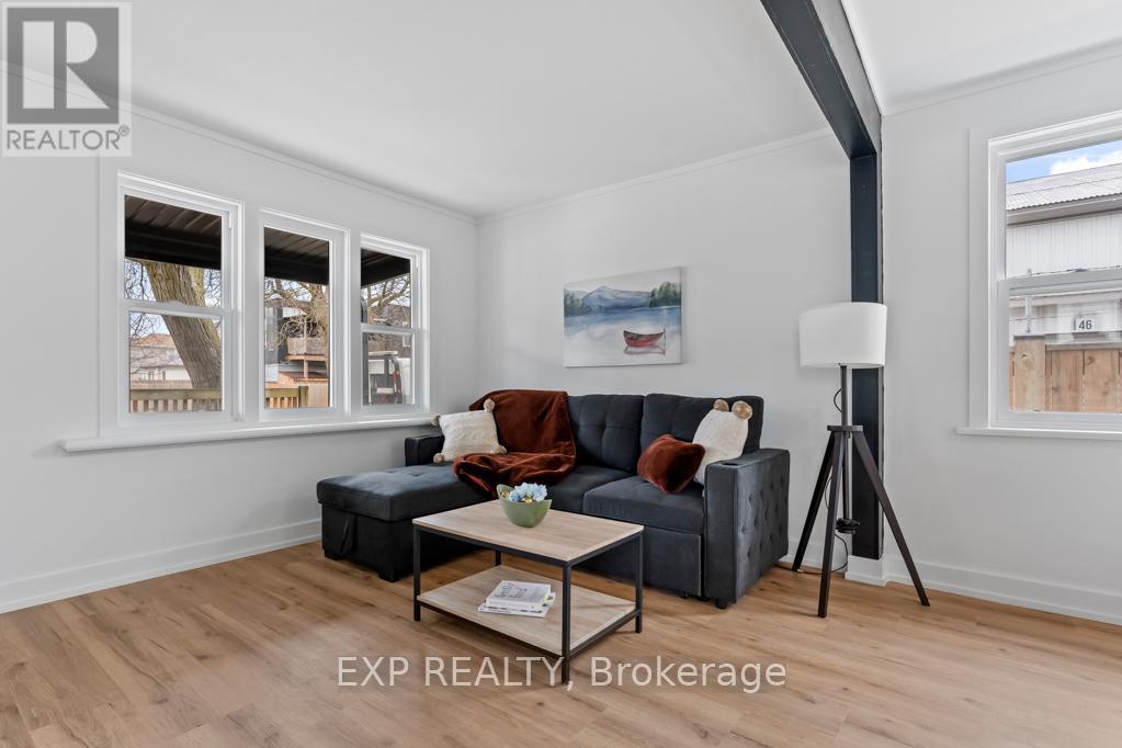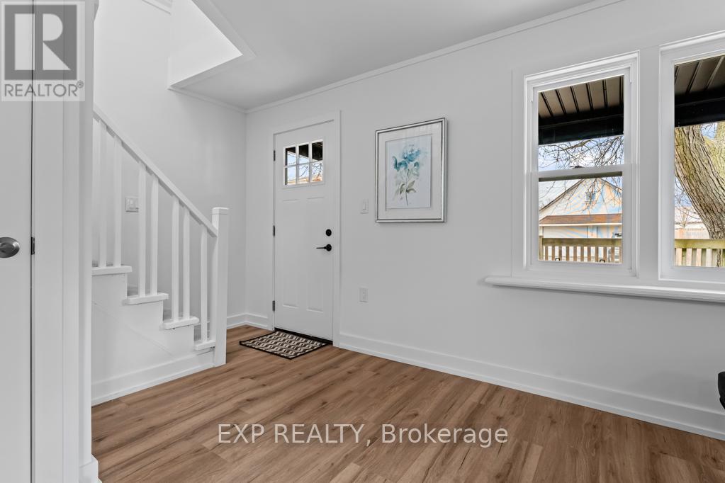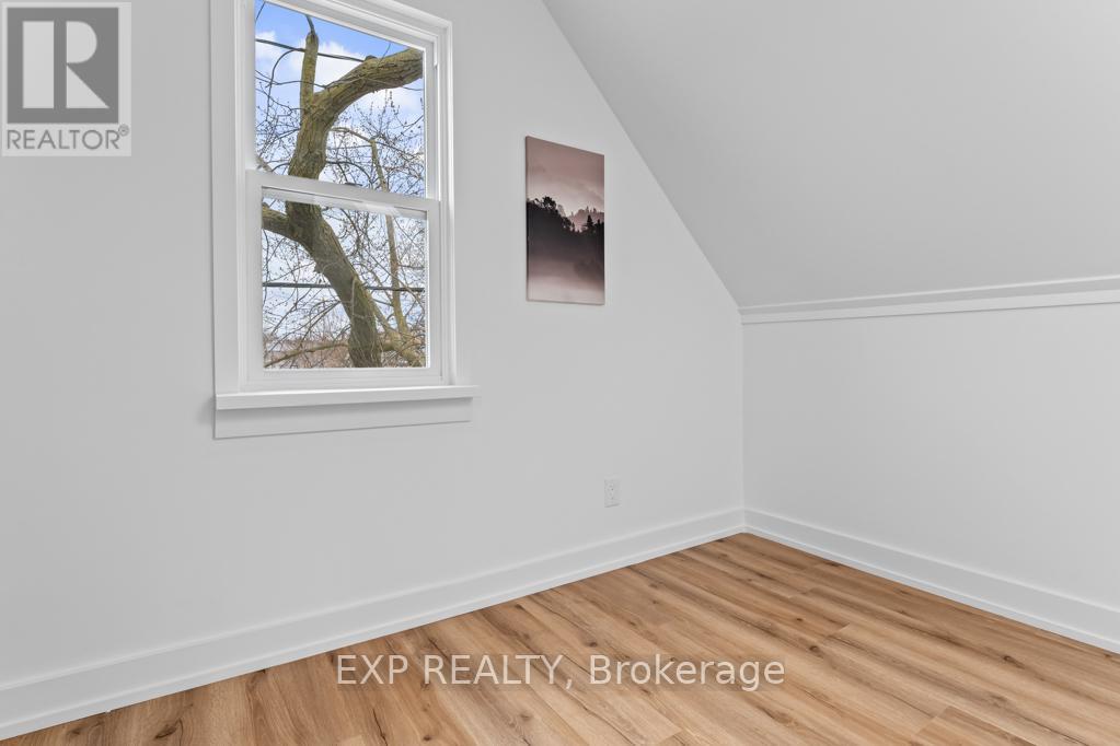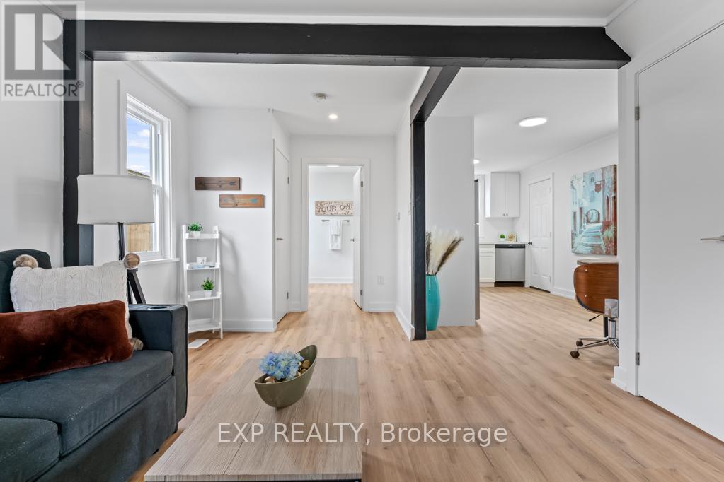 Charming and affordable fully renovated 1.5-storey detached home in Welland, conveniently located just minutes from the highway. The loft-style primary bedroom offers a spacious double closet and a cozy, functional layout. The main floor features a bright open-concept design with a modern kitchen that flows seamlessly into the dining area-perfect for everyday living and entertaining. The adjoining living room is warm and inviting, while the fully updated 4-piece bathroom adds a fresh, modern touch. Main-floor laundry adds everyday convenience. Enjoy your morning coffee or unwind in the evening on the welcoming covered front porch. (id:64974)