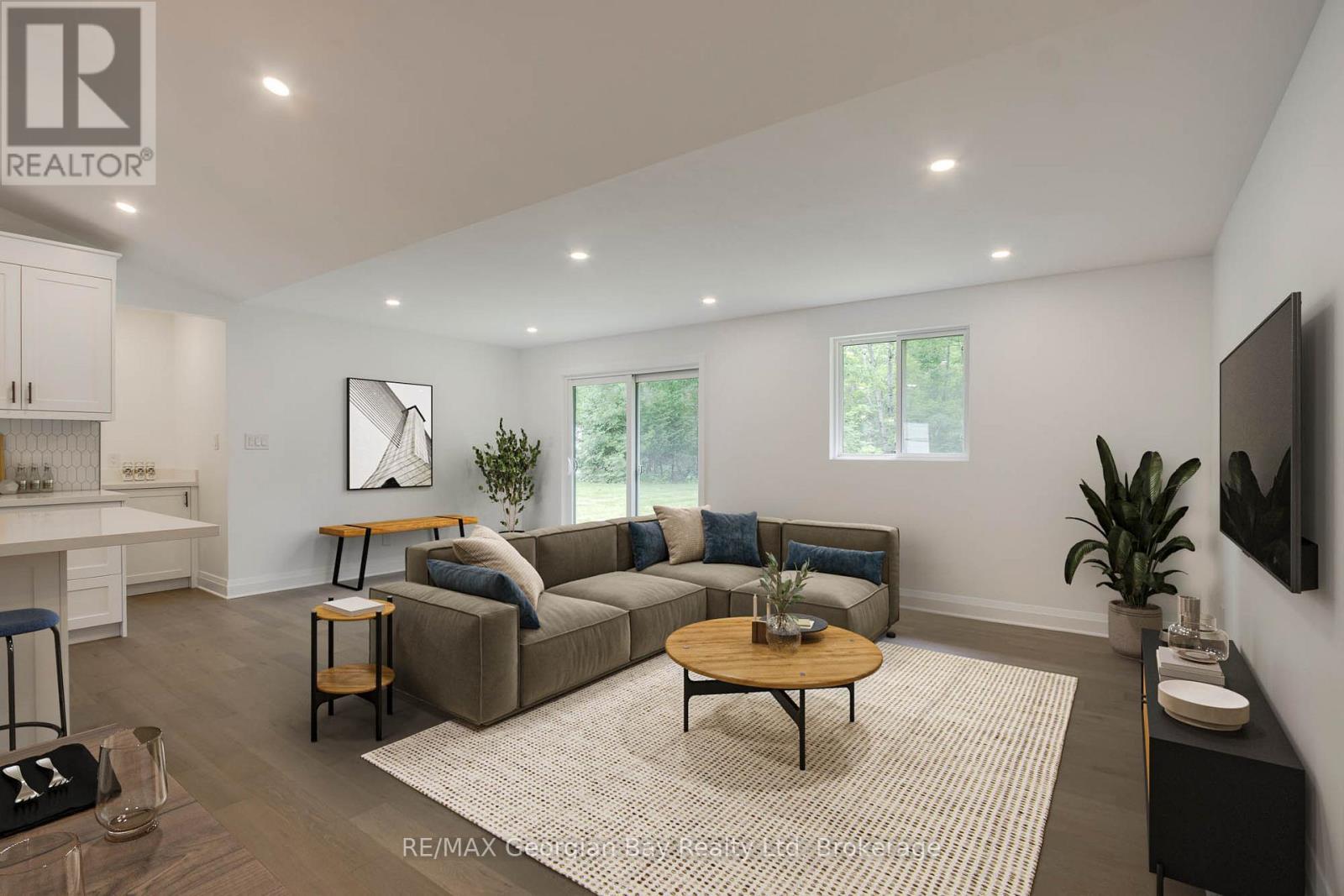 Move-in-ready at its finest! Come visit this gorgeous bungalow on a generous property of over 1/2 an acre in Midland, near downtown amenities, marinas, trails and the sparkling shores of Georgian Bay. This stunning 3 bedroom, 2 bathroom home offers the perfect blend of modern living, natural charm and sophistication. Nestled on an expansive lot backing onto trees, this home provides a peaceful retreat just minutes from the heart of downtown for your shopping and dining pleasure. Step inside to discover a thoughtfully curated interior featuring stylish finishes, an abundance of natural light, and open-concept living spaces. Whether you're relaxing in the living room, preparing meals in this gorgeous kitchen, or entertaining friends and family, every corner of this home has been designed with comfort and elegance in mind. Outside, enjoy the tranquility of your spacious yard ideal for snowshoeing, fort building, an ice rink or simply soaking in the serene surroundings with your favourite hot beverage in hand. Gain peace of mind from all the improved elements of this home, new in 2024-2025 including septic system, shingles, windows and doors, exterior cladding, water heater, engineered hardwood flooring and tile, kitchen and bathroom fixtures, appliances - even a pot-filler! Here is your chance to own this beautiful gem, surrounded in nature near Georgian Bay. Some images are virtually staged and one exterior image includes a detached garage rendering, for concept only. Zoning allows for an accessory building, accessory dwelling unit, etc. Buyers to make their own inquiries regarding potential uses for the property to ensure it meets their needs. Schedule your personal visit today. (id:64974)
