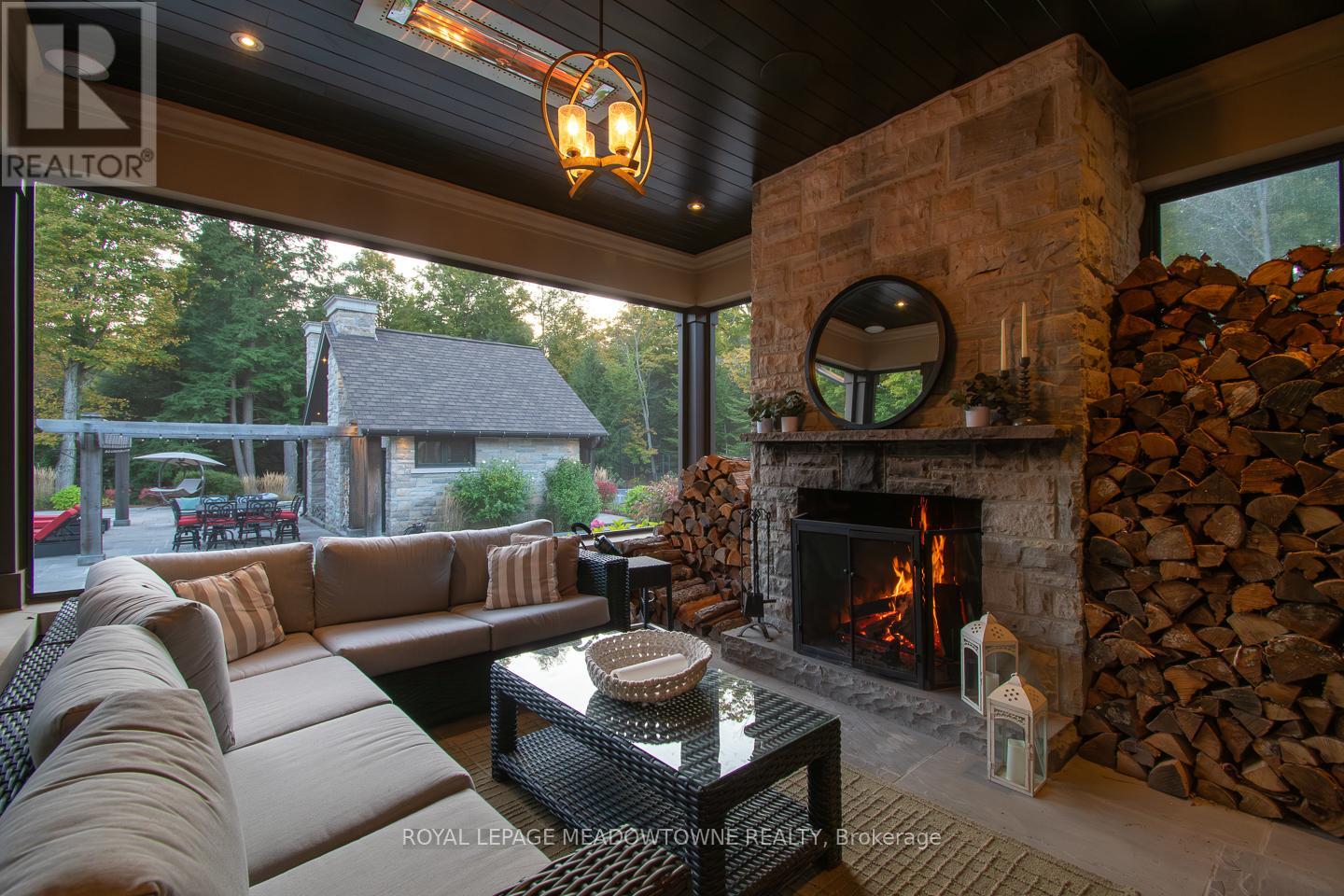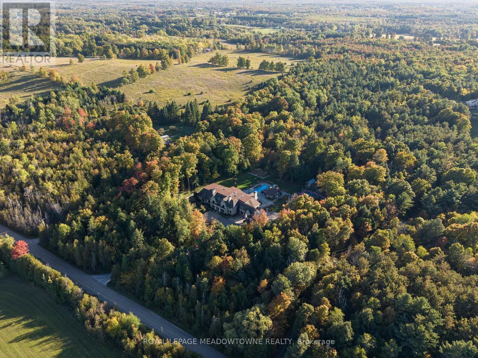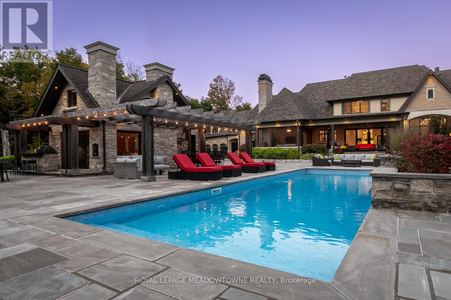 A private 5 acre estate designed for a life where everything happens at home. Just minutes from Milton, Acton, Pearson Airport, and Toronto, it offers the rare balance of privacy with everyday convenience. Designed by renowned architect David Small, the residence blends architectural presence with warmth and livability across more than 16,000 sq ft of finished space. Homes of this scale and design are rarely offered in such a private setting so close to the city. Every room was designed to connect to the surrounding landscape, where mature trees, walking trails, and landscaped grounds create a setting that feels calm and restorative. At the heart of the home, gathering spaces invite family and friends to come together, while the private primary wing offers a retreat of its own. A beautiful office and sitting area overlook the surrounding nature, creating a quiet place to work or unwind. The suite continues with dual dressing rooms, a spa inspired ensuite with heated floors and sauna, and walkout access to a secluded deck with hot tub surrounded by forest. The lower level transforms the home into a destination for entertainment and relaxation, where evenings unfold with a bowling alley, golf simulator, theatre, bar, wine cellar, and recreation spaces. A separate guest or in law suite provides independent living with its own entrance and living space, ideal for extended family or long term visitors. Outdoors, the estate unfolds like a private resort. Spend summer days by the pool, gather in the outdoor kitchen, enjoy the sport court, explore the surrounding walking trails, or tend the vegetable gardens. As evening falls, the illuminated grounds create a warm glow across the landscape, turning the property into a peaceful retreat with endless ways to enjoy every season. A private estate designed for the moments that matter most where life happens and home becomes the destination. (id:64974)