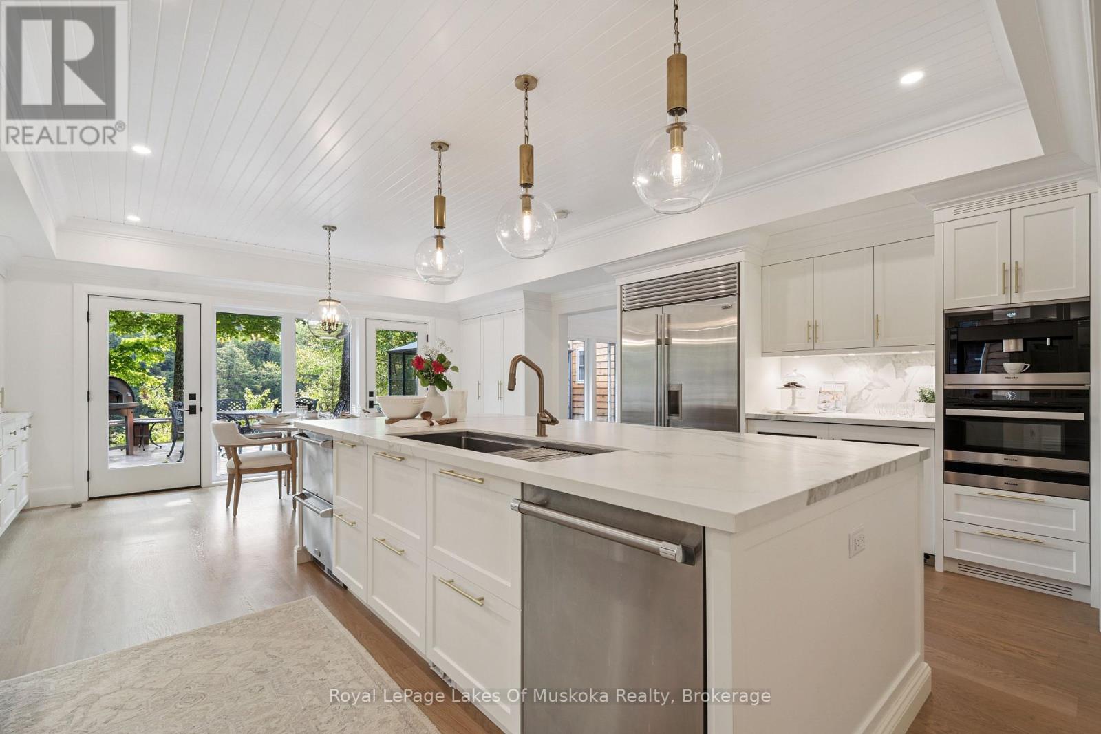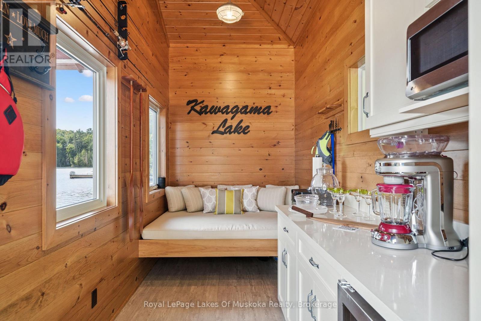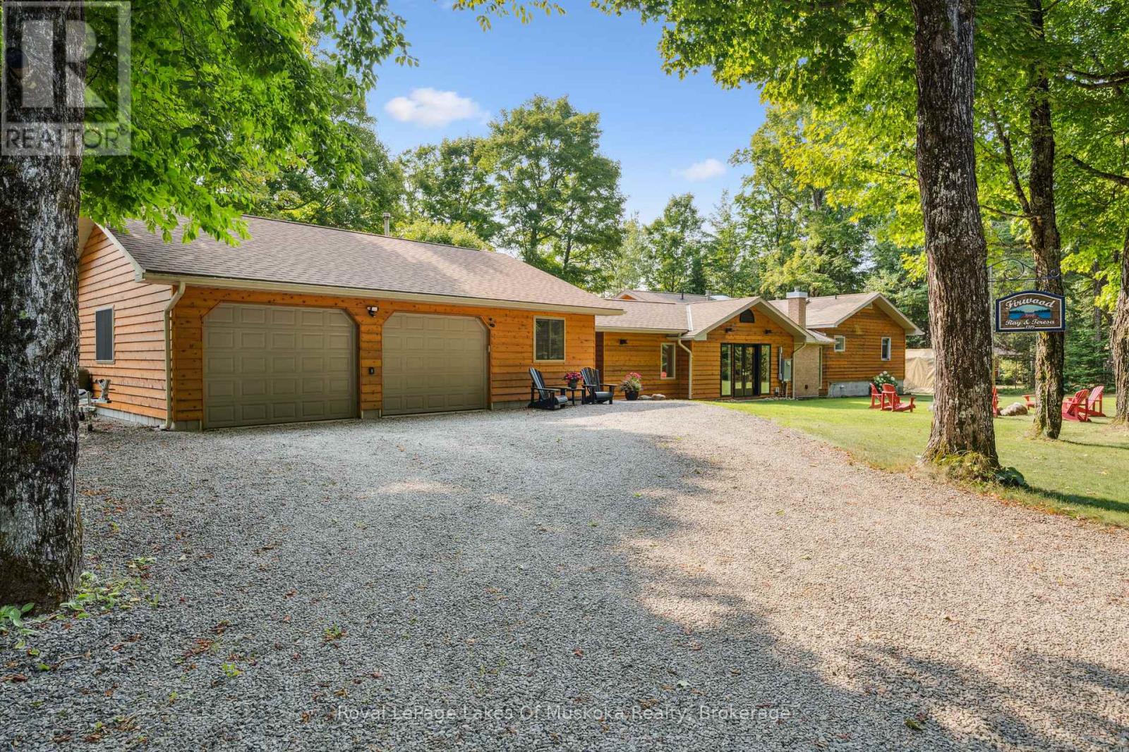 Luxurious 4-season waterfront home located on Kawagama Lake with easy year round access. The setting feels very much like Algonquin Park but is only 15 minutes from Dorset. Crown land abounds in the area so all forms of recreation are readily accessible. Kawagama Lake is a very large lake with exceptional water quality + access to 2 other lakes. This property is located on a sheltered bay with a glorious southern view across to untouched Crown land. The fully renovated waterfront home is loaded with quality designer details and finishes. The focus of the redesign was to create a space that was able to accommodate large groups of family and friends. Multiple entertaining areas include a family room, separate living and dining rooms, and a kitchen equipped with the finest high end appliances It is the core of the home. It is open to the family room with a 5x10 ft. island as well as a separate breakfast area. It is the ideal gathering place. No expense was spared in equipping and finishing this space. A wood burning stone fireplace graces the living/dining area while a Valor gas fireplace in the family room adds to the warm atmosphere. The primary suite is a private oasis with a beautiful ensuite and year round sunroom that is just steps from the outdoor hot tub. A double sided Valor fireplace offers cozy warmth to both areas of the suite. The oversized detached garage is filled with custom features for serious toy collectors plus a dedicated home office and an additional guest bedroom. The generous dock is finished with low maintenance treated ash decking. Post & beam boat port with attached entertainment area, perfect for cocktail and snack prep! Beautiful granite stairs and paths wind through the property. Top notch mechanical systems are supported by an oversized automatic backup generator. Part ownership in a private 31 acre park to the rear of the property is also included. The neighborhood is warm & welcoming. This is a premium property in a premium location. (id:64974)