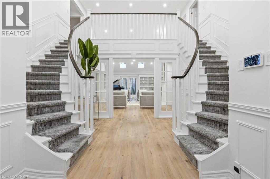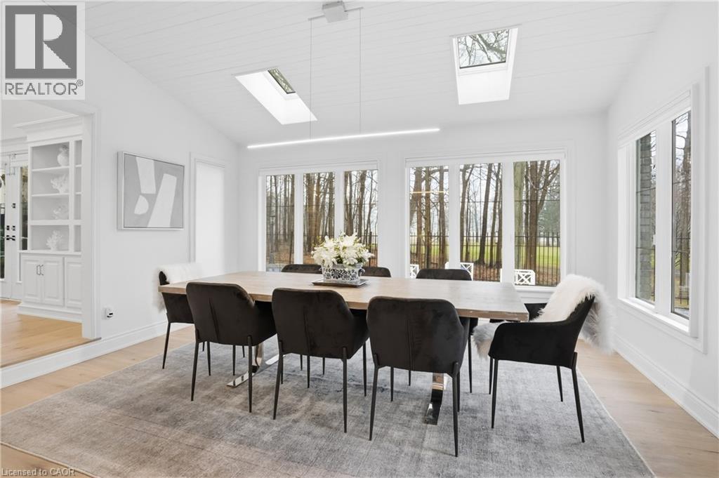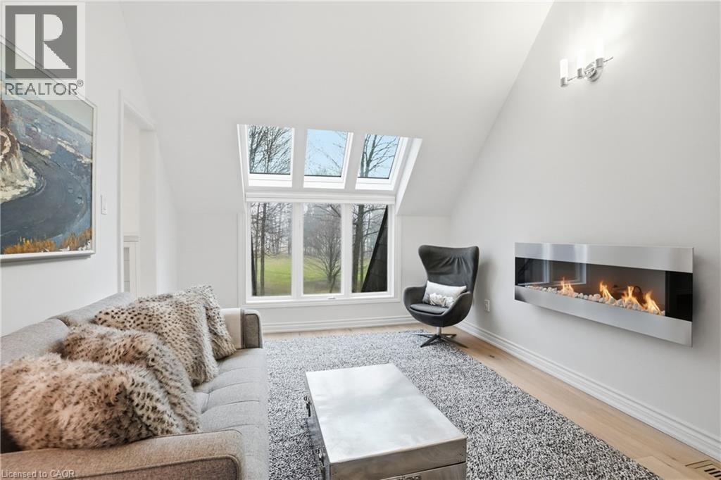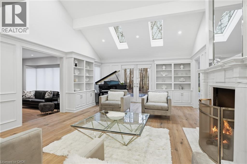Situated on a serene, tree-lined street, this remarkable five-bedroom home offers breathtaking views and exceptional privacy, backing directly onto the prestigious Hamilton Golf and Country Club. Surrounded by mature landscaping, the property blends timeless elegance with modern comfort. The main level features expansive principal rooms, including a dramatic family room with vaulted ceilings, skylights, custom millwork, and a striking fireplace. A gourmet kitchen with premium finishes flows seamlessly into a sun-filled solarium overlooking the professionally landscaped backyard, complete with a pool and outdoor entertaining spaces. Upstairs, the primary suite serves as a private retreat with a fireplace, walk-in closet, and spa-inspired six-piece ensuite. Additional bedrooms are generously sized, ideal for family and guests. The fully finished walk-out basement offers versatile space for recreation, entertaining, or multi-generational living, including additional living areas and a private retreat. Additional features include 200 amp electrical service and an EV charging plug in the garage, combining modern convenience with refined living. This exceptional home presents a rare opportunity to enjoy elegant design, comfort, and lifestyle in a coveted golf course setting. (id:64974)