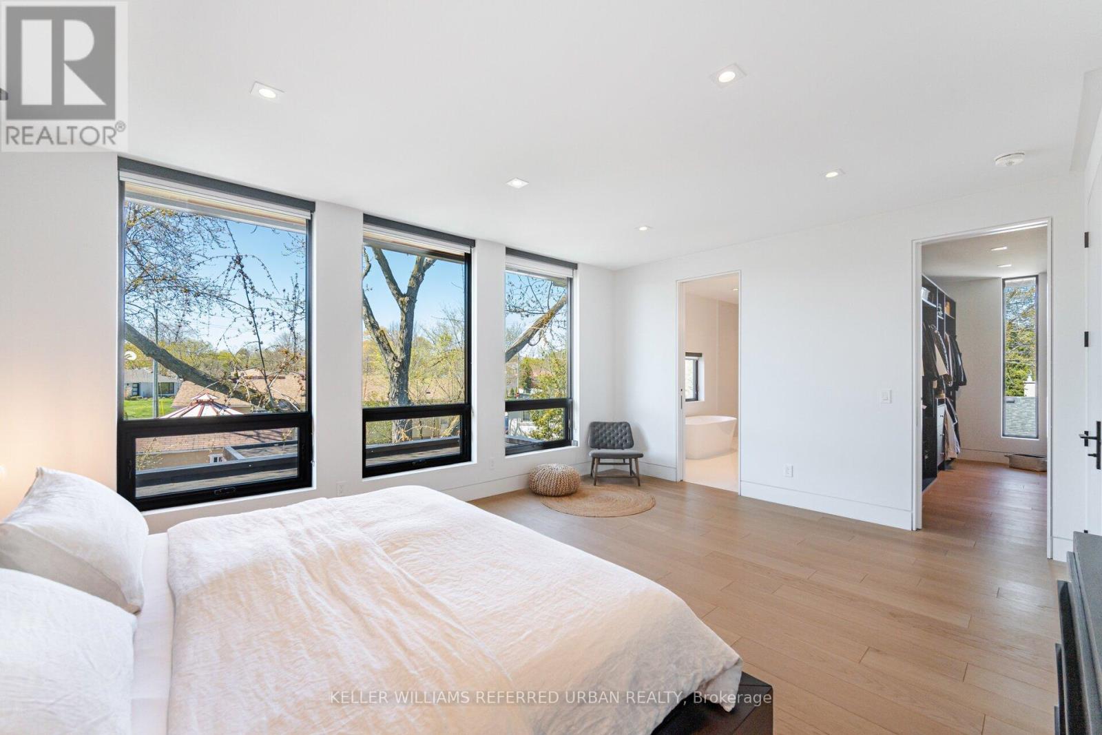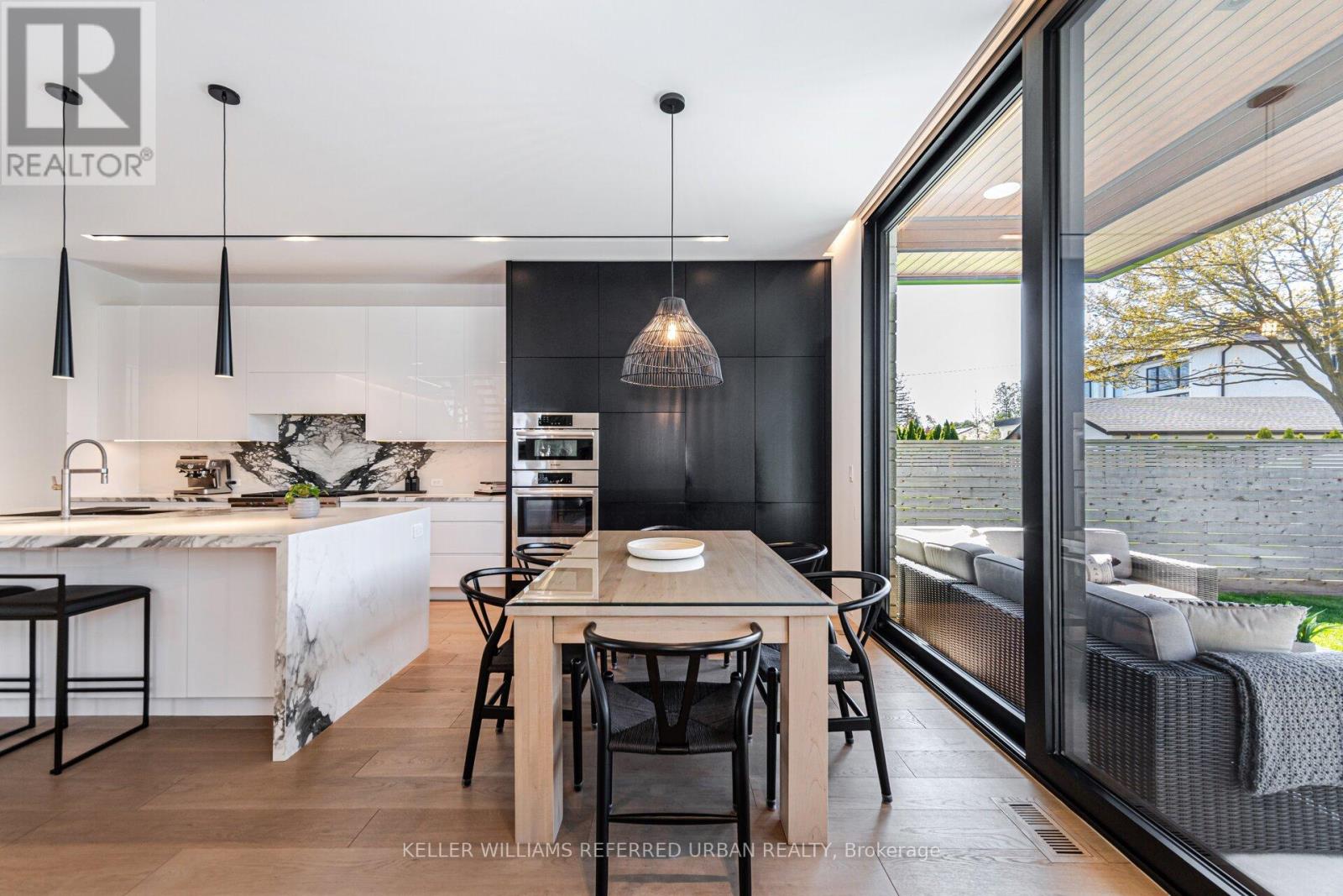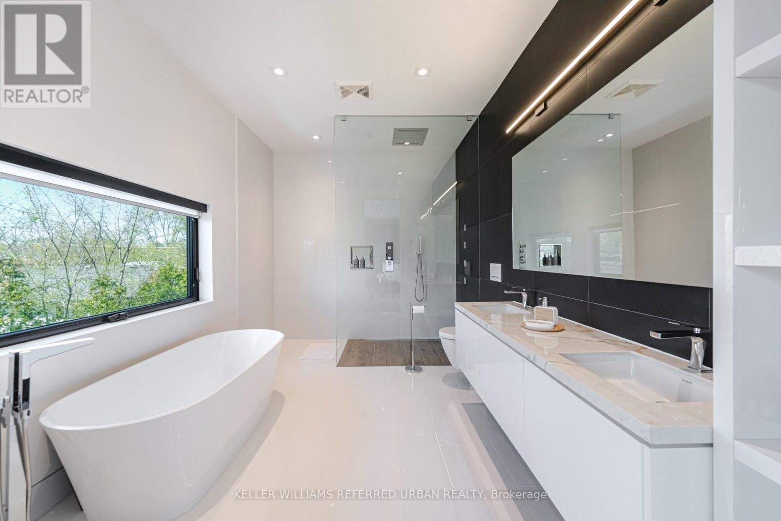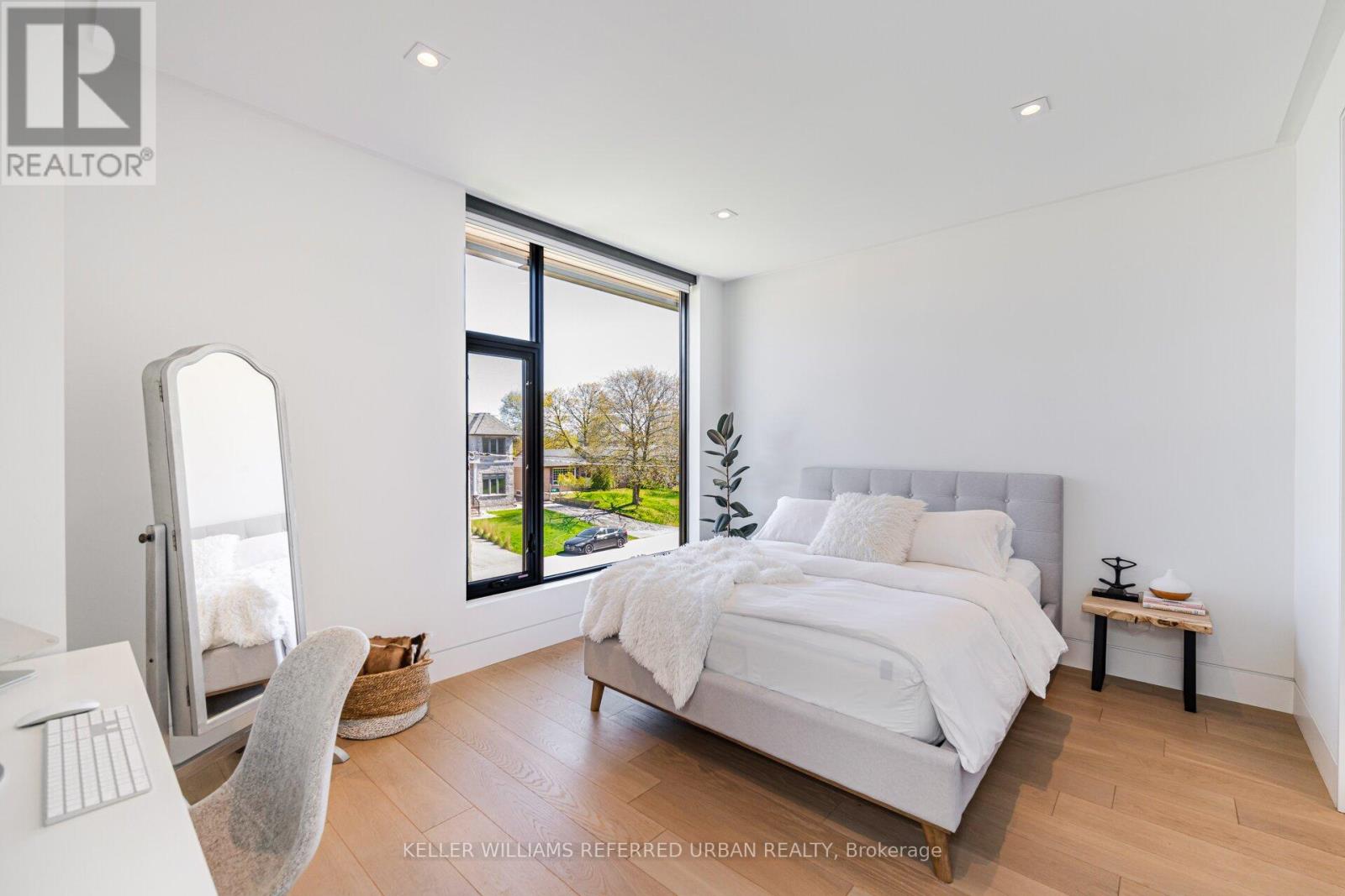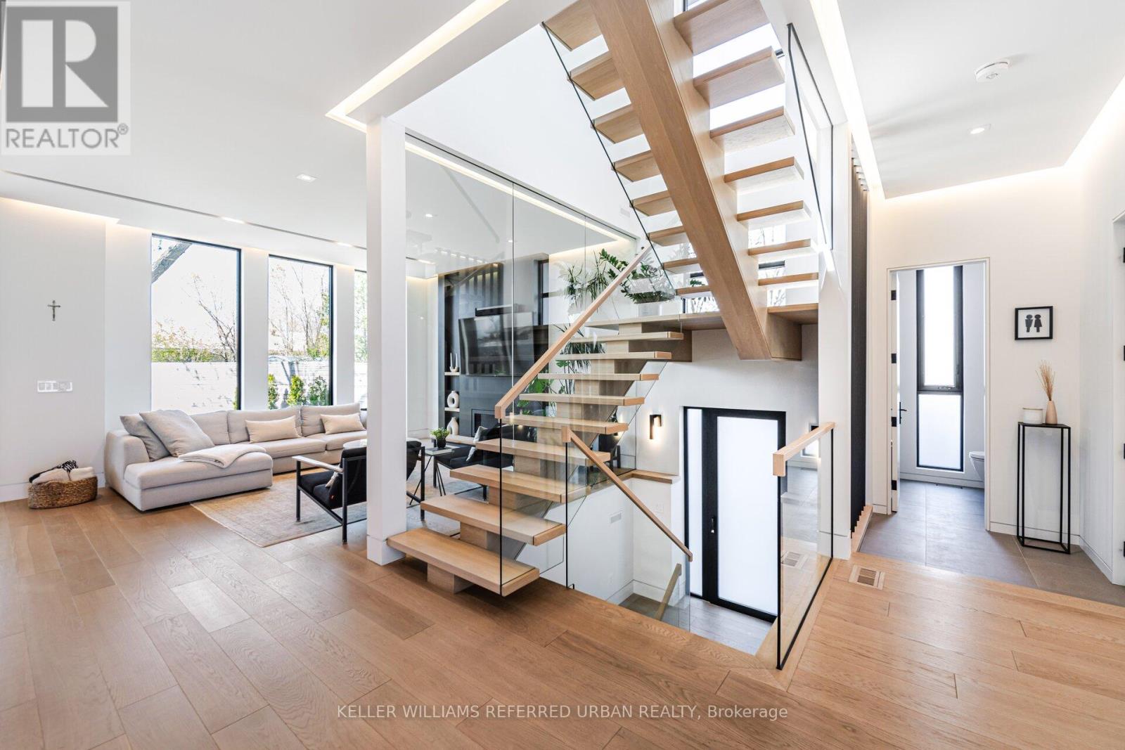 Step into the pinnacle of modern elegance with this stunning custom-built executive home, nestled in the highly sought-after heart of Southeast Oakville. Offering a seamless blend of sophisticated design, premium finishes, and an abundance of natural light. From the moment you enter, you'll be captivated by the open and intelligently configured interior layout, soaring 10' floating ceilings with cove lighting, and floor-to-ceiling windows that fill the space with sunlight. Every detail has been meticulously crafted, from the European white oak engineered hardwood floors to the 8' solid core doors, flush trim, and hidden anchored glass railings that exude contemporary sophistication. The heart of the home is the designer kitchen, featuring an oversized island, 10' cabinetry, and top-of-the-line appliances, perfect for entertaining or enjoying quiet family moments. The main floor flows effortlessly into a spacious living area, complete with a gas fireplace, built-in surround sound, and motorized blinds for ultimate convenience. Upstairs, natural light continues to shine through skylights and oversized windows, illuminating four generously sized bedrooms, each with its own ensuite bathroom and custom-built walk-in closets. The bespoke laundry room, with floor-to-ceiling cabinetry, adds a touch of practicality and style. The finished basement offers additional living space, ideal for a home theatre, gym, or playroom, while the mono-stringer staircase and glass railings create a striking visual statement from top to bottom. This home is more than just a residence; it's a lifestyle. With its unparalleled craftsmanship, high-end finishes, and prime location in one of Oakville's most desirable neighbourhoods, this property is truly Luxury at Its Finest. Don't miss the opportunity to experience the intricate quality and modern elegance of this exceptional home. (id:64974)