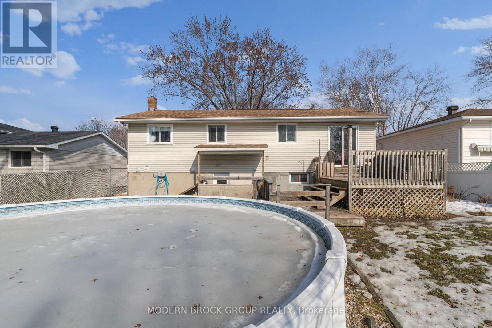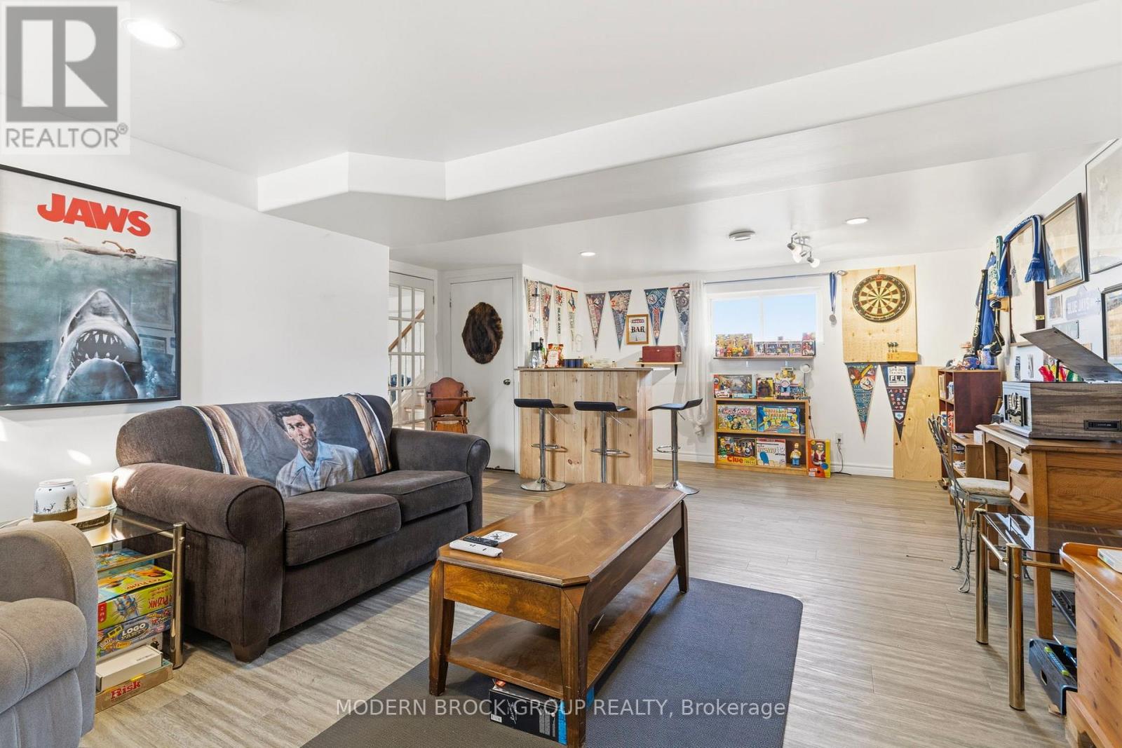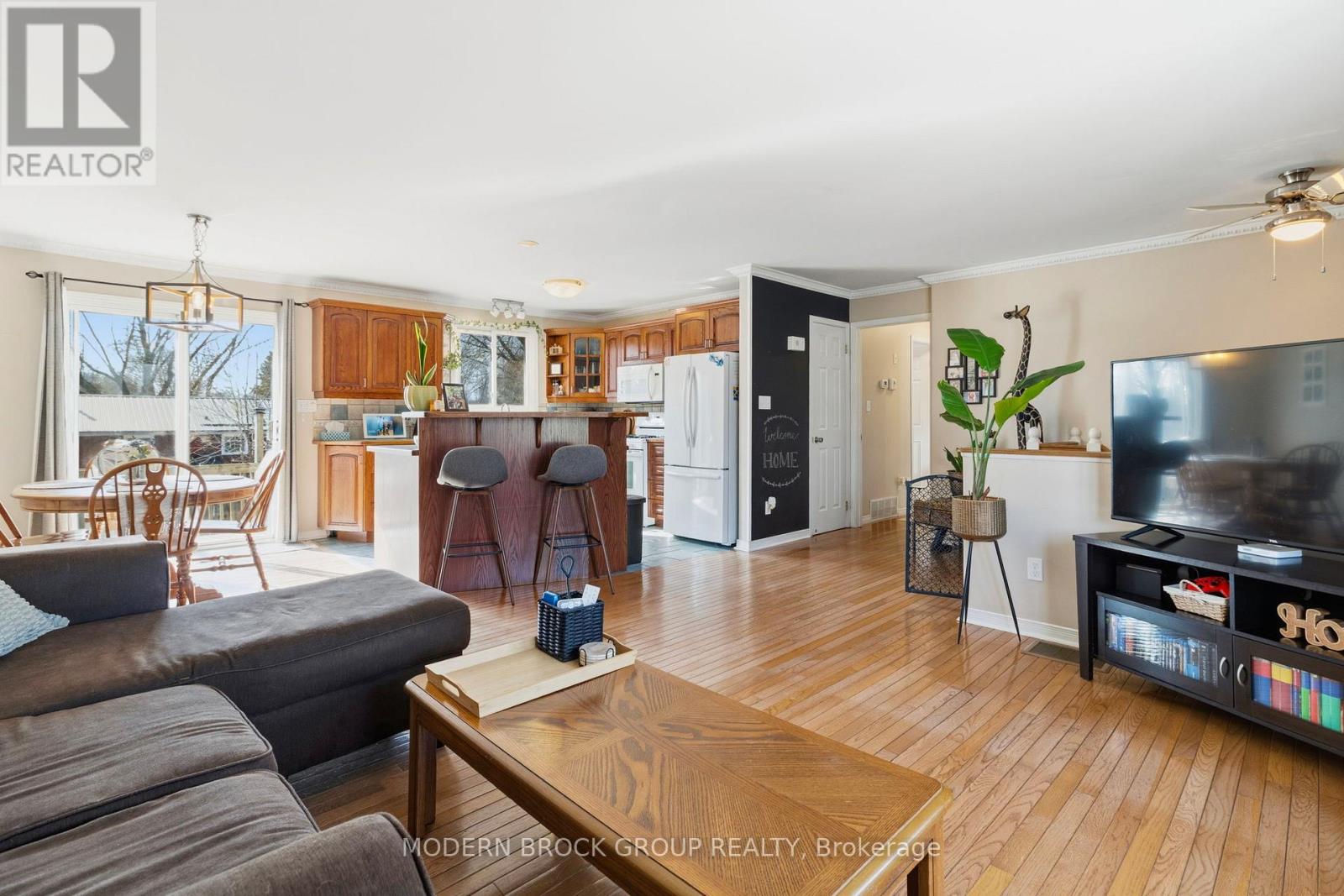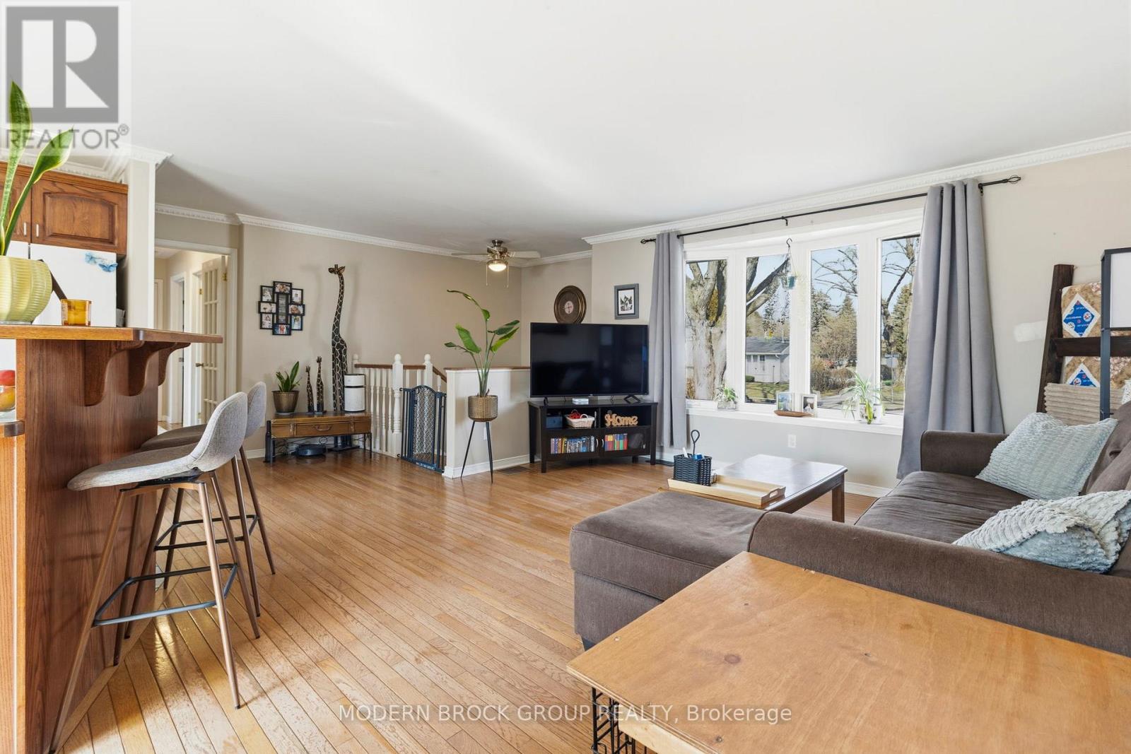 Welcome to this well-maintained 3+1 bedroom, 2 full bathroom raised bungalow located on a quiet crescent in Brockville's desirable north end. With bright living spaces, thoughtful updates, and a fully finished lower level, this home offers flexibility for families, entertaining, or multi-purpose living. The main floor features a spacious open-concept living and dining area filled with natural light from the large front window and complemented by hardwood flooring and crown moulding. The kitchen offers ample cabinetry, functional workspace, and easy flow to the dining area-perfect for everyday living or hosting friends and family. Three comfortable bedrooms and an updated main bathroom featuring both a separate shower and a soaker tub with heated floors complete the upper level. Downstairs you'll find a large finished recreation room with gas fireplace, ideal for movie nights, a games area, or a home gym. The lower level also includes a fourth bedroom, full bathroom, laundry room, and additional storage, offering great flexibility for guests, teens, or a home office. Step outside to enjoy the fenced backyard featuring a deck and above-ground pool, creating a great space for summer gatherings and outdoor relaxation. Recent improvements include eavestroughs with leaf guards (2024), pool deck (2024), sand filter for pool (2024), gas hot water tank (2025), bar with sink (2023), roof shingles (2016), and two updated bathrooms. Conveniently located close to parks, schools, shopping, and Brockville amenities, this move-in ready home offers comfort, space, and a fantastic neighbourhood setting. (id:64974)