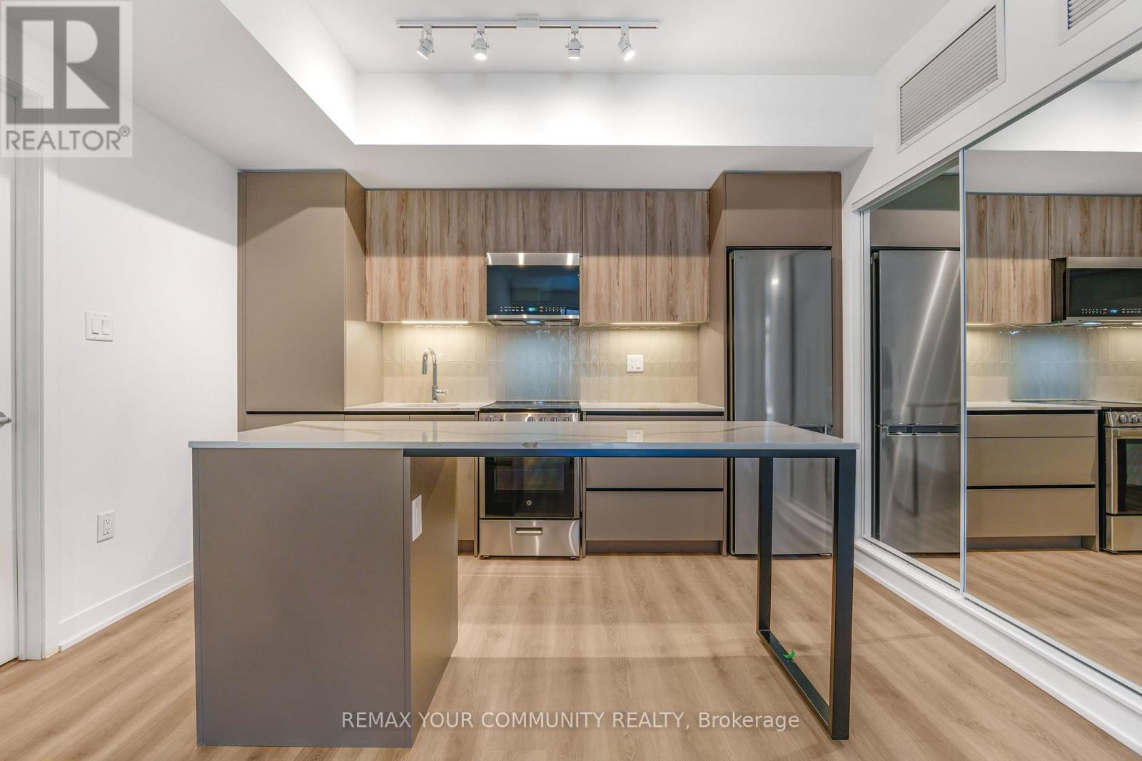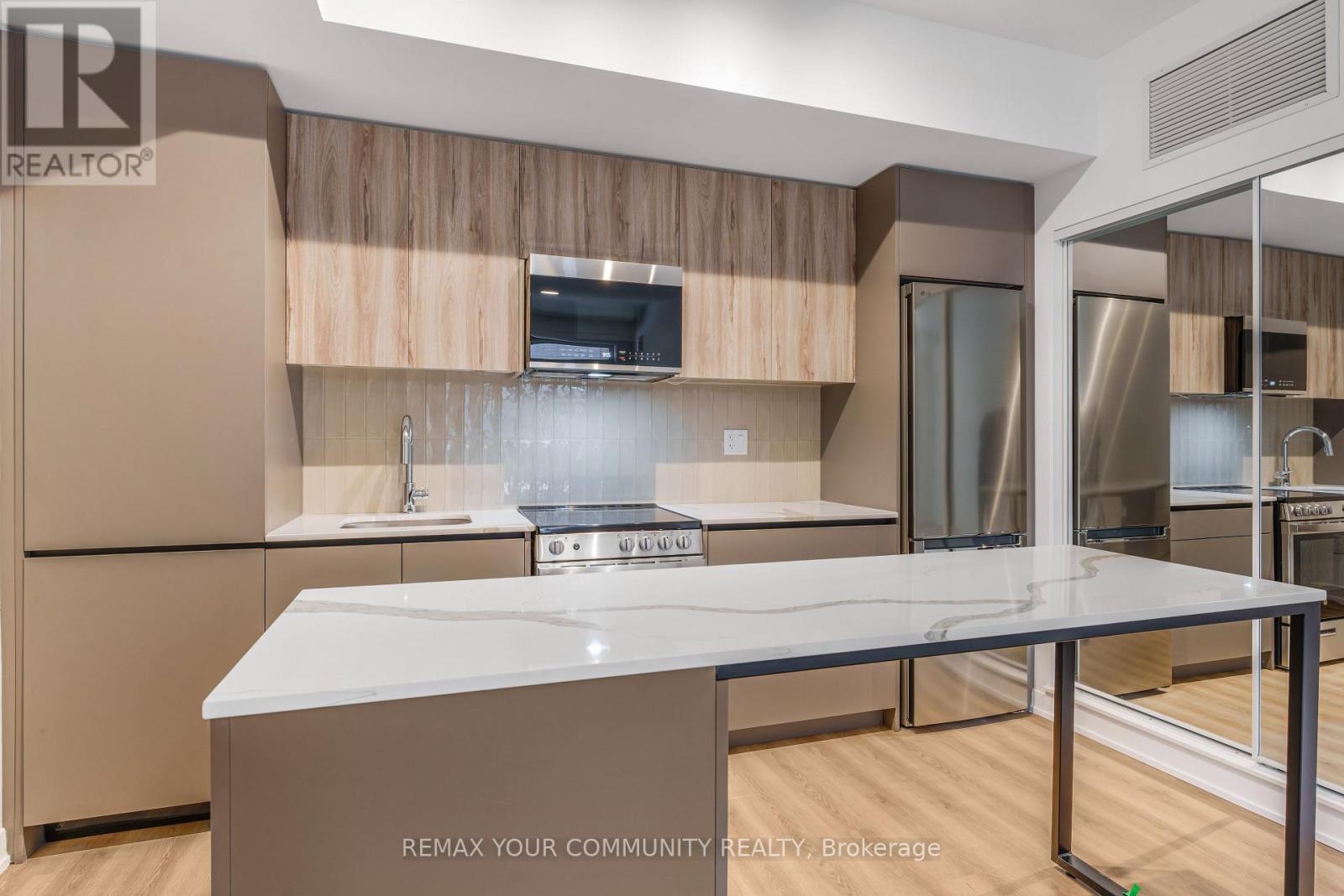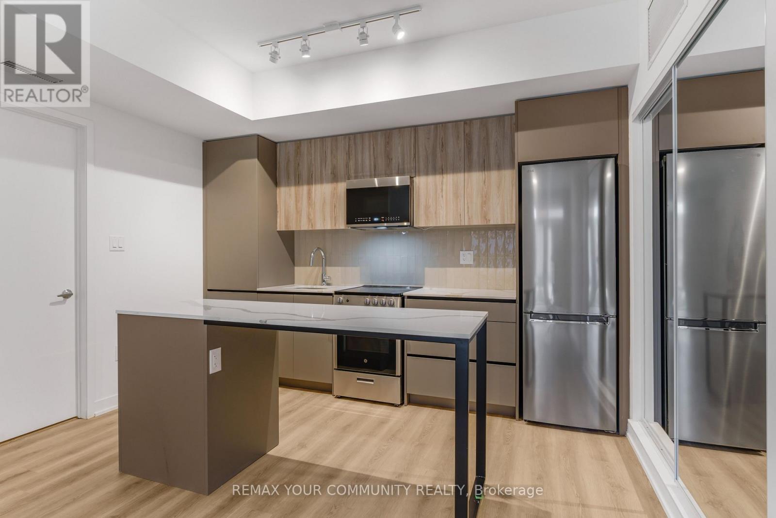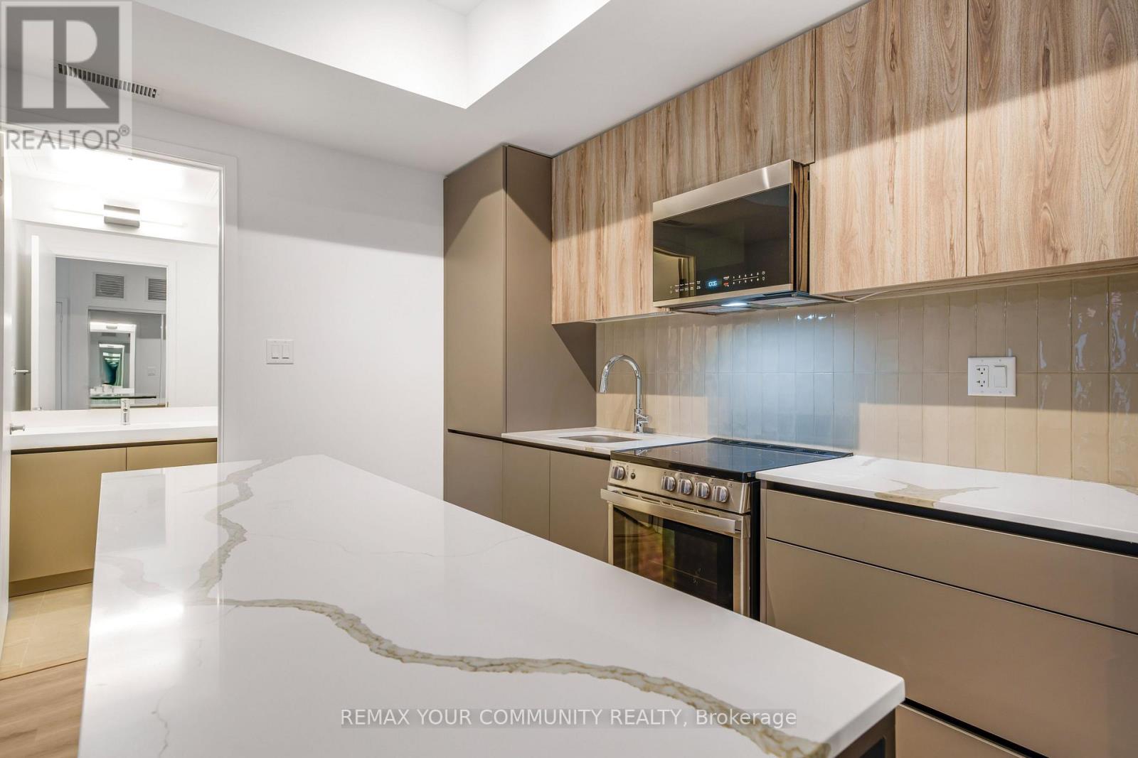 Welcome to this bright suite featuring a well-designed layout filled with natural light and overlooking peaceful green space for added privacy. The open-concept layout and walkout access to a private outdoor space is perfect for relaxing or entertaining. The modern kitchen is equipped with a spacious island, quartz countertops, sleek flat-panel cabinetry, and stainless steel appliances, offering both style and functionality. The generously sized bedroom is bright and inviting, while the full bathroom boasts upgraded finishes, a deep soaker tub, and a stylish vanity with ample storage. Additional features include in-suite laundry, ample storage, and quality finishes throughout. Residents enjoy access to an impressive range of amenities, including a fitness centre, co-working spaces, games and party rooms, social lounge, kids' play area, pet room, guest suite, and beautifully landscaped outdoor areas with BBQ facilities, plus convenient underground visitor parking. An excellent opportunity to enjoy comfortable, modern living in a well-appointed home. (id:64974)