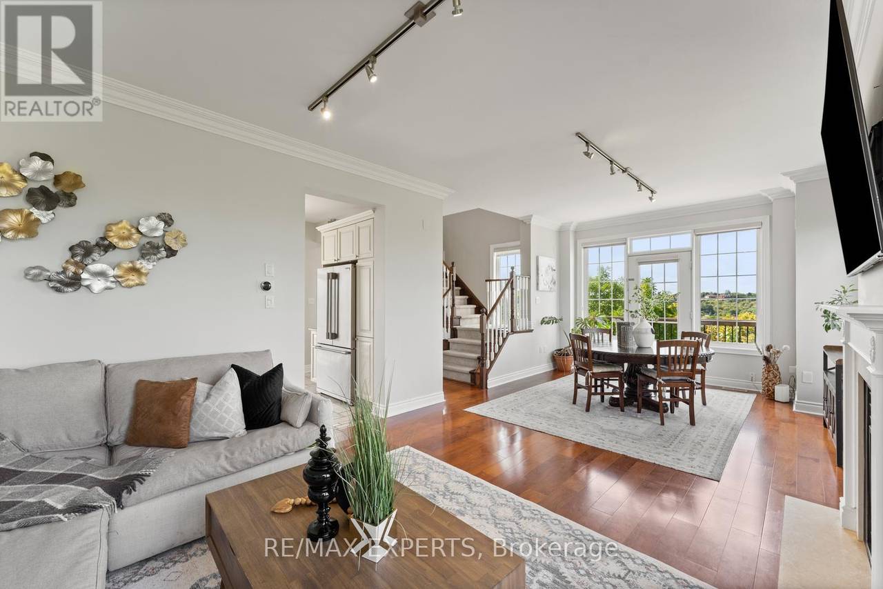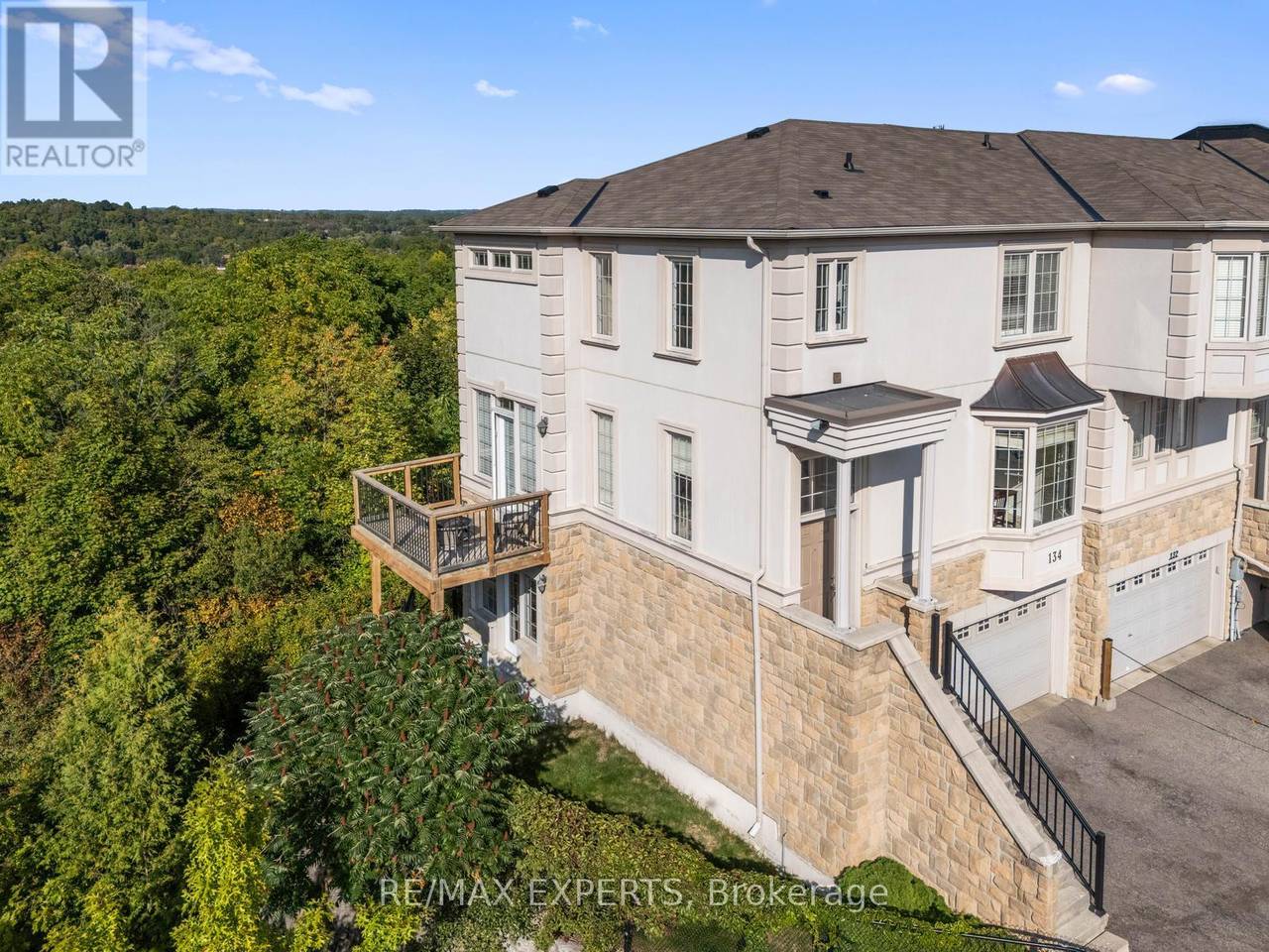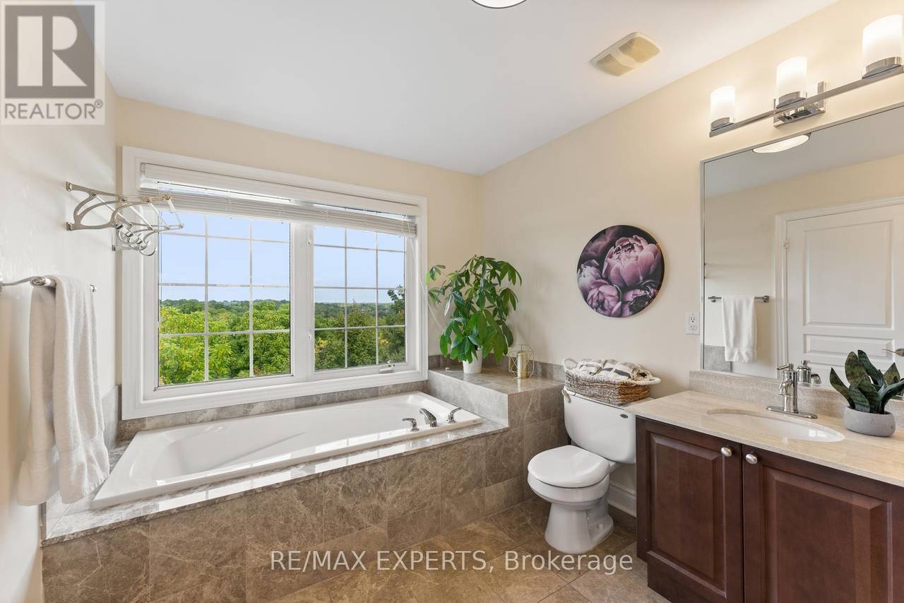 Welcome to 134 Rolling Hills Lane in the exclusive Stoneridge Estates. This 1,950 sq. ft. end-unit freehold townhome sits on a premium ravine lot, offering privacy, stunning sunsets, and the feel of a detached home. The main floor showcases a spacious great room with hardwood floors, crown moulding, and French doors leading to a private balcony with tranquil ravine views. The family-sized kitchen is designed for both everyday living and entertaining, featuring granite counters, stainless steel appliances, a pantry, and ample cabinetry. Upstairs, two generously sized bedrooms each feature their own ensuite bath, plus a convenient second-floor laundry room. The ground-level family room (or optional 3rd bedroom/home office) provides additional living space and direct access to the outdoors. Oversized windows on every level fill the home with natural light, while 9-foot ceilings create an open, airy atmosphere. With a 2-car garage and 2-car driveway, this home perfectly combines luxury and function in one of Caledon's most desirable neighbourhoods.A rare opportunity end units with ravine views like this are hard to find! (id:64974)
