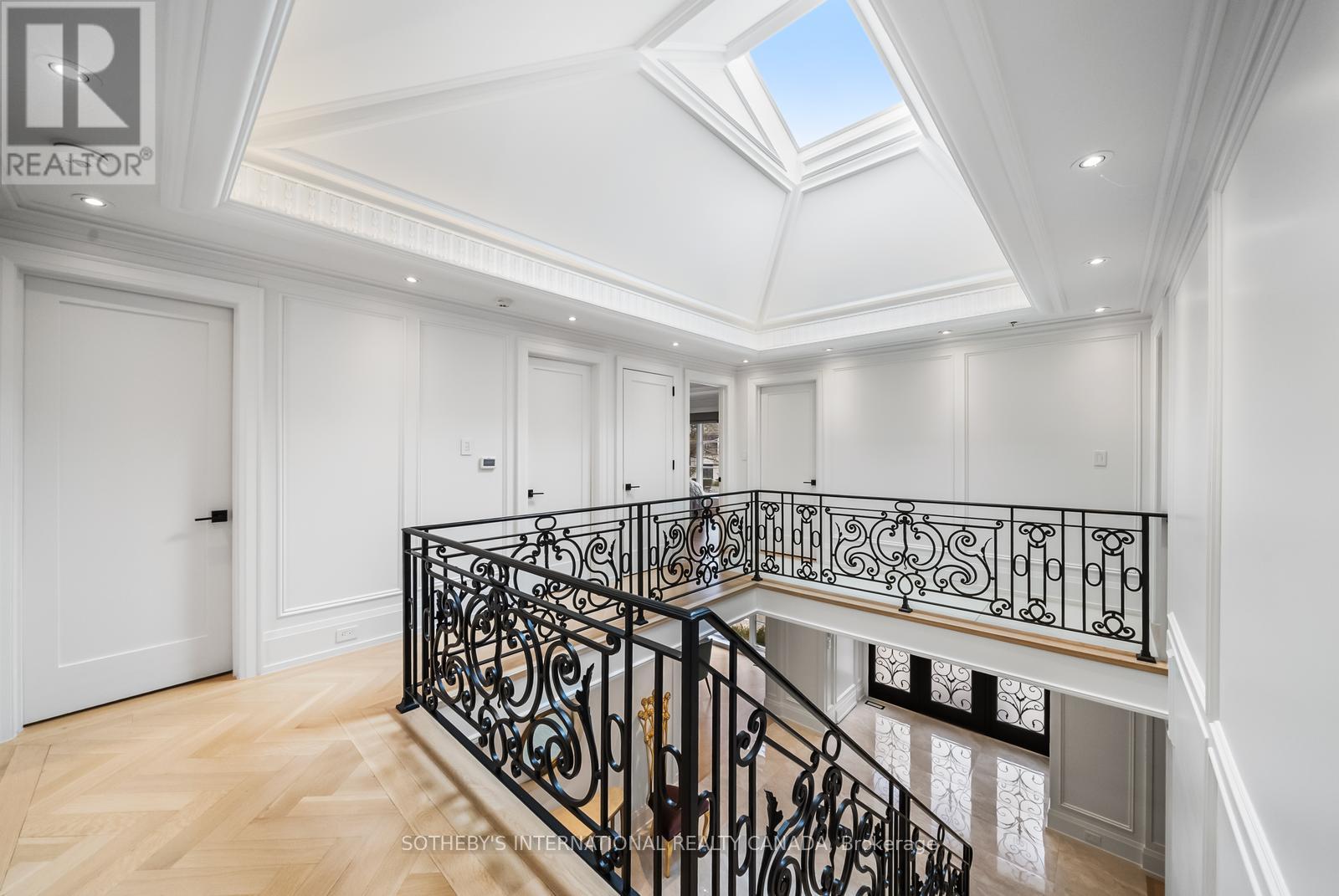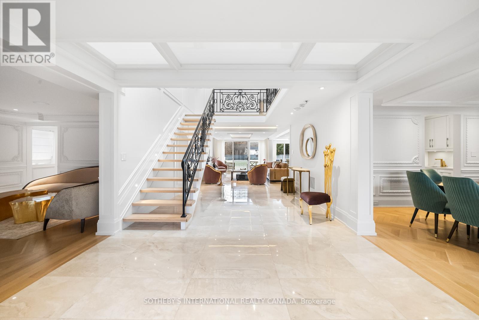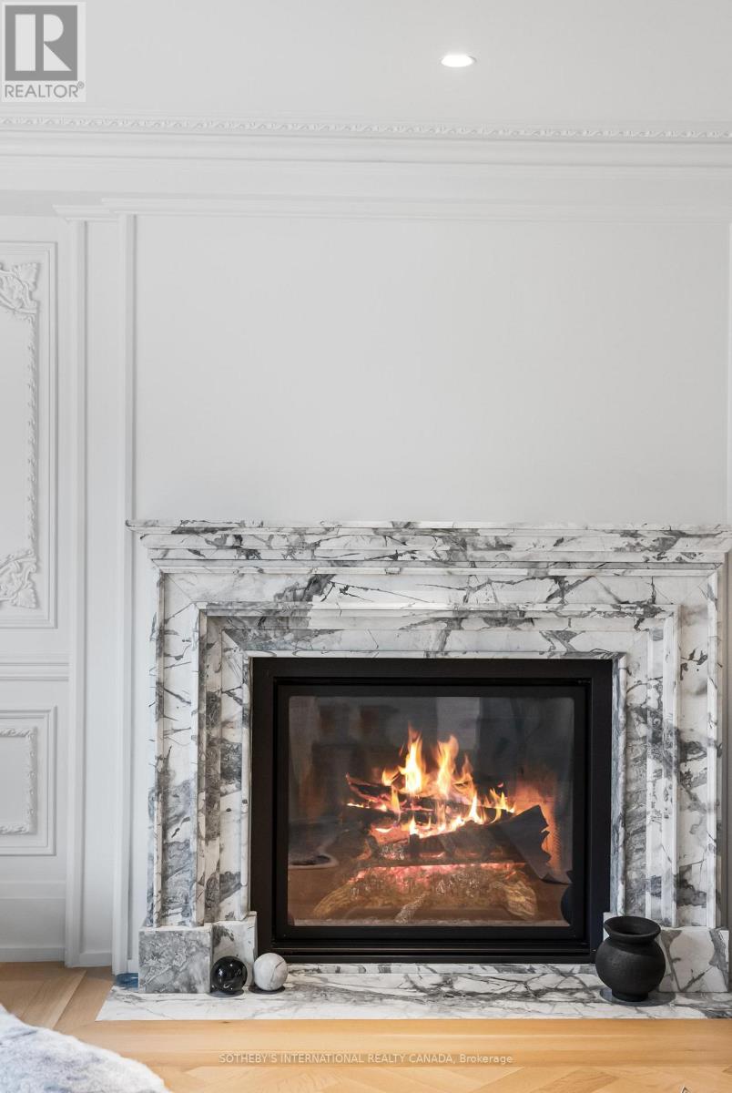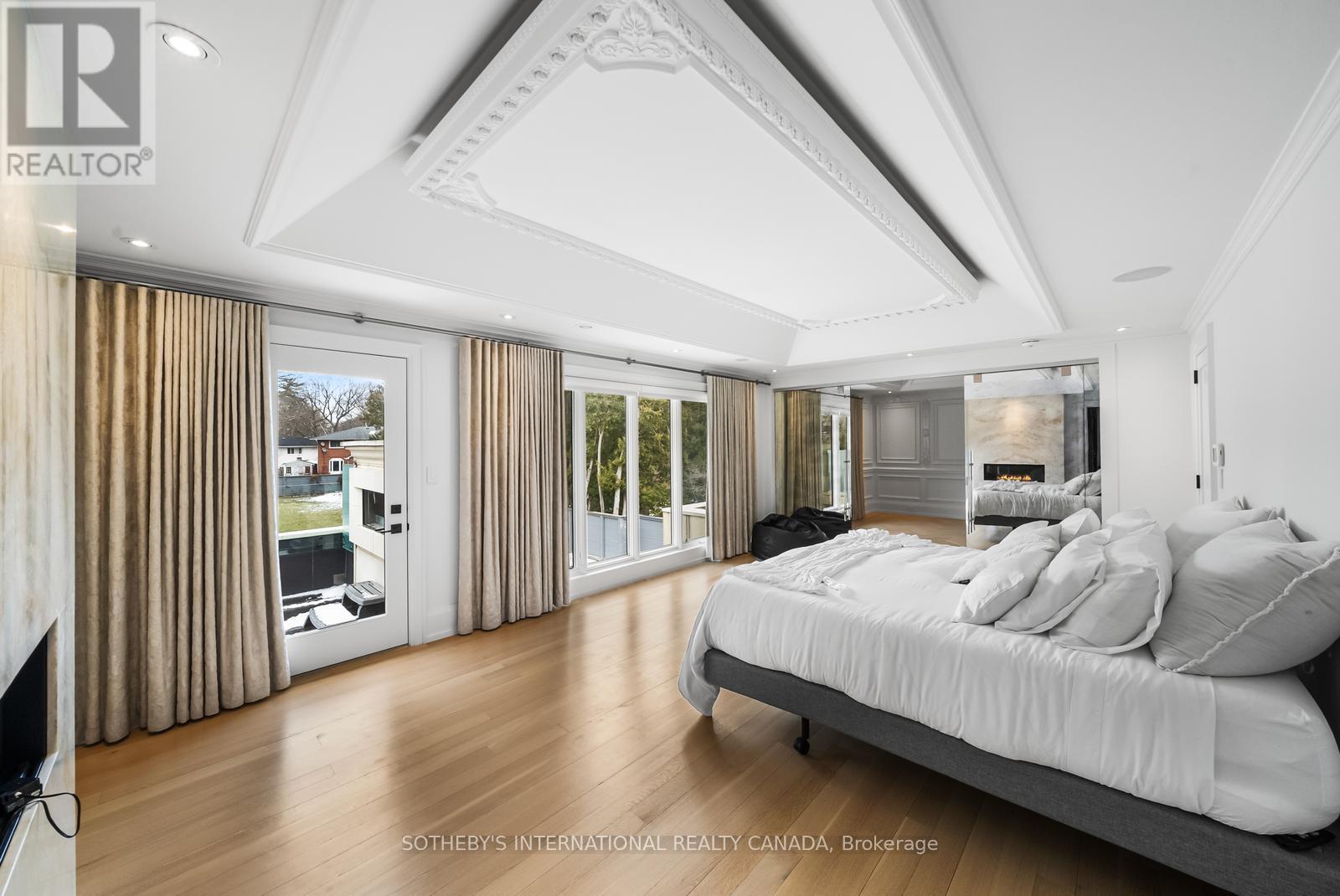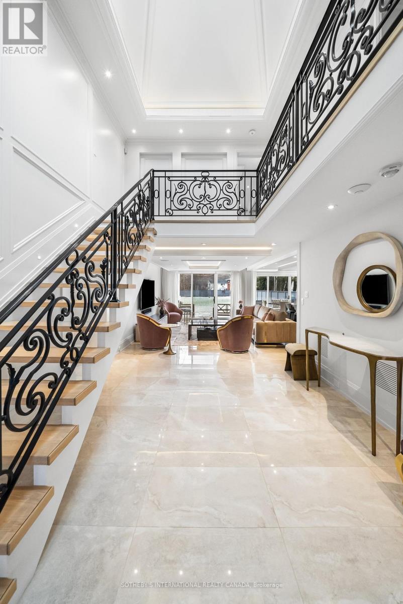 Welcome to this 'exceptional' home. A one-of-a-kind custom-build of the highest standard. The interior rooms are large, bright and spacious with the most 'exquisite' finishes throughout. Every detail to every aspect of every room has been meticulously designed creating an atmosphere of shear luxury and elegance. The large windows, skylights, open-concept, creative lighting and Smart Home System sets an atmosphere of living an upscale lifestyle. The stunning home sits on an expansive lot with a double garage, security gates, circular driveway and fountain as you enter the front yard on a heated stone entry. The private back yard has a heated stone patio and outdoor fireplace and is big enough to accommodate both a swimming pool and tennis court -a rare find! This beautiful home features 3-indoor and 2-outdoor gas fireplaces, gorgeous white oak flooring in the main rooms with heated porcelain floors on all 3 floors, hand-crafted, intricately designed molding are on ceilings and walls throughout; 2 skylights adorn the breakfast room as well as in the tower ceiling in the impressive center foyer. The gourmet kitchen is top of the line with built-in top-of-the line appliances. The primary bedroom hosts an anti-room that can be used as an office or private sitting room, gas fireplace, his-her walk-in closets, exquisite 5-piece ensuite and a walk-out to a private terrace with a fireplace and hot tub overlooking the backyard. There is a 2nd floor office/bedroom and 2 more bedrooms with ensuites. The lower level has a 5th bedroom with ensuite bath, a recreation and games room, fireplace, walk-in, temperature controlled wine closet with built-in cabinetry, a glassed-in exercise room big enough to hold a lot of work out equipment, heated porcelain flooring. There are 2 laundry rooms - one on the 2nd floor and one on the lower level. This home is for a buyer who appreciate exquisite design and looking for a luxurious and comfortable lifestyle. Don't miss it it's the best! (id:64974)