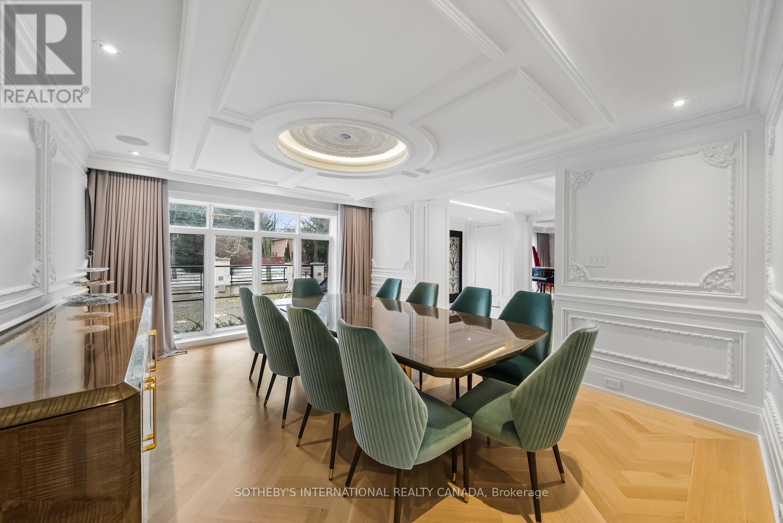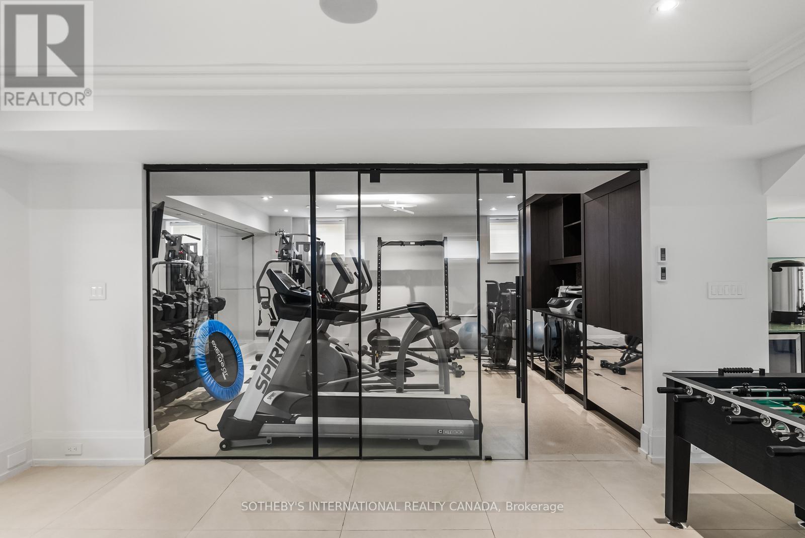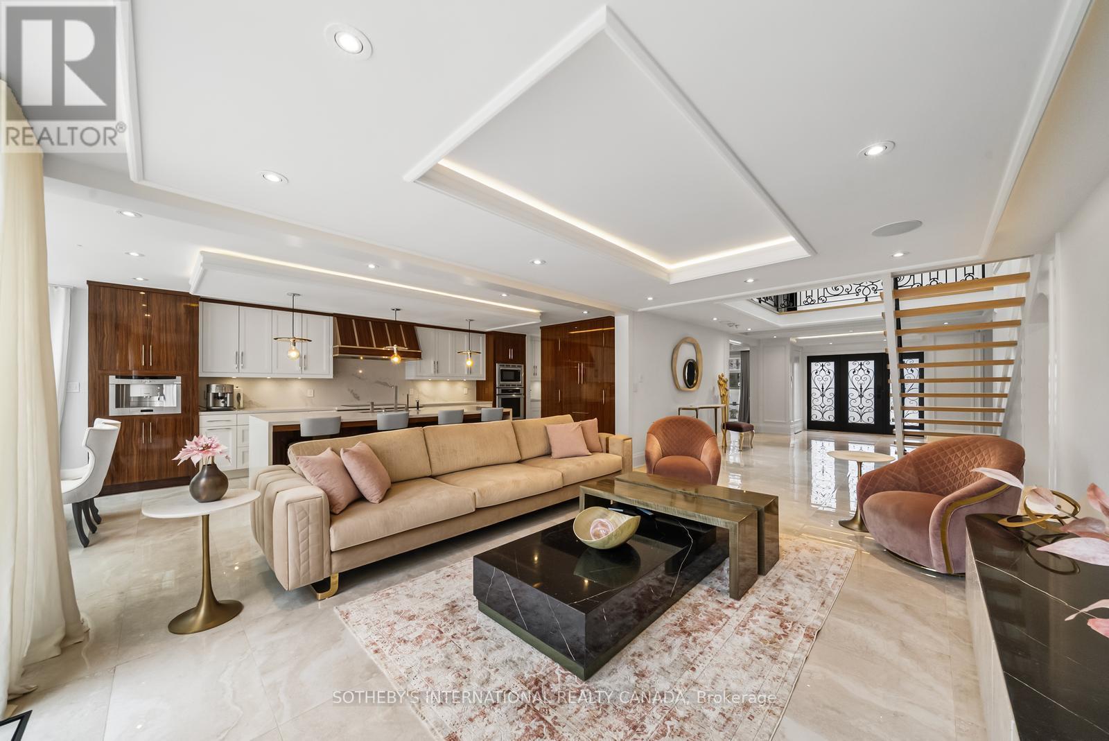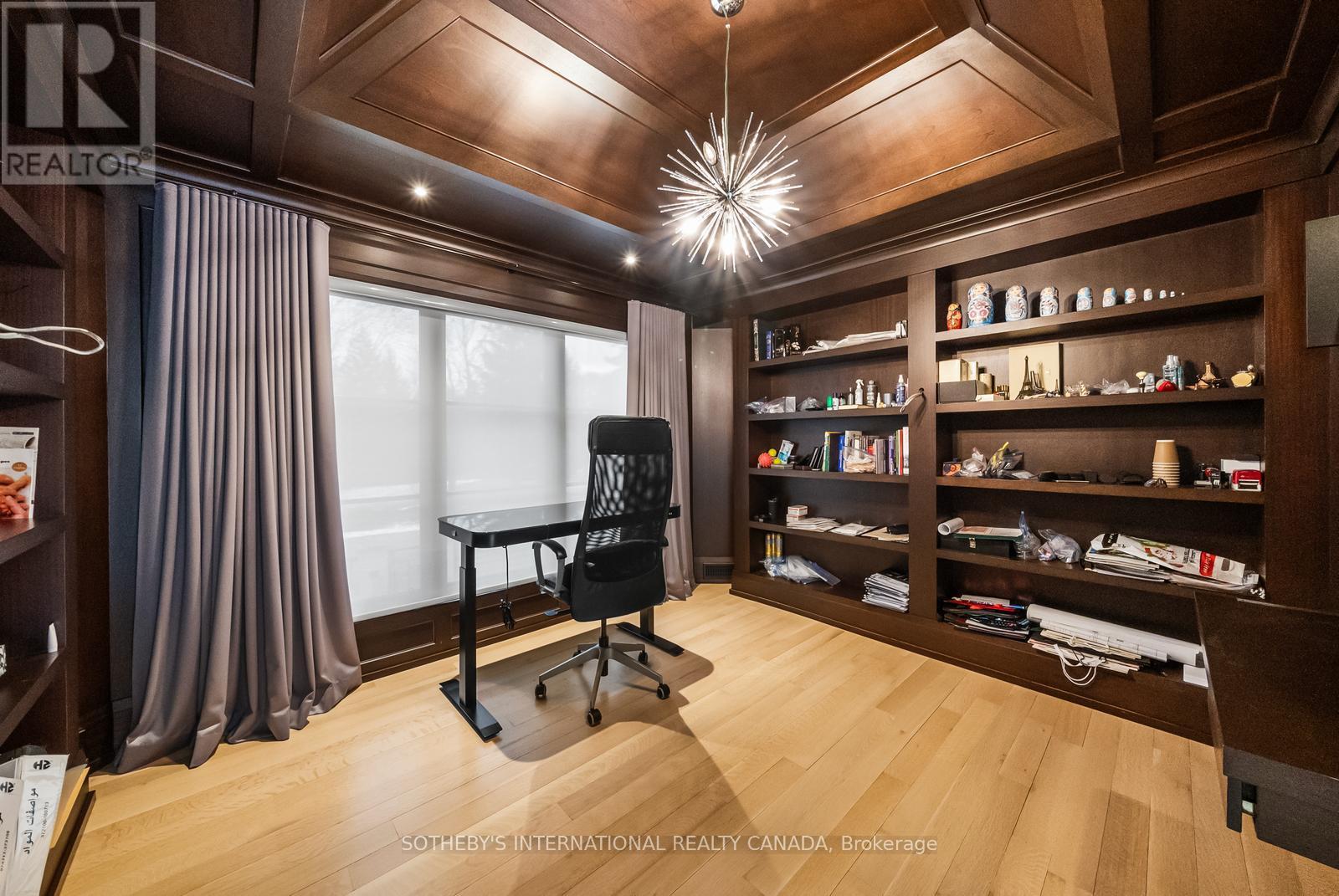Welcome to this 'exceptional' home. A one-of-a-kind custom-build of the highest standard. The interior rooms are large, bright and spacious with the most 'exquisite' finishes throughout. Every detail to every aspect of every room has been meticulously designed creating an atmosphere of shear luxury and elegance. The large windows, skylights, open-concept, creative lighting and Smart Home System sets an atmosphere of living an upscale lifestyle. The stunning home sits on an expansive lot with a double garage, security gates, circular driveway and fountain as you enter the front yard on a heated stone entry. The private back yard has a heated stone patio and outdoor fireplace and is big enough to accommodate both a swimming pool and tennis court -a rare find! This beautiful home features 3-indoor and 2-outdoor gas fireplaces, gorgeous white oak flooring in the main rooms with heated porcelain floors on all 3 floors, hand-crafted, intricately designed molding are on ceilings and walls throughout; 2 skylights adorn the breakfast room as well as in the tower ceiling in the impressive center foyer. The gourmet kitchen is top of the line with built-in top-of-the line appliances. The primary bedroom hosts an anti-room that can be used as an office or private sitting room, gas fireplace, his-her walk-in closets, exquisite 5-piece ensuite and a walk-out to a private terrace with a fireplace and hot tub overlooking the backyard. There is a 2nd floor office/bedroom and 2 more bedrooms with ensuites. The lower level has a 5th bedroom with ensuite bath, a recreation and games room, fireplace, walk-in, temperature controlled wine closet with built-in cabinetry, a glassed-in exercise room big enough to hold a lot of work out equipment, heated porcelain flooring. There are 2 laundry rooms - one on the 2nd floor and one on the lower level. This home is for a buyer who appreciate exquisite design and looking for a luxurious and comfortable lifestyle. Don't miss it it's the best! (id:64974)
