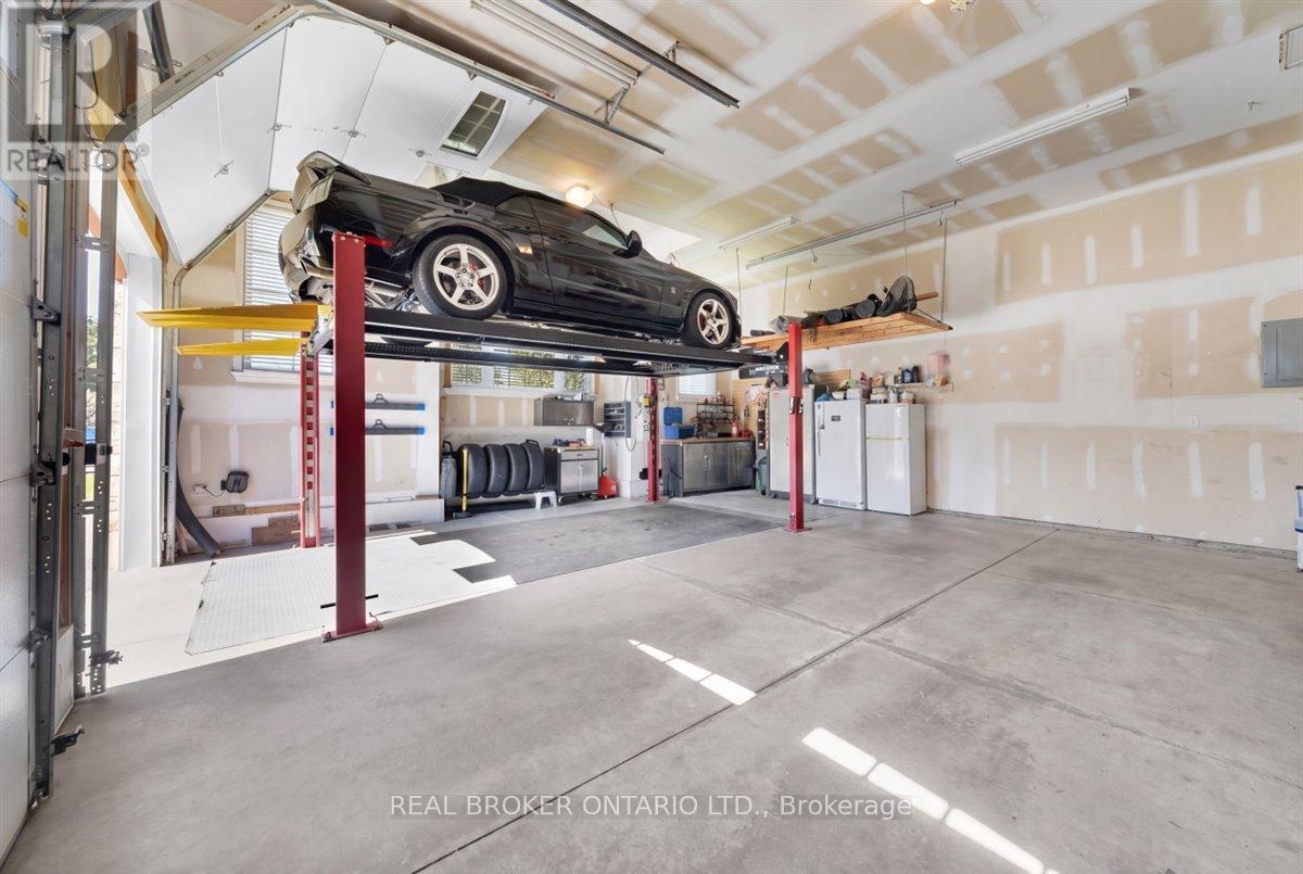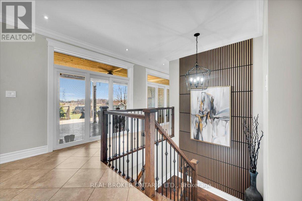 Welcome Home to Refined Country Living! Nestled on over 2 pristine acres with no rear neighbours, this exceptional 2,114 sq. ft. custom bungalow is the home you dream about and never want to leave. Finished to perfection from top to bottom, every detail has been thoughtfully designed for comfort, elegance, and everyday living at its finest. Enjoy the added luxury of radiant heated floors throughout and a reverse osmosis water system. At the heart of the home, a breathtaking open concept kitchen and family room invites you in with stunning cabinetry, an impressive 7x5 ft island with gorgeous quartz counters, and a convenient butler's kitchen/coffee bar. Step out through the walkout to a generous partially covered Trex deck, your private retreat overlooking the beauty of nature in every season. Entertain with ease in the formal dining room, where soaring vaulted ceilings create a sense of grandeur. The primary bedroom is a true sanctuary, complete with a spacious walk-in closet and a spa-inspired ensuite. The finished lower level offers a large rec room, two additional bedrooms, and walkout access to the oversized 3-car garage equipped with a hoist, a dream for any enthusiast or hobbyist. Outside, enjoy the privacy of a fully fenced yard with a garden shed for all your storage needs. With over 2 acres of peace, privacy, and no rear neighbours, this is more than a home. It is the lifestyle you have earned. (id:64974)