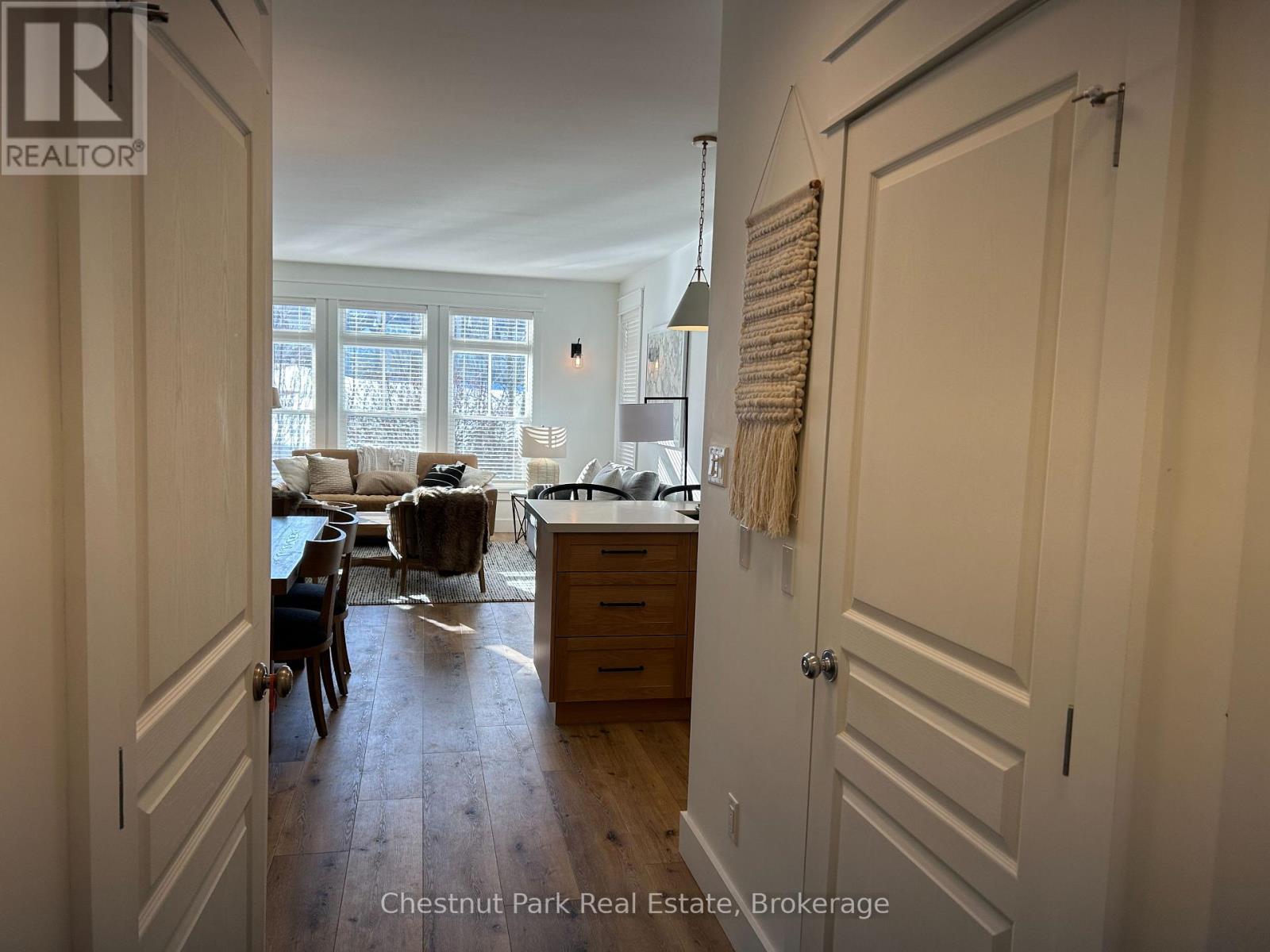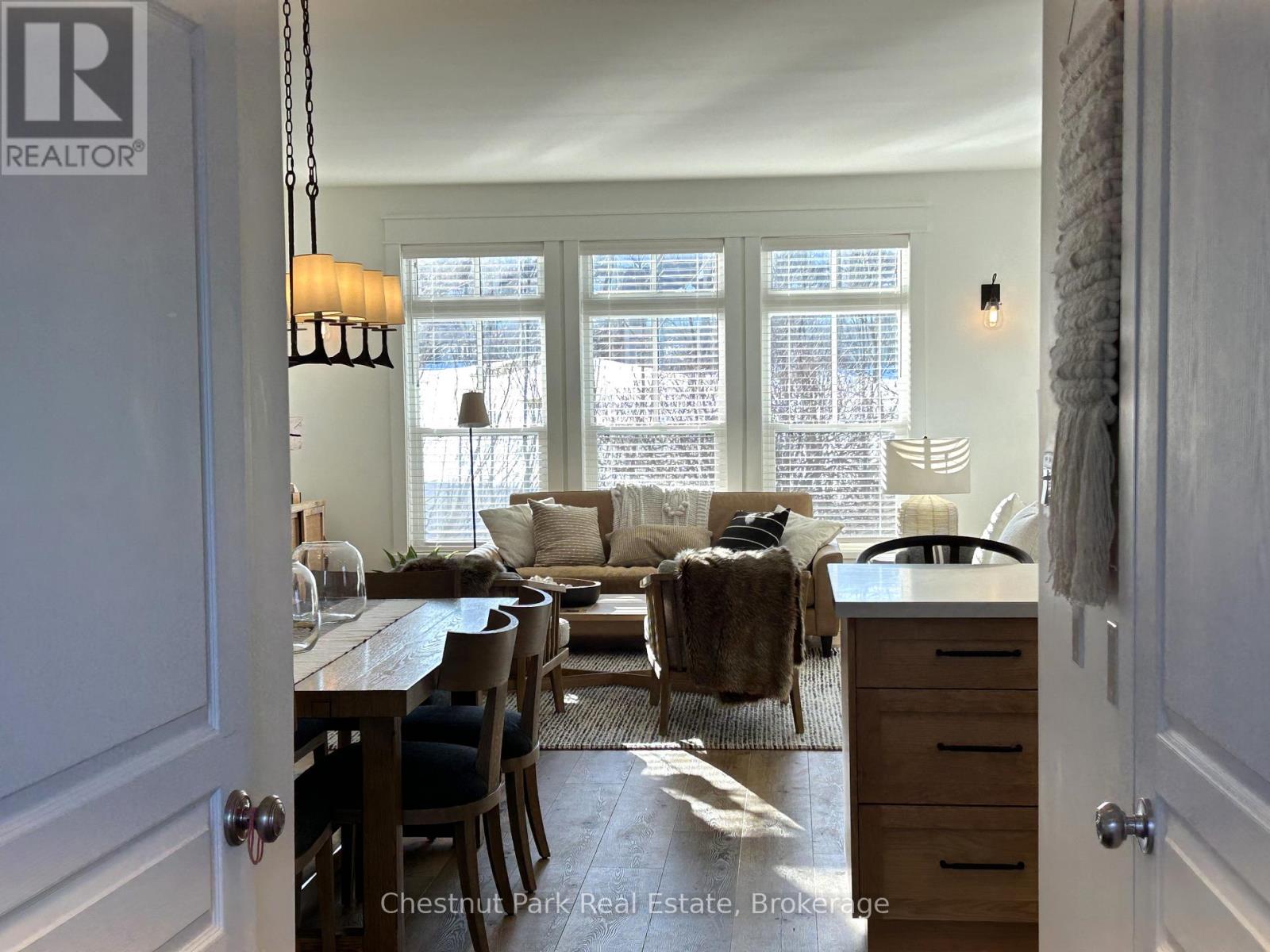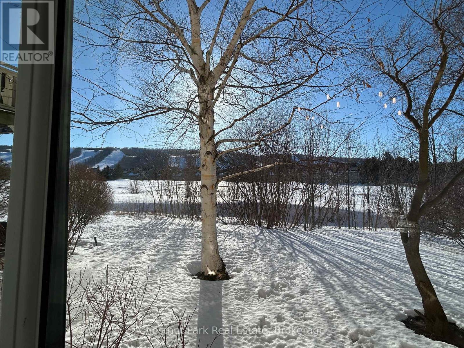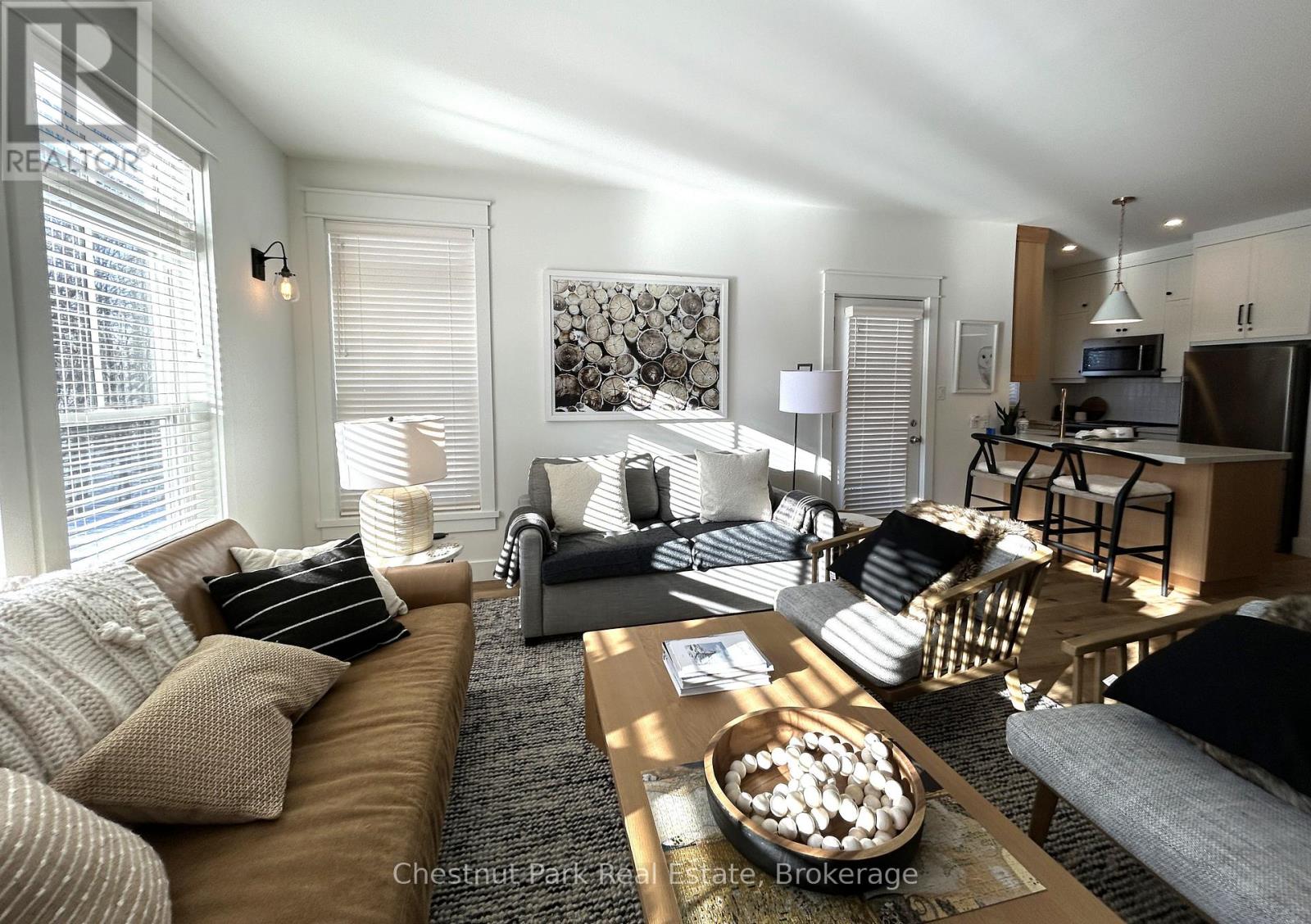 Welcome to Unit 135 in Rivergrass at Blue, a premium unit in an established development due to its prime location along the Monterra Golf Course. Key Features Include 1) End Unit: Ground floor-no stairs - in one of the most private locations offering direct, year-round views of the ski hills and the golf course. 2) Unmatched Privacy: Located at building's edge, it is surrounded by mature landscaping and trees. Unlike many other units, it does not look out onto a parking lot; its side patio faces nature directly. 3) Exceptional Views: A plethora of windows with direct views of ski hills year-round alongside panoramic golf course vistas. Enjoy the ski hill night lights, seasonal fireworks from the Events Plaza. 4) Professional Interior Design: Exquisite furnishing and decoration, including selections from Restoration Hardware. The open concept is further enhanced by luxury vinyl flooring, upgraded kitchen with high-quality cabinetry, and two fully renovated bathrooms. Both bedrooms are equipped with king-size beds, ample closet space, plus pull out in living room providing accommodation for up to 6 and catering to high-end comfort for owners and guests. 5) Investment Potential: While currently maintained as a personally cared-for, non-rented property, Rivergrass allows for Short Term Accommodation (STA), providing significant revenue potential for investors. 6) Year-Round Recreation: The development includes a seasonal outdoor swimming pool and a year-round hot tub with scenic views of the escarpment and 18th hole of Monterra Golf. 7) Convenience & Access: Complimentary shuttle service available to transport residents and guests to the Village or to the Blue Mountain Private Beach. On site is a dedicated ski and bike tuning room for active enthusiasts. Situated just a short walk from the core of Blue Mountain Village, providing easy access to dining, shopping and entertainment. HST may be applicable. 1% BMVA Entry Fee on closing. Annual fees $0.28/sq.ft. (id:64974)
