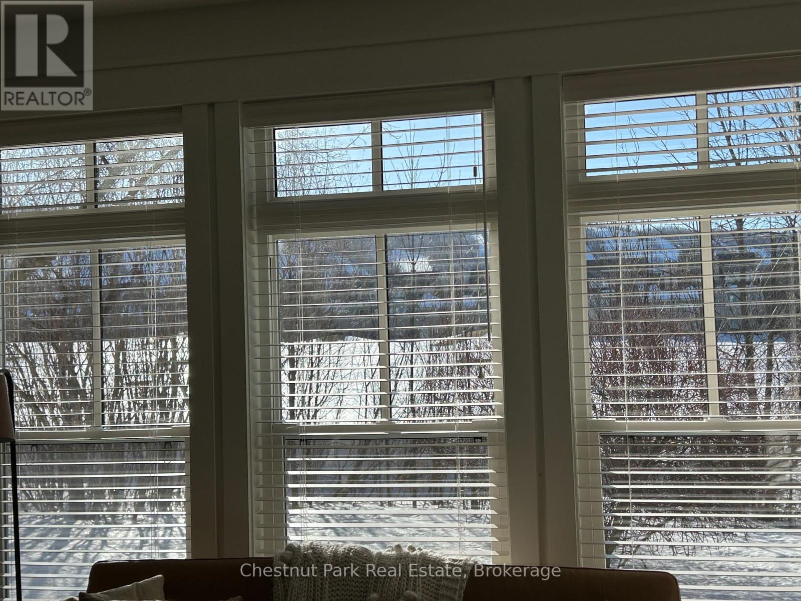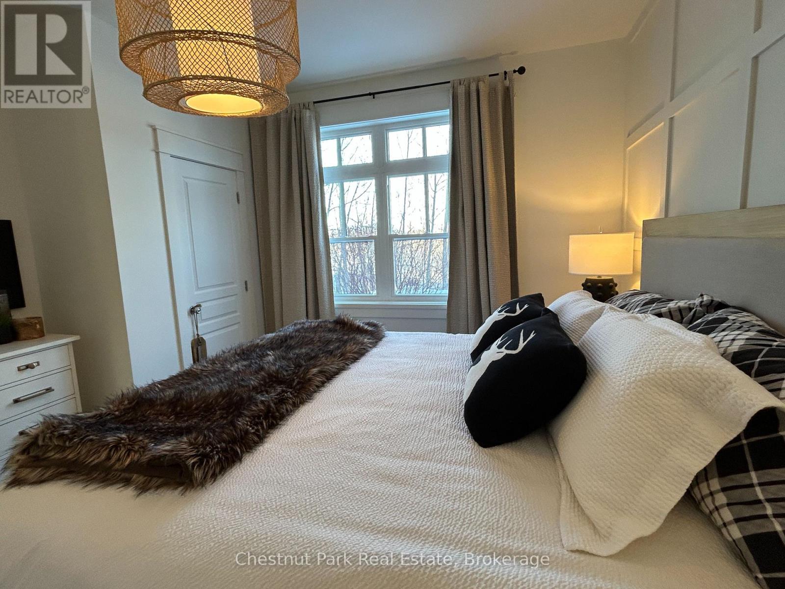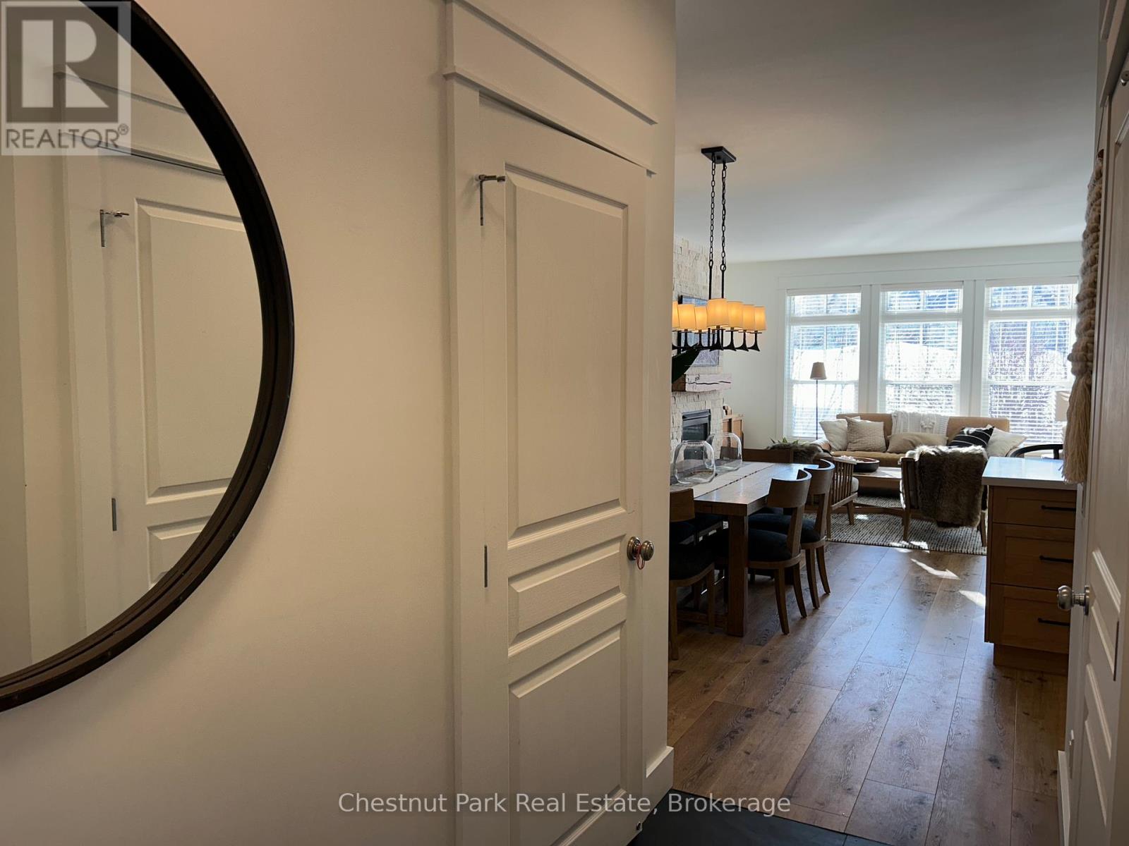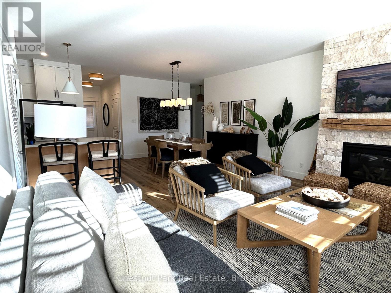 Welcome to Unit 135 in Rivergrass at Blue, a premium unit in an established development due to its prime location along the Monterra Golf Course. Key Features Include 1) End Unit: Ground floor-no stairs - in one of the most private locations offering direct, year-round views of the ski hills and the golf course. 2) Unmatched Privacy: Located at building's edge, it is surrounded by mature landscaping and trees. Unlike many other units, it does not look out onto a parking lot; its side patio faces nature directly. 3) Exceptional Views: A plethora of windows with direct views of ski hills year-round alongside panoramic golf course vistas. Enjoy the ski hill night lights, seasonal fireworks from the Events Plaza. 4) Professional Interior Design: Exquisite furnishing and decoration, including selections from Restoration Hardware. The open concept is further enhanced by luxury vinyl flooring, upgraded kitchen with high-quality cabinetry, and two fully renovated bathrooms. Both bedrooms are equipped with king-size beds, ample closet space, plus pull out in living room providing accommodation for up to 6 and catering to high-end comfort for owners and guests. 5) Investment Potential: While currently maintained as a personally cared-for, non-rented property, Rivergrass allows for Short Term Accommodation (STA), providing significant revenue potential for investors. 6) Year-Round Recreation: The development includes a seasonal outdoor swimming pool and a year-round hot tub with scenic views of the escarpment and 18th hole of Monterra Golf. 7) Convenience & Access: Complimentary shuttle service available to transport residents and guests to the Village or to the Blue Mountain Private Beach. On site is a dedicated ski and bike tuning room for active enthusiasts. Situated just a short walk from the core of Blue Mountain Village, providing easy access to dining, shopping and entertainment. HST may be applicable. 1% BMVA Entry Fee on closing. Annual fees $0.28/sq.ft. (id:64974)