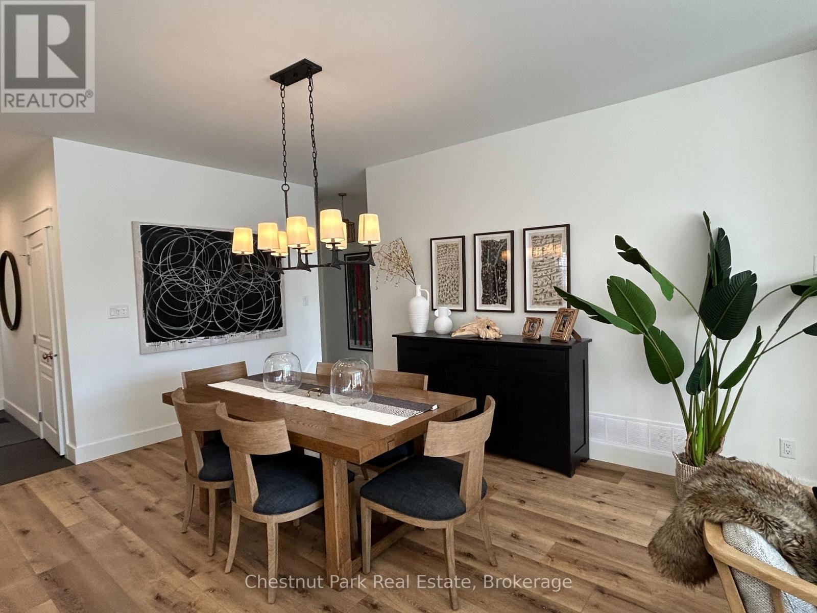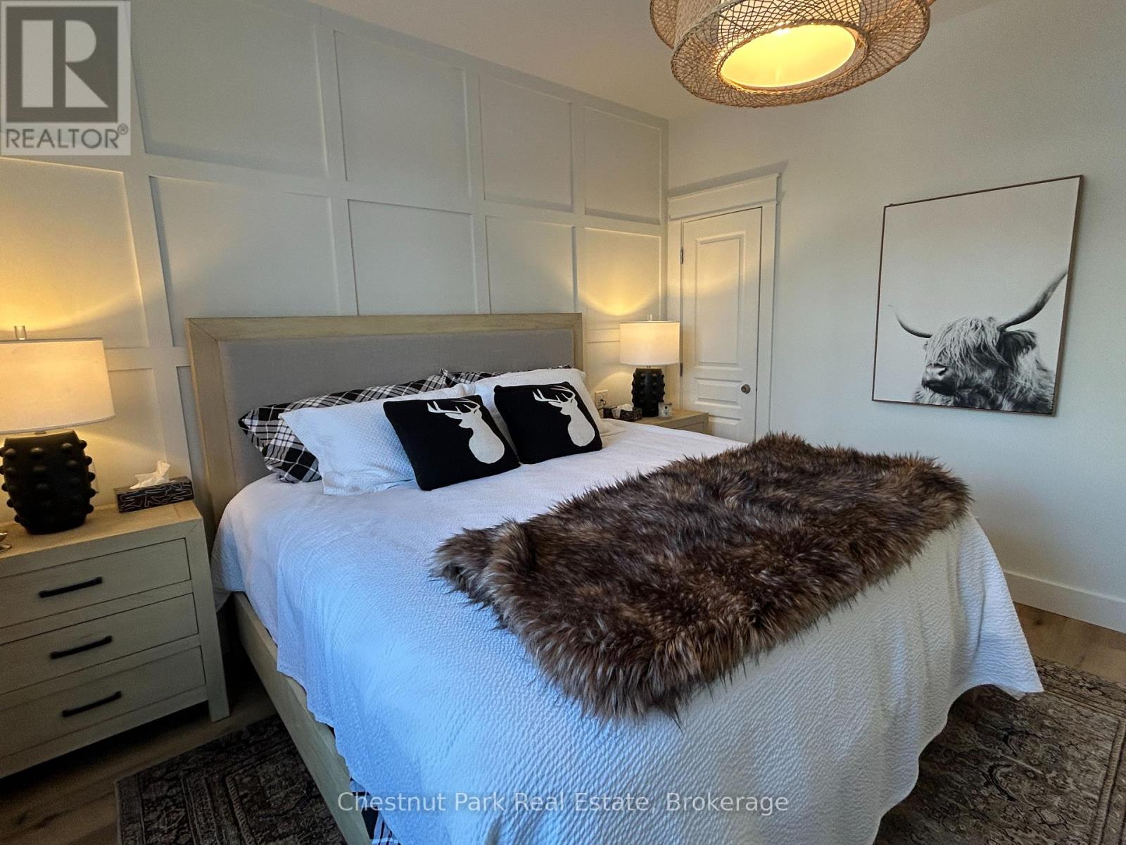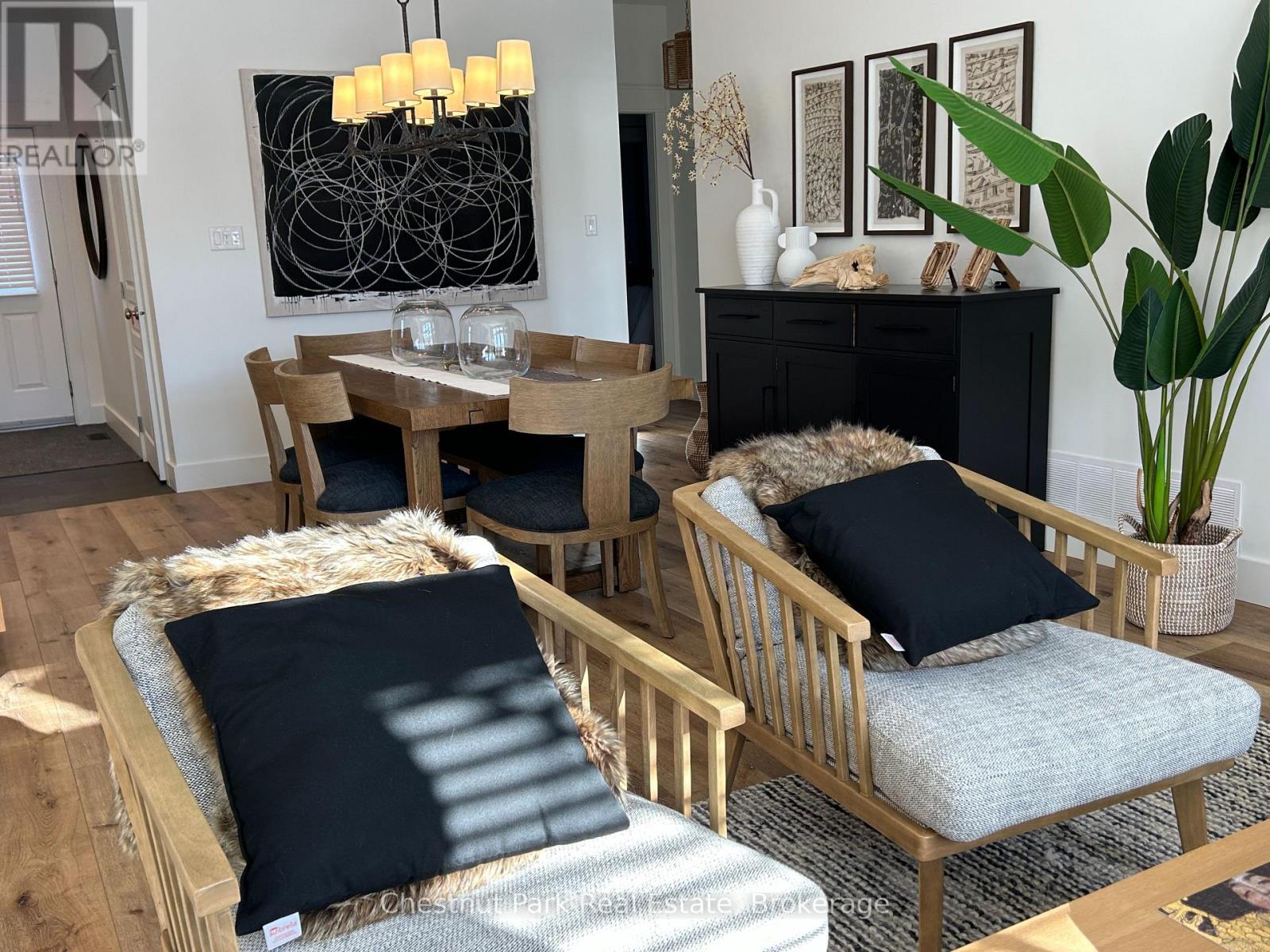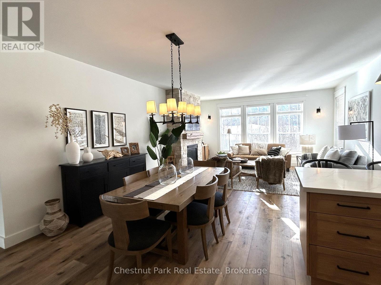 Welcome to Unit 135 in Rivergrass at Blue, a premium unit in an established development due to its prime location along the Monterra Golf Course. Key Features Include 1) End Unit: Ground floor-no stairs - in one of the most private locations offering direct, year-round views of the ski hills and the golf course. 2) Unmatched Privacy: Located at building's edge, it is surrounded by mature landscaping and trees. Unlike many other units, it does not look out onto a parking lot; its side patio faces nature directly. 3) Exceptional Views: A plethora of windows with direct views of ski hills year-round alongside panoramic golf course vistas. Enjoy the ski hill night lights, seasonal fireworks from the Events Plaza. 4) Professional Interior Design: Exquisite furnishing and decoration, including selections from Restoration Hardware. The open concept is further enhanced by luxury vinyl flooring, upgraded kitchen with high-quality cabinetry, and two fully renovated bathrooms. Both bedrooms are equipped with king-size beds, ample closet space, plus pull out in living room providing accommodation for up to 6 and catering to high-end comfort for owners and guests. 5) Investment Potential: While currently maintained as a personally cared-for, non-rented property, Rivergrass allows for Short Term Accommodation (STA), providing significant revenue potential for investors. 6) Year-Round Recreation: The development includes a seasonal outdoor swimming pool and a year-round hot tub with scenic views of the escarpment and 18th hole of Monterra Golf. 7) Convenience & Access: Complimentary shuttle service available to transport residents and guests to the Village or to the Blue Mountain Private Beach. On site is a dedicated ski and bike tuning room for active enthusiasts. Situated just a short walk from the core of Blue Mountain Village, providing easy access to dining, shopping and entertainment. HST may be applicable. 1% BMVA Entry Fee on closing. Annual fees $0.28/sq.ft. (id:64974)