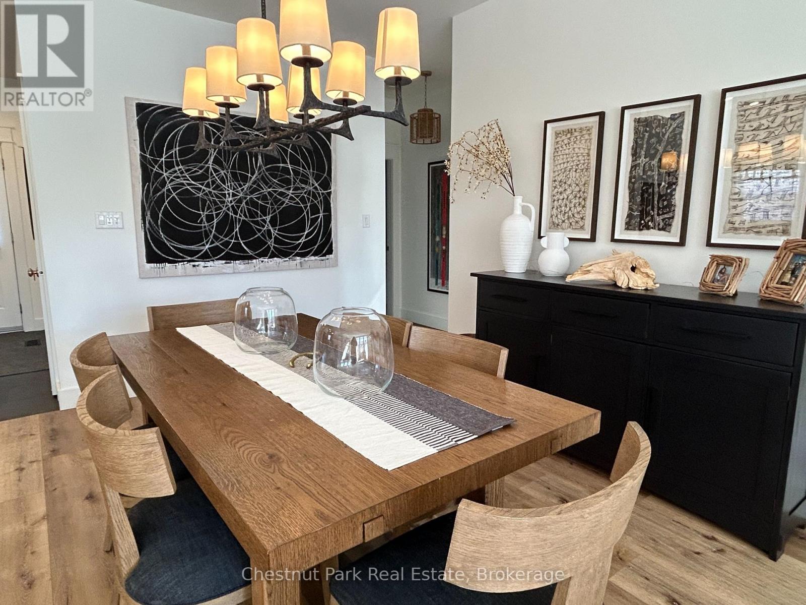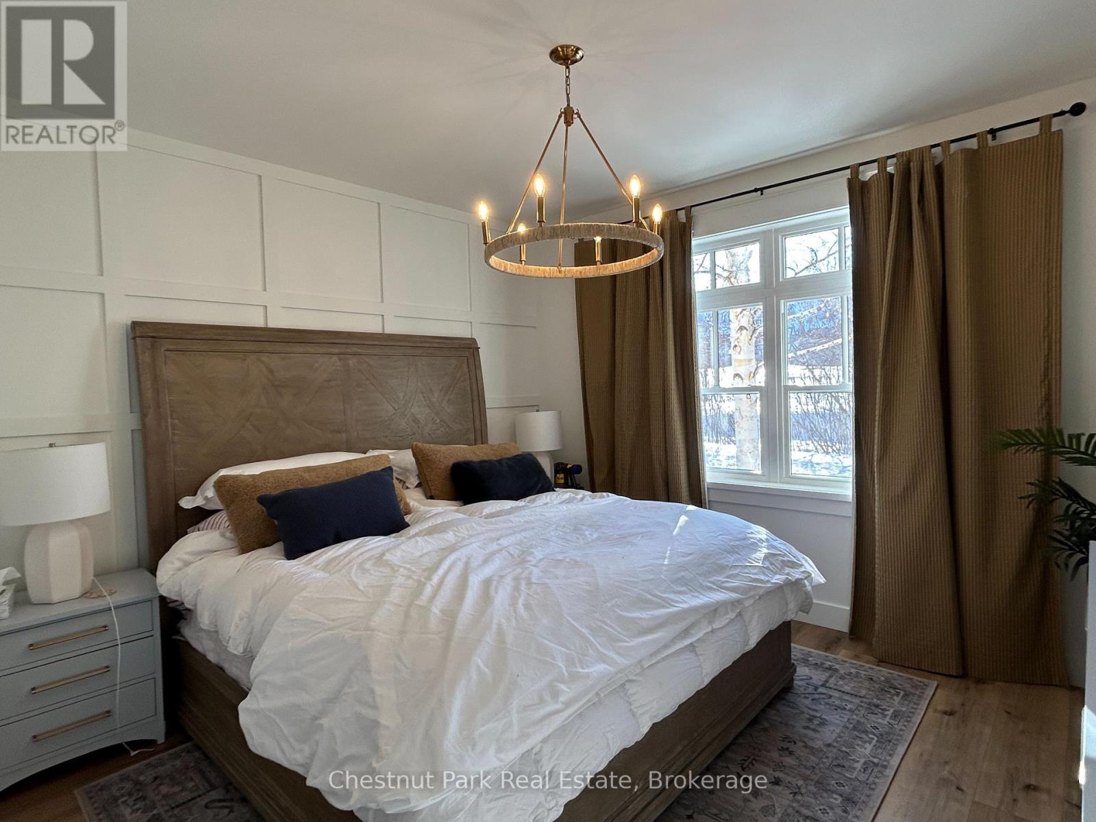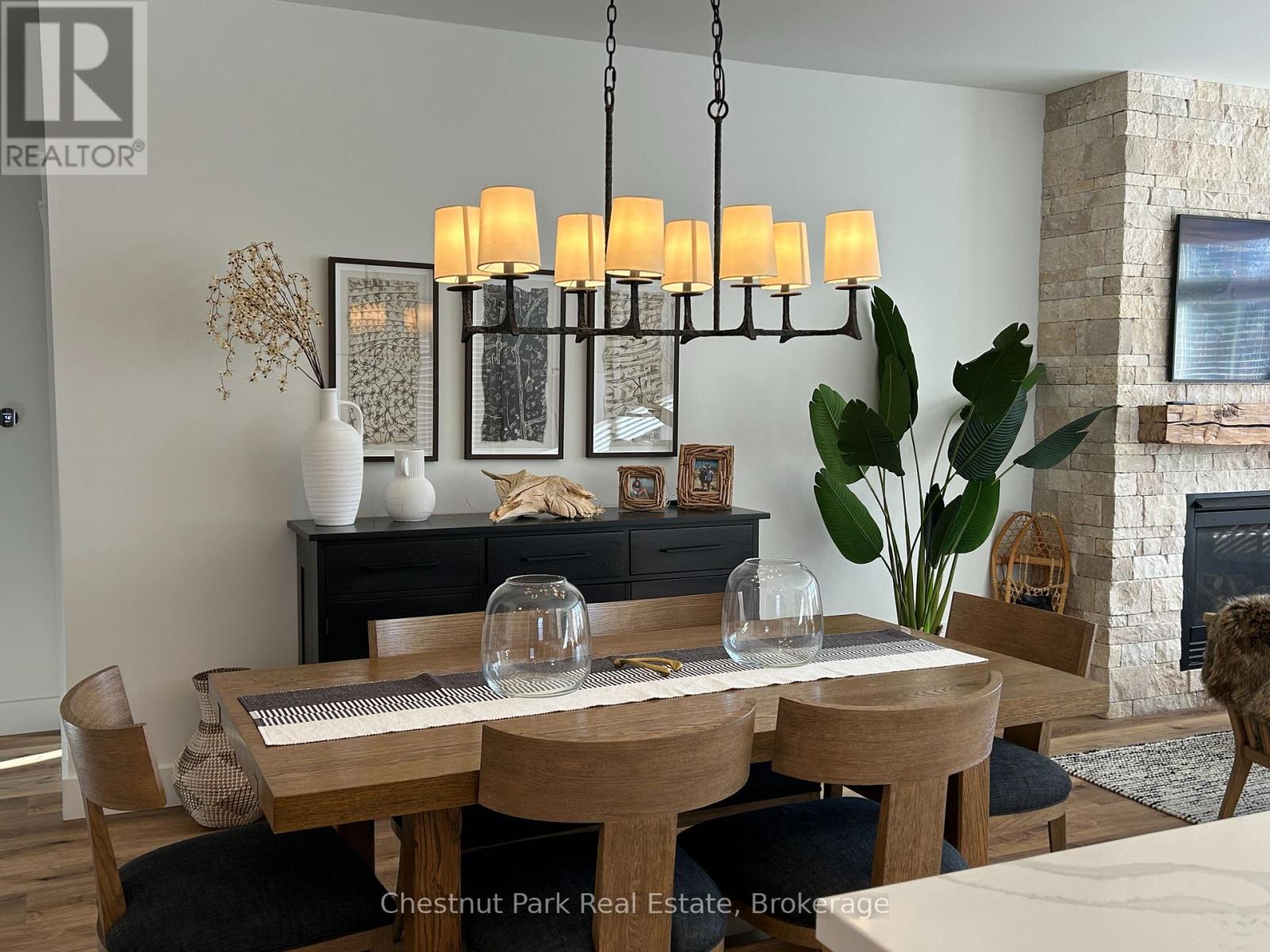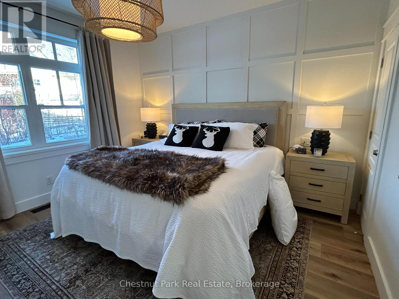 Welcome to Unit 135 in Rivergrass at Blue, a premium unit in an established development due to its prime location along the Monterra Golf Course. Key Features Include 1) End Unit: Ground floor-no stairs - in one of the most private locations offering direct, year-round views of the ski hills and the golf course. 2) Unmatched Privacy: Located at building's edge, it is surrounded by mature landscaping and trees. Unlike many other units, it does not look out onto a parking lot; its side patio faces nature directly. 3) Exceptional Views: A plethora of windows with direct views of ski hills year-round alongside panoramic golf course vistas. Enjoy the ski hill night lights, seasonal fireworks from the Events Plaza. 4) Professional Interior Design: Exquisite furnishing and decoration, including selections from Restoration Hardware. The open concept is further enhanced by luxury vinyl flooring, upgraded kitchen with high-quality cabinetry, and two fully renovated bathrooms. Both bedrooms are equipped with king-size beds, ample closet space, plus pull out in living room providing accommodation for up to 6 and catering to high-end comfort for owners and guests. 5) Investment Potential: While currently maintained as a personally cared-for, non-rented property, Rivergrass allows for Short Term Accommodation (STA), providing significant revenue potential for investors. 6) Year-Round Recreation: The development includes a seasonal outdoor swimming pool and a year-round hot tub with scenic views of the escarpment and 18th hole of Monterra Golf. 7) Convenience & Access: Complimentary shuttle service available to transport residents and guests to the Village or to the Blue Mountain Private Beach. On site is a dedicated ski and bike tuning room for active enthusiasts. Situated just a short walk from the core of Blue Mountain Village, providing easy access to dining, shopping and entertainment. HST may be applicable. 1% BMVA Entry Fee on closing. Annual fees $0.28/sq.ft. (id:64974)