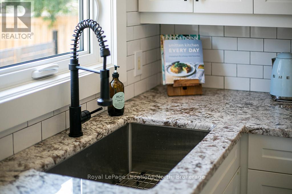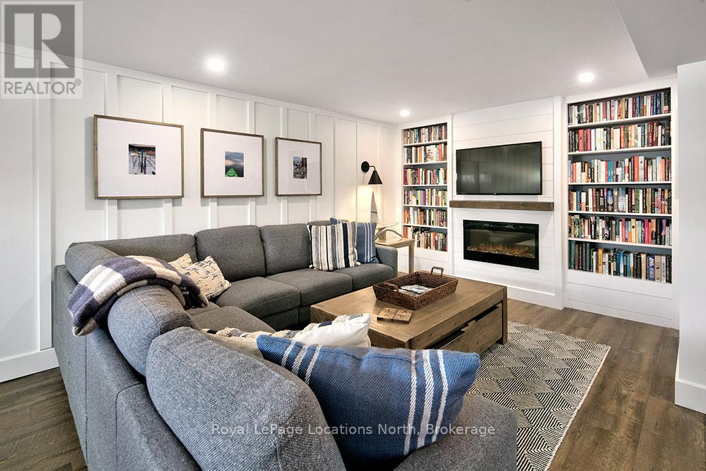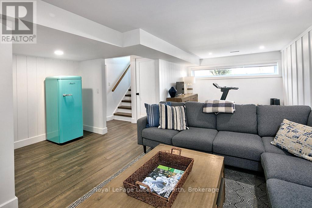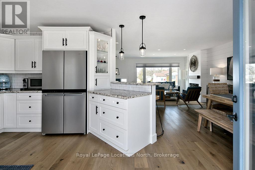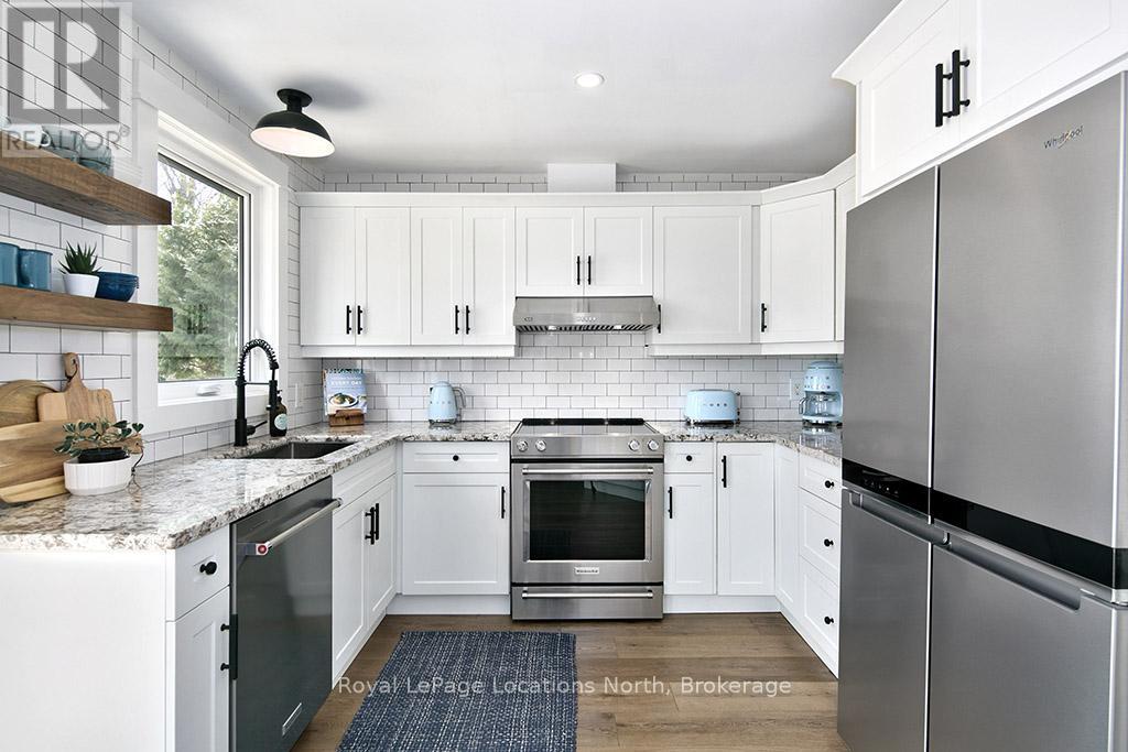 You can't put a price on the feeling this house gives you - warm, considered, and alive with personality. Completely reimagined from top to bottom, this raised bungalow gem sits on a generous 60 x 140 ft lot in one of Thornbury's most beloved in-town neighbourhoods - and there is simply nothing else like it on the market. ~1,900 sq ft of beautifully executed living space, 3 bedrooms on the main level (one used as office) plus 2 additional bedrooms, 4 piece bath recreation living room in a fully finished lower level. Perfect for full-time families, ski crews, downsizers, or professional couples-- your search is over! Every inch lovingly renovated: all new windows , new siding with exterior insulation (Van Dolders), engineered hardwood main level, luxury vinyl plank lower, custom kitchen with granite counters and new appliances, updated bathrooms with new vanities, tile, shower and tub(lower level), all new trim, doors and fixtures, wainscotting, magnificent shiplap accent walls, & 2 electric fireplaces one on each level.The backyard is where the magic really happens - cozy fire pit, hot tub, large patio, fully fenced back yard with back gate, & lush landscaping front and back. All on an incredible 60 x 140 ft lot. Big mechanicals done: Trane furnace (2019), metal roof (2019).Short drive to ski hills, golf courses in the Blue Mountains, steps to trails, parks, marina & Georgian Bay. Walkable to school, library, downtown restaurants and shops. Move in, unpack, exhale. (id:64974)