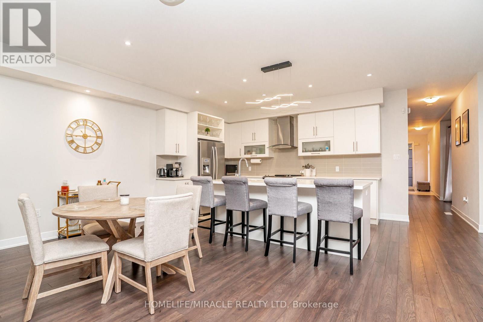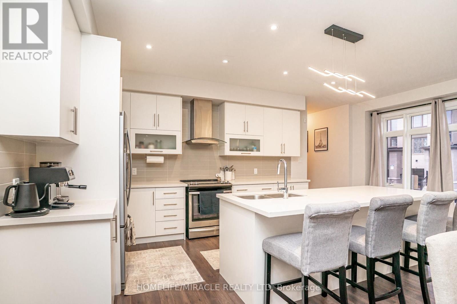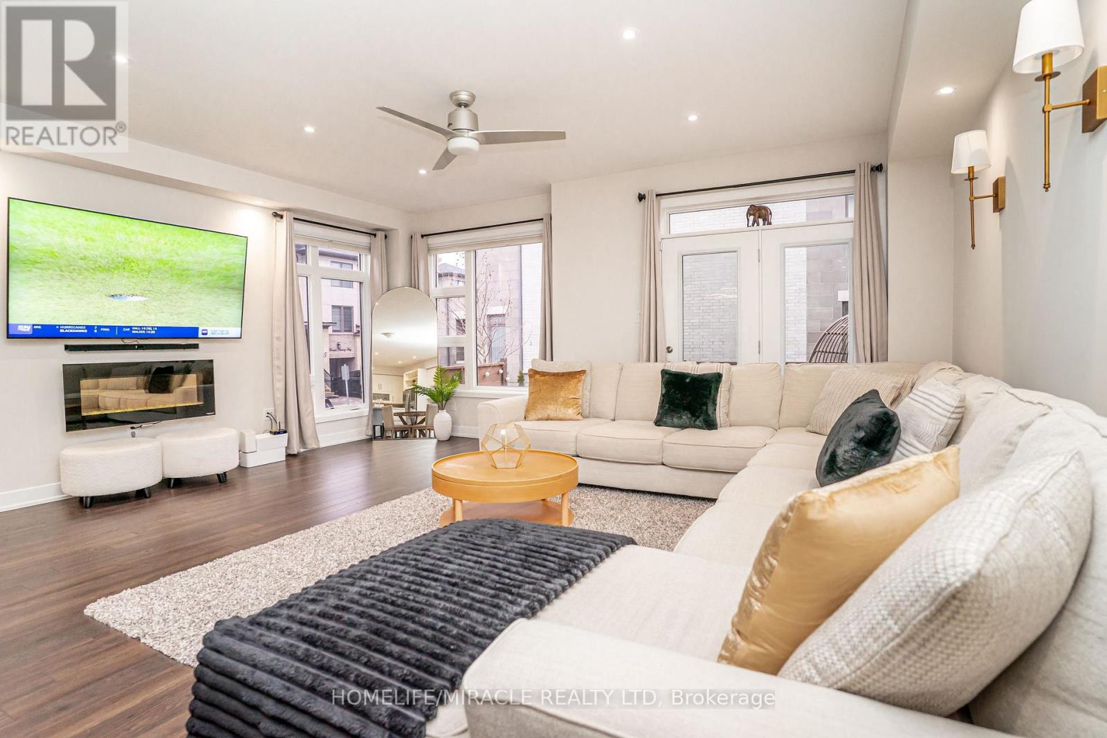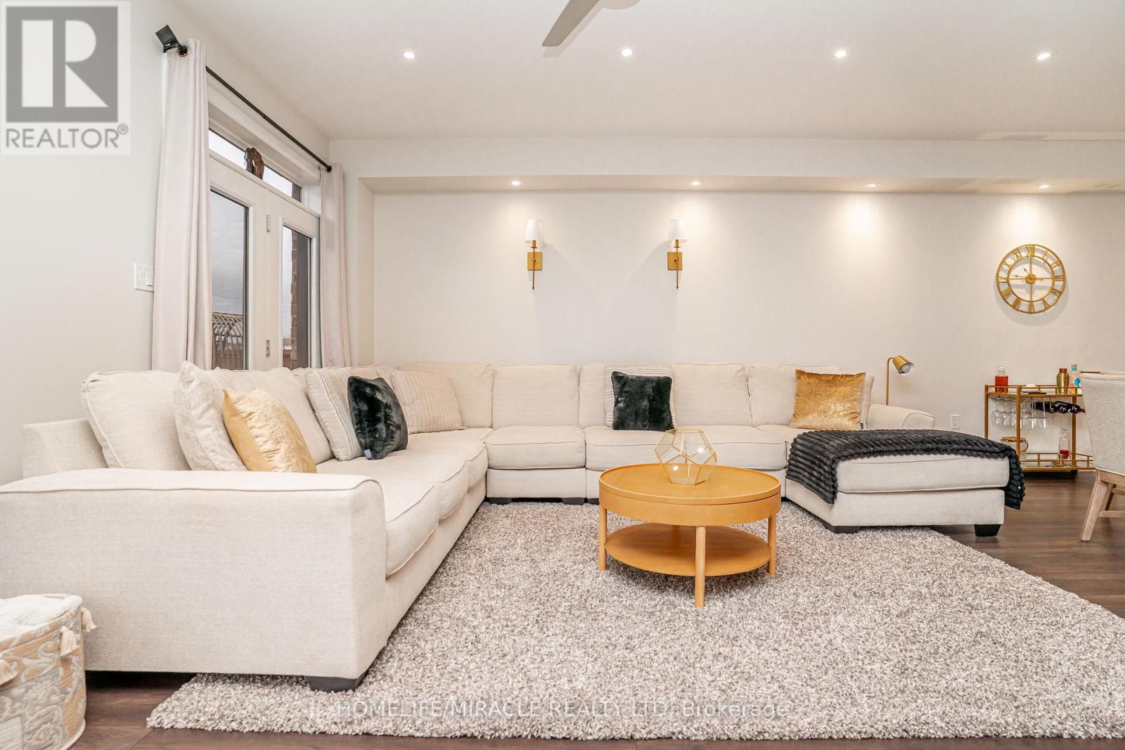 Welcome to this stunning, modern end-unit Condo Townhouse a true showpiece offering over 2,250 sf of luxurious open concept living space, with more than $120K in premium upgrades throughout. This exceptional 2 Story home features 3 spacious bedrooms, a versatile media/entertainment room and a beautifully finished in-law suite complete with its own Kitchen, Bedroom, Washroom, Living with Dining areas and a private laundry ideal for extended family or excellent income potential.The main level showcases gleaming laminate flooring, a chef inspired Kitchen with high end Stainless Steel appliances, elegant backsplash and a custom island perfect for entertaining. Large windows fill the space with lots of natural light, complemented by pot lights and an elegant and stylish electric fireplace.Walk out to a spectacular two-tier deck perfect for outdoor entertaining and relaxing.Upstairs you'll find three generously sized bedrooms, including a luxurious primary suite with a spa-like ensuite. A Flexible media room offers the ideal space for a home office or additional lounge. Enjoy the convenience of second floor laundry.This beautiful corner unit is located in a highly desirable neighborhood and features smooth ceilings throughout main floor, with convenient visitor parking right at your doorstep. Ideally situated close to Highways 401, 407and 412 as well as the Go Station, shopping, schools, public transit, and scenic trails offering both comfort and convenience with everything you need just minute away. (id:64974)