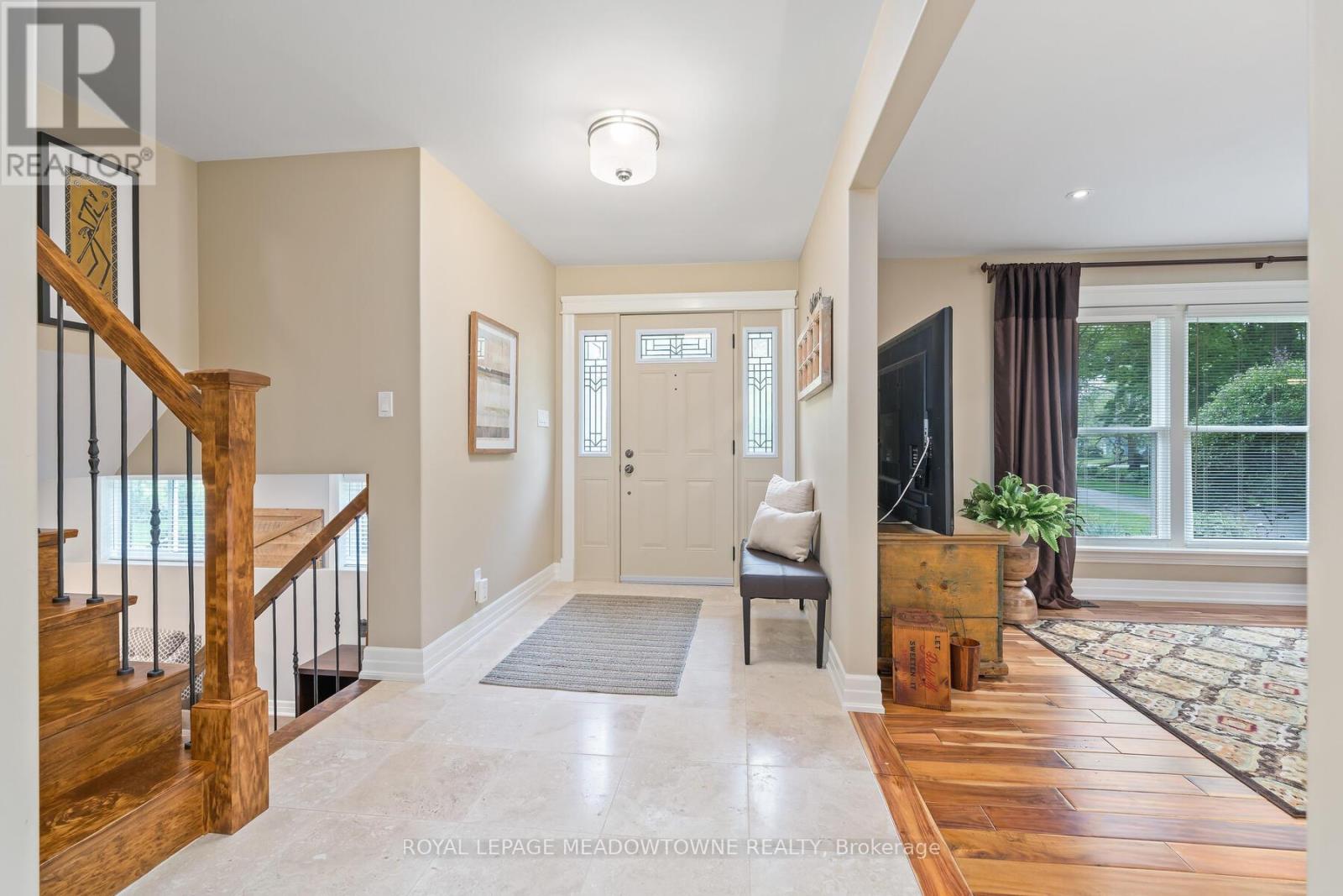 Picture perfect in Halton Hills. Gorgeous country home in mint condition and meticulously cared for with beautiful gardens and tons of curb appeal. Open concept kitchen with corian counters, stainless steel appliances and breakfast bar. Three bedrooms up with 4-piece and one conveniently located on the main floor with another full bathroom. Ideal set up for an elderly parent! The lower level is finished plus there is a huge and very useful crawlspace for your storage. An oversize two-car garage leads to the mudroom with laundry and large closet space. Beautiful views from every window. The backyard features a fabulous deck with a large pretty shed for all your toys. Shingles (2016), furnace, windows, air conditioner (2013) & Water heater and water softener (2023). Addition built in 2016. Extras include Acacia wood flooring, spray foam insulation, composite siding. It's just shy of 1/2 an acre. Ideally located close to Georgetown, Acton and minutes to the 401. Pride of ownership throughout. It's move-in ready and lovely! (id:64974)
