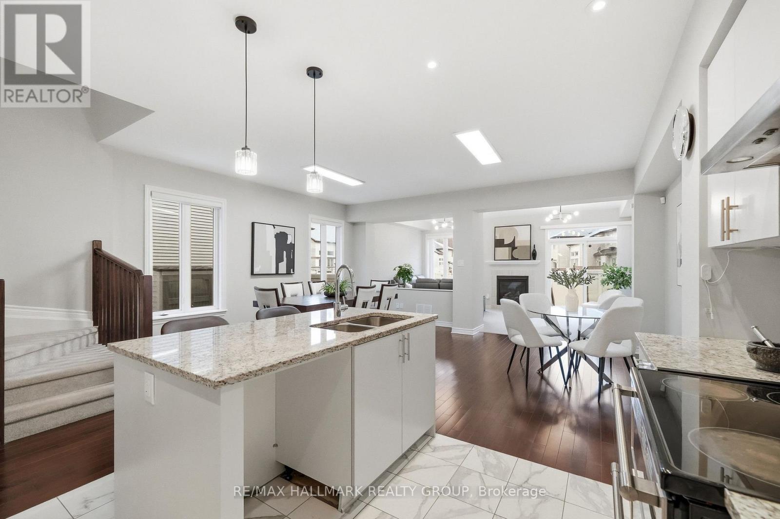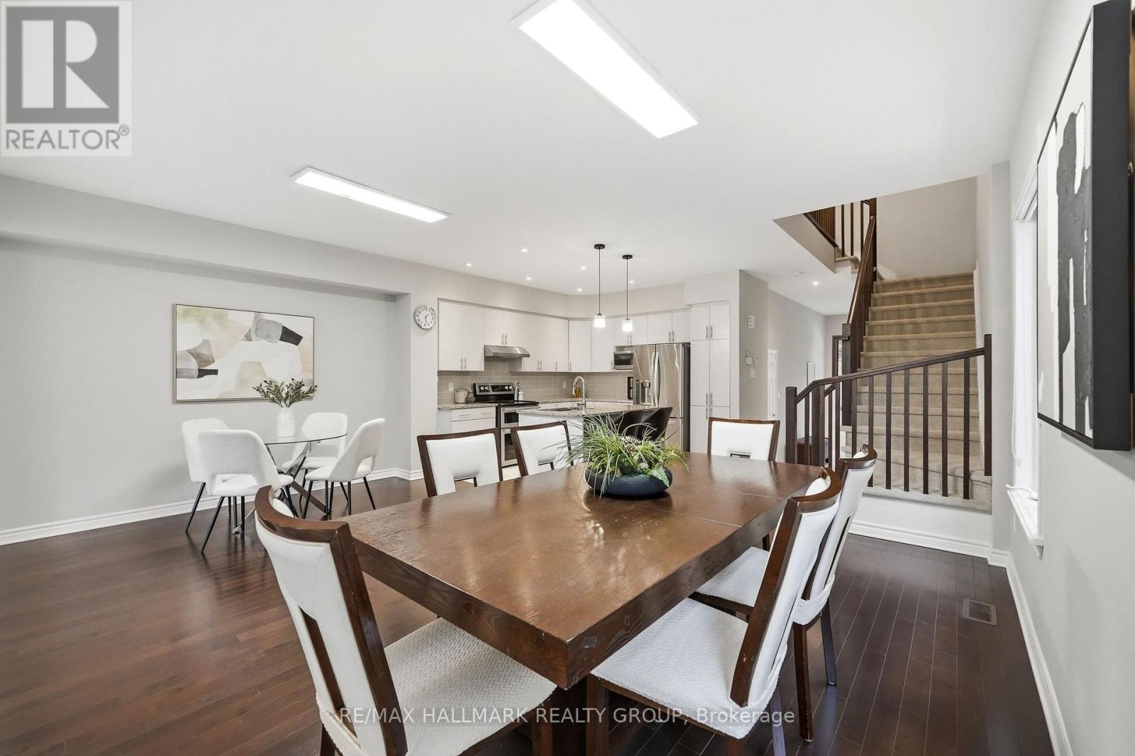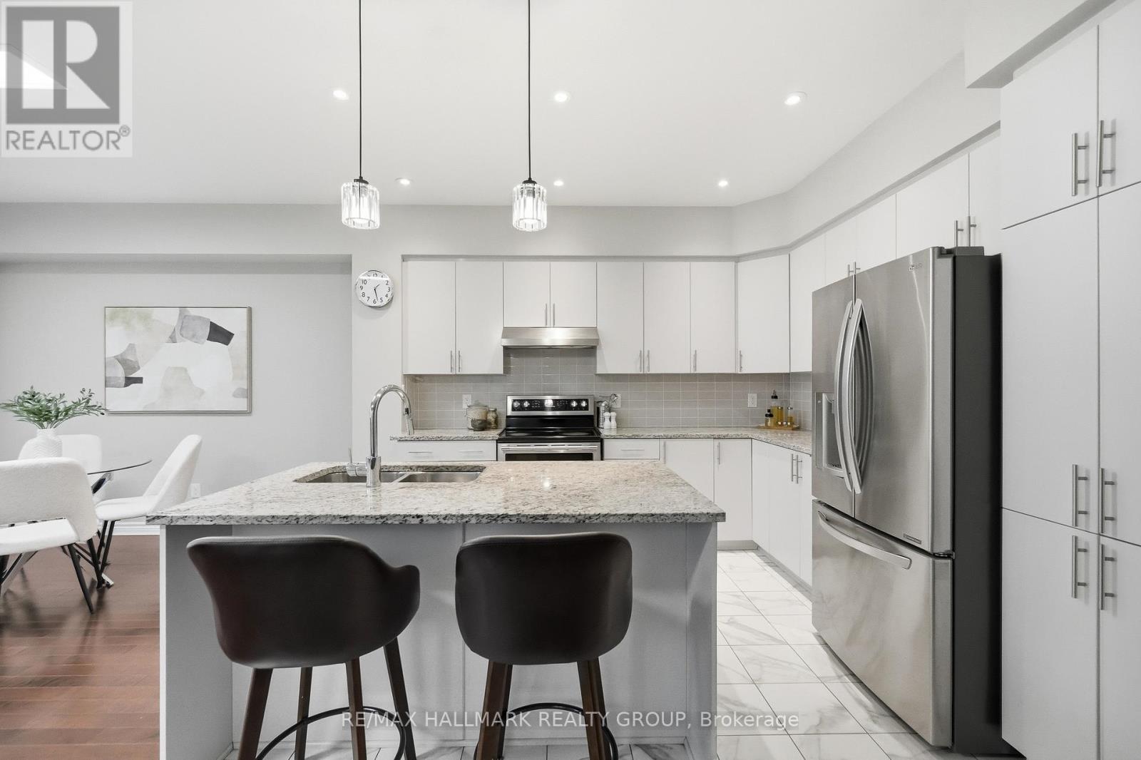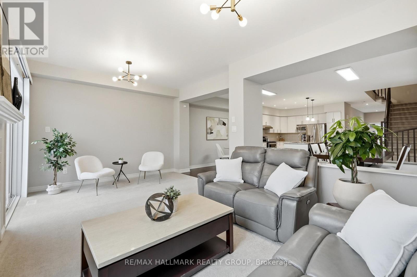 Welcome to 137 Wild Calla Way, a beautifully upgraded Richcraft Fairhaven End Unit townhome offering approx 2,539 sq ft of total living space, located in the desirable Bradley Estates community in Orleans. A rare 4 bedroom layout with the builder loft professionally converted to a 4th bedroom & 3 bathrooms, this home provides both space and functionality for modern living. Main level features a bright open concept design with hardwood flooring throughout the main hallway & dining areas. The inviting living room is finished with cozy carpeting, a gas fireplace & access to the backyard. The modern white kitchen overlooks the living space and includes stainless steel appliances, double oven, ice-maker fridge, centre island with double sink & breakfast bar, and plenty of cabinetry for storage. Upstairs you will find 4 spacious carpeted bedrooms including the primary suite, along with the convenience of second-floor laundry. All 3 bathrooms feature granite countertops, with upgraded power showers in the primary ensuite & second bathroom, and the main bath includes tile extended to the ceiling. Additional upgrades include oak stairs, modern light fixtures in the living room, kitchen island, dining room and primary bedroom, flow-through humidifier, central air conditioning, updated kitchen faucet, and plumbing improvements including new sink stoppers in all bathrooms & the powder room. The home has also been freshly painted throughout with updated baseboards. The finished lower level recreation room provides additional living space, while a large unfinished storage/utility area offers excellent storage potential. Outside, enjoy extended driveway parking with interlock for two vehicles, a single garage with inside entry featuring built-in tire rack and custom storage, plus a convenient side storage shed. Located close to parks, schools, transit, and everyday amenities, this move-in ready end unit offers comfort, upgrades, and an excellent family-friendly location! (id:64974)