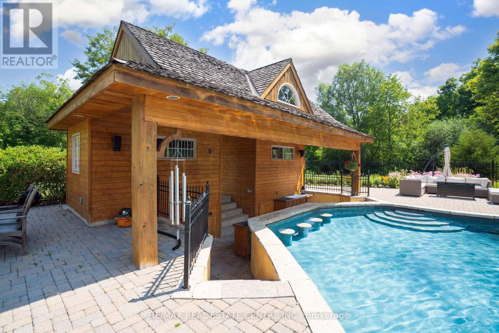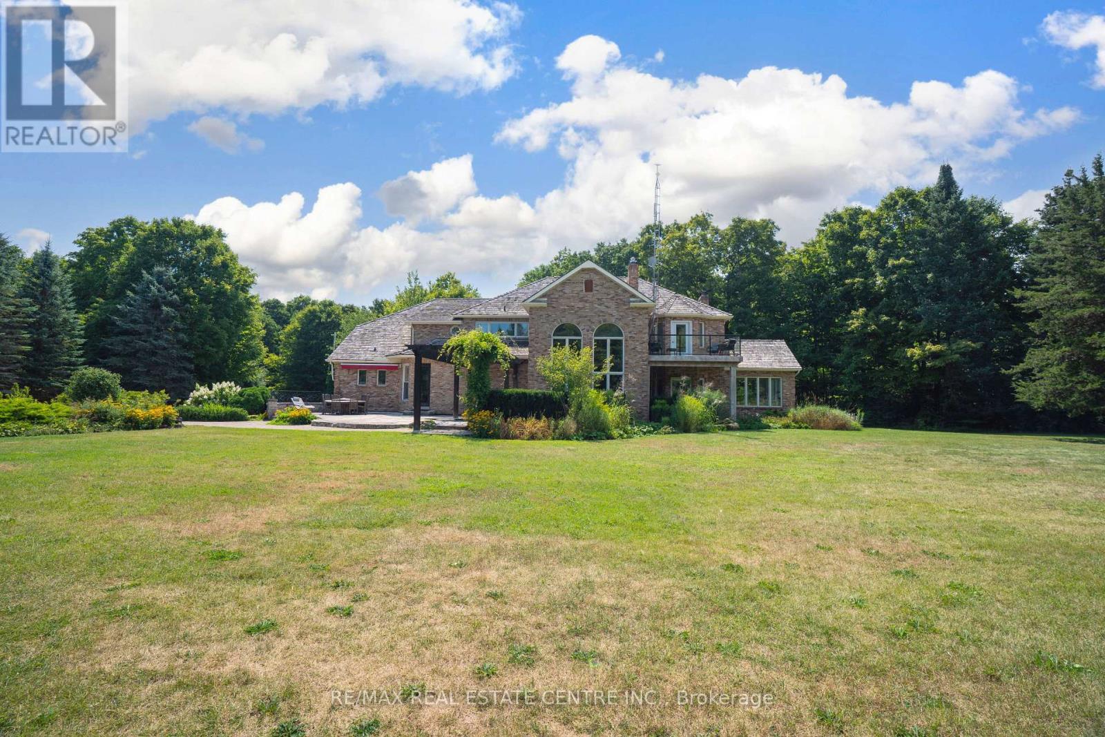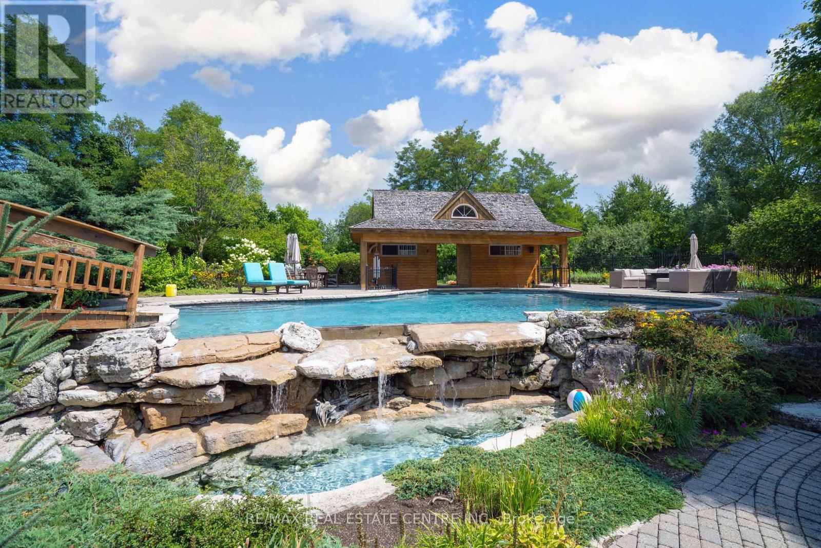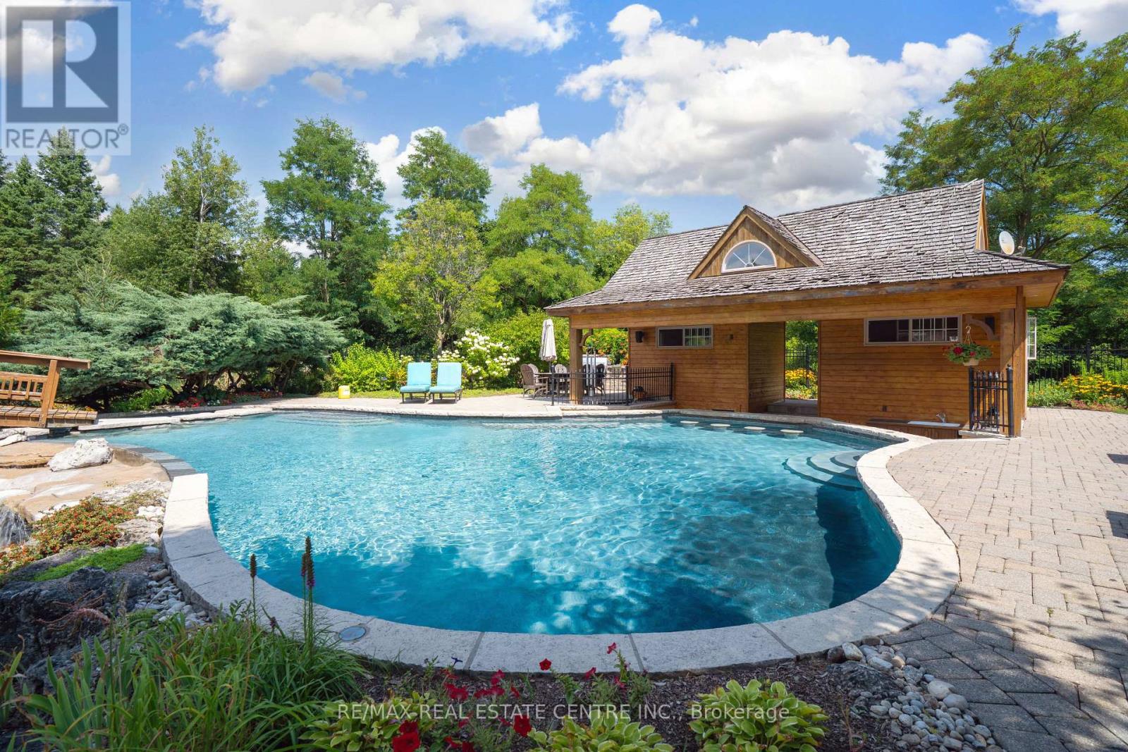 A Signature Estate in Nassagaweya. Set at the end of a long, tree-lined drive, this remarkable custom-built 4-bedroom, 7-bathroom residence delivers over 6,100 sq. ft. above grade plus approx 2,000 sq. ft. finished walk-out lower level. The grand two-storey foyer leads to a striking great room with floor-to-ceiling stone fireplace, a light-filled conservatory, private office, and a sunken living room. The chefs kitchen showcases premium appliances, live-edge granite surfaces, an oversized island, and a sunny breakfast nook, while the formal dining room offers a two-sided stone fireplace and custom cabinetry. A billiards lounge with lava rock bar, waffle ceiling, and bespoke built-ins adds to the main floors appeal. Upstairs, the primary suite features a spa-like ensuite and a custom walk-in closet, while three additional bedrooms each have their own designer baths. A secondary staircase provides direct access to the kitchen and laundry. The lower level is fully finished with a large recreation area, games room, and 2-piece bath. Outdoors, the resort-style grounds feature a lagoon-inspired saltwater pool with waterfall, wading area, swim-up bar, and custom hot tub. A cedar pool house with 2- piece bath, sunken outdoor kitchen, and stone patio BBQ space make entertaining effortless. The property also includes two fire pits, a playhouse, horseshoe pit, vast lawn areas, a detached garage with heated workshop, and parking for 50+ vehicles. All within minutes of Rockwood, and an easy commute to Guelph, Milton, the GTA, and Pearson Airport. A home that delivers unmatched luxury, privacy, and lifestyle. (id:64974)