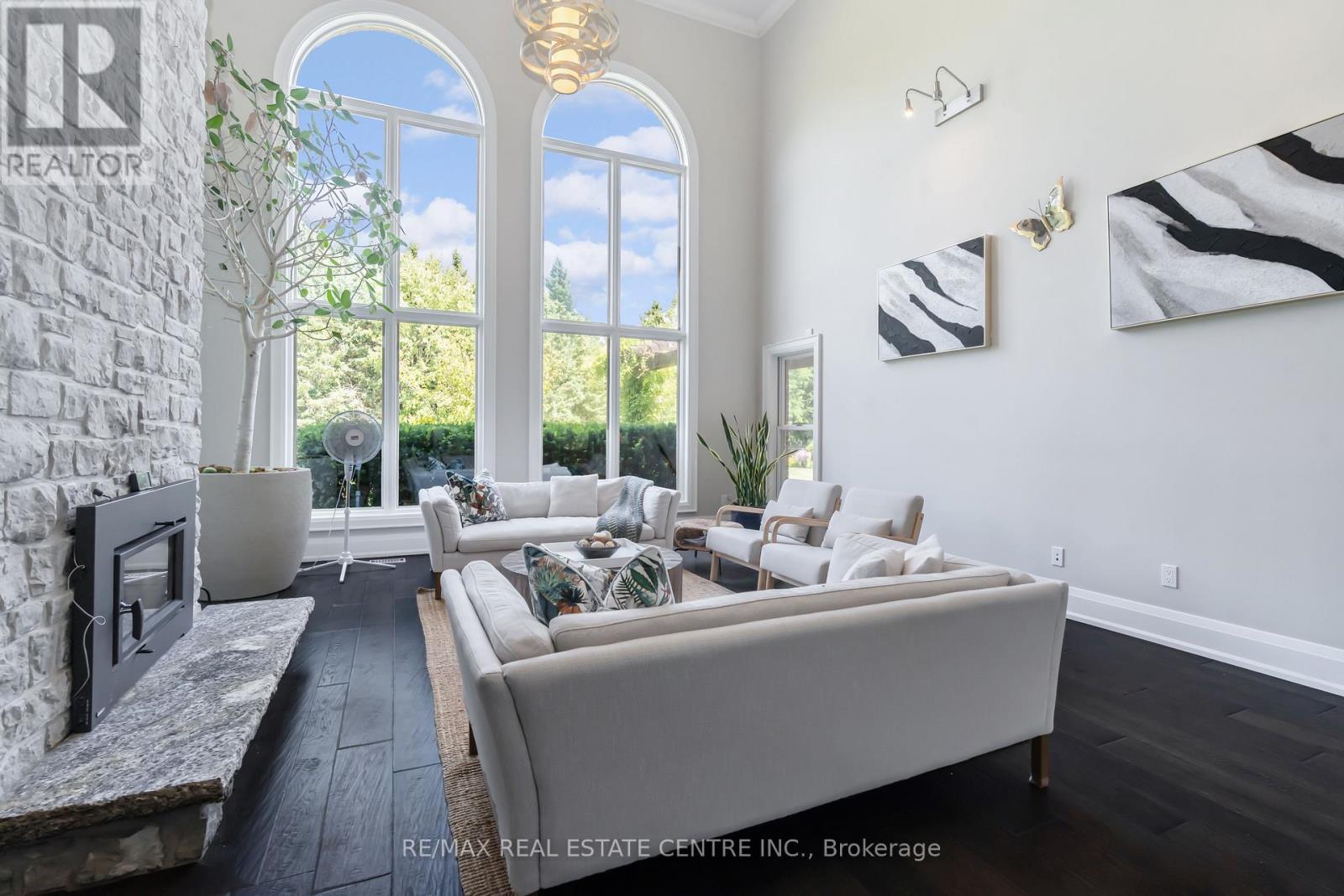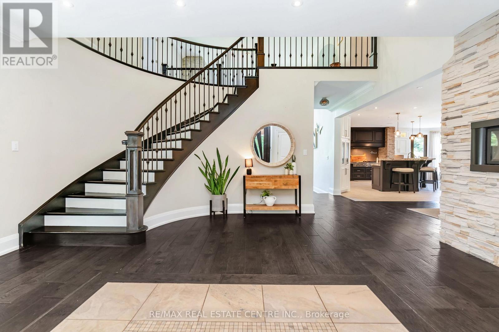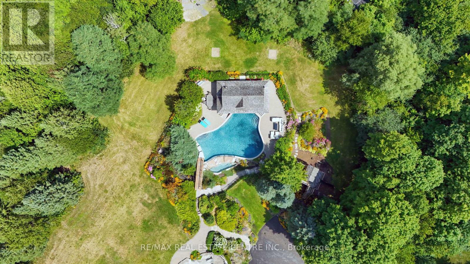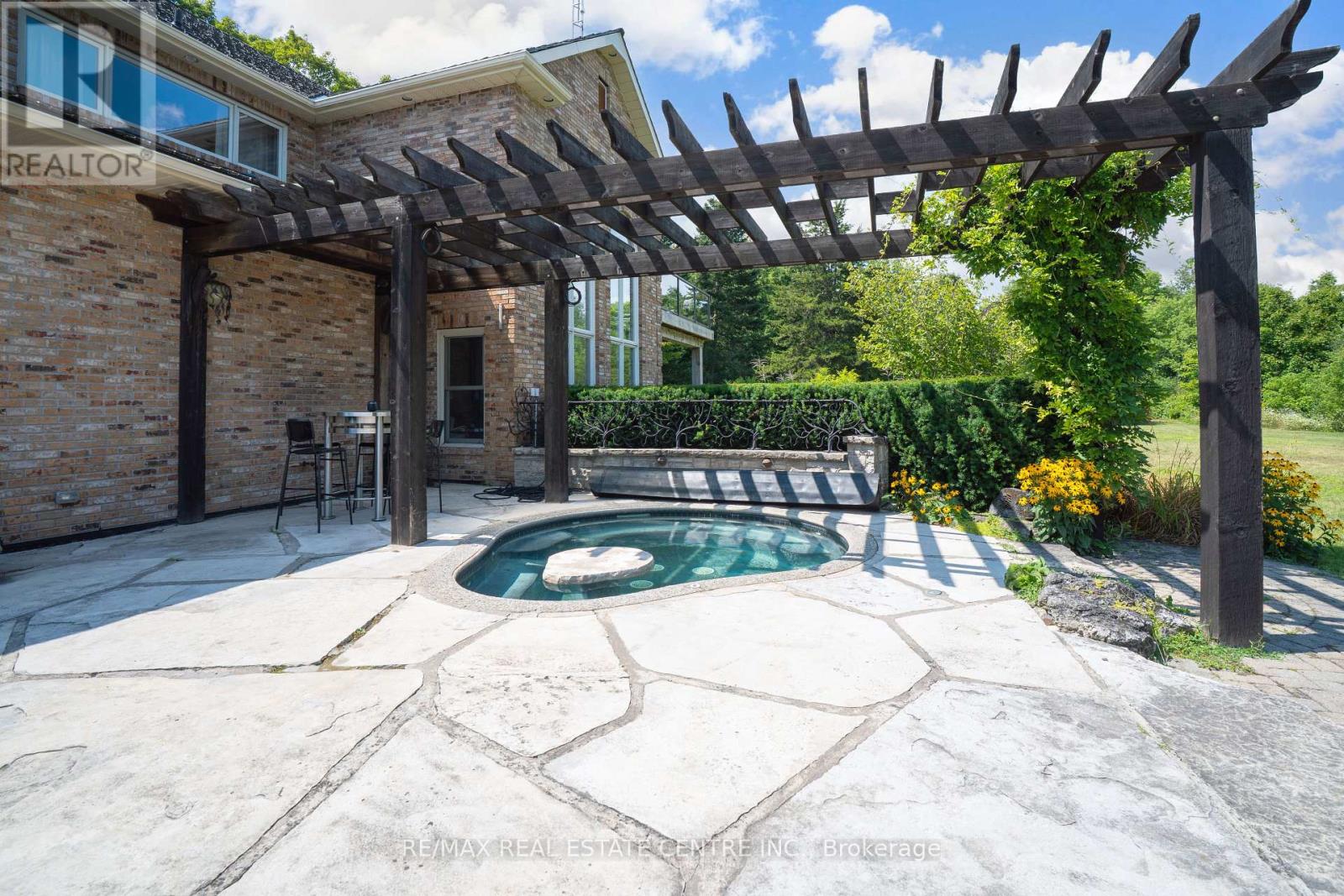 A Signature Estate in Nassagaweya. Set at the end of a long, tree-lined drive, this remarkable custom-built 4-bedroom, 7-bathroom residence delivers over 6,100 sq. ft. above grade plus approx 2,000 sq. ft. finished walk-out lower level. The grand two-storey foyer leads to a striking great room with floor-to-ceiling stone fireplace, a light-filled conservatory, private office, and a sunken living room. The chefs kitchen showcases premium appliances, live-edge granite surfaces, an oversized island, and a sunny breakfast nook, while the formal dining room offers a two-sided stone fireplace and custom cabinetry. A billiards lounge with lava rock bar, waffle ceiling, and bespoke built-ins adds to the main floors appeal. Upstairs, the primary suite features a spa-like ensuite and a custom walk-in closet, while three additional bedrooms each have their own designer baths. A secondary staircase provides direct access to the kitchen and laundry. The lower level is fully finished with a large recreation area, games room, and 2-piece bath. Outdoors, the resort-style grounds feature a lagoon-inspired saltwater pool with waterfall, wading area, swim-up bar, and custom hot tub. A cedar pool house with 2- piece bath, sunken outdoor kitchen, and stone patio BBQ space make entertaining effortless. The property also includes two fire pits, a playhouse, horseshoe pit, vast lawn areas, a detached garage with heated workshop, and parking for 50+ vehicles. All within minutes of Rockwood, and an easy commute to Guelph, Milton, the GTA, and Pearson Airport. A home that delivers unmatched luxury, privacy, and lifestyle. (id:64974)