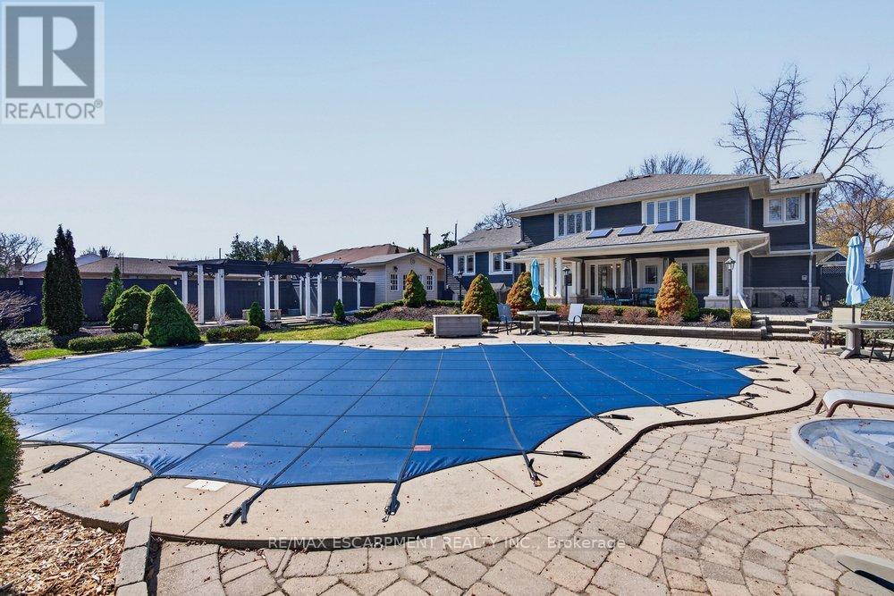 This meticulously renovated, 5-bedroom, 3500sq.ft. home, seamlessly blends architectural elegance with a resort-like backyard sanctuary. Sitting on over 1/4 acre (75.71ft x 150.27ft), the private, mature backyard is a masterclass in landscape design, framed by a lush triple-layer of emerald cedars that ensures total seclusion for the salt-water pool and its sophisticated lounging terrace. A striking vaulted covered patio with an intricate wood-inlay ceiling plus 3 skylights, offers a luxurious element and an elevated vantage point over the manicured grounds and pool. Inside, the layout is designed for both effortless entertaining and multi-generational living. The 2-storey home includes a unique side-split level with an open great room/family room that boasts an 11'7" ceiling height, and a conveniently-placed laundry room that serves both the main and upper quarters. On the main level, the gourmet kitchen, living and dining areas, transition openly with windows overlooking the stunning backyard and a walk-out to patio. There is an additional, versatile 'wing' on the main floor that features the fifth bedroom, a pristine 3-pc bathroom, a separate entry, plus the inside entry to the two-car garage - all accessible without stairs. The second level features four spacious, sunny bedrooms, including a separate primary suite distinguished by a stately coffered ceiling and 5-pc ensuite bathroom, plus there is a 4-pc bathroom on this level. The front windows in the foyer, living room, and family room have been beautifully enhanced with custom-made stained-glass windows for ultimate privacy and distinction. The lower level features a mirror-panelled exercise room/recreation room with a rubber-floor overlay (the equipment is negotiable) with windows on both ends of the room. Rich solid-oak flooring throughout the above-grade levels, and the whole home is carpet-free. Come see this very special home and property in a quiet, friendly neighbourhood of south-west Oakville. (id:64974)