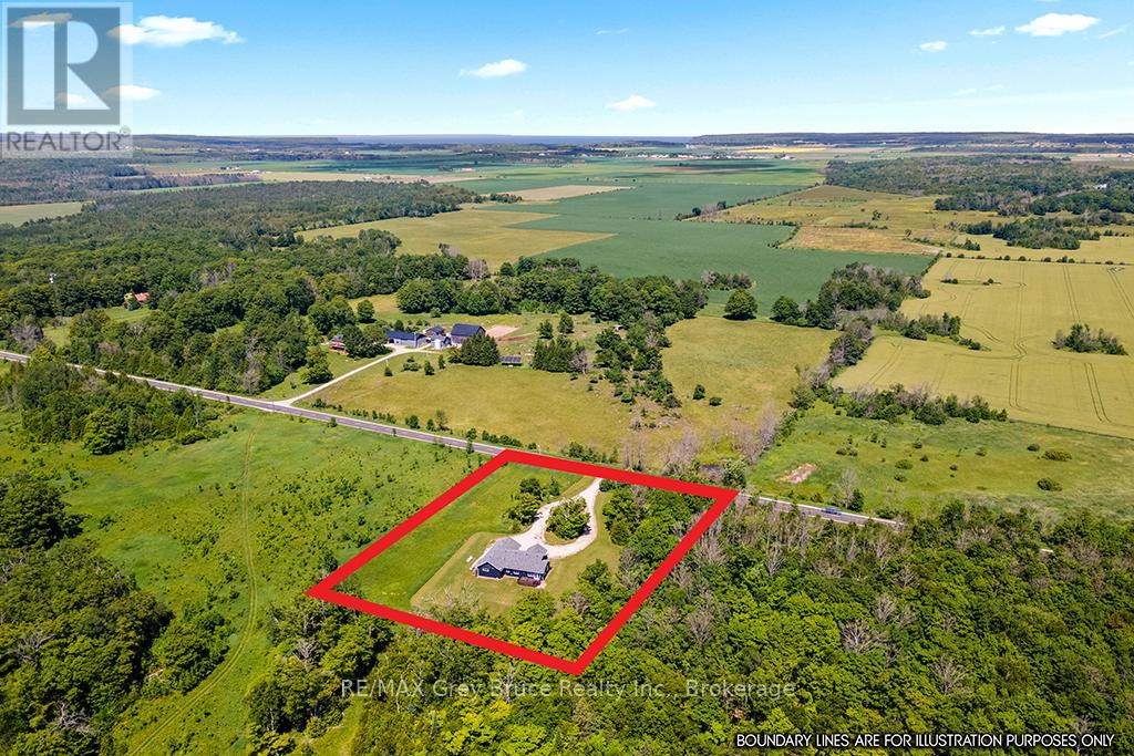 THOUGHTFULLY DESIGNED NEWER CUSTOM HOME! Set on a private 2.4 acre oasis! It features 4 bedrooms, 4 bathrooms, and over 2,100sqft. Great for large families and/or B&B opportunity with separate entrances and ensuite bathrooms! Centrally located on the Peninsula with an easy drive to Lion's Head, Tobermory, Wiarton, Sauble Beach, and more. Lake Huron is also just around the corner (4 min!) with a boat launch and public water access. The oversized attached garage (24ft by 23ft) provides ample space for vehicles, tools, toys, and storage. The covered front porch makes for a welcoming entrance and quiet space to unwind! Inside offers a large open-concept layout while still providing separated spaces when needed. The living room has a stunning grand fireplace and vaulted ceilings lined with a beautiful wood design. A chef's kitchen with quartz countertops, custom cabinetry, and an island with a built-in appliance lift. Primary bedroom is oversized and complemented with a 4-piece ensuite, in room laundry, and walk-in closet. Whether you're looking for a home, a quiet retreat or a rental opportunity this move-in-ready home offers a rare combination of modern design and natural beauty! (id:64974)