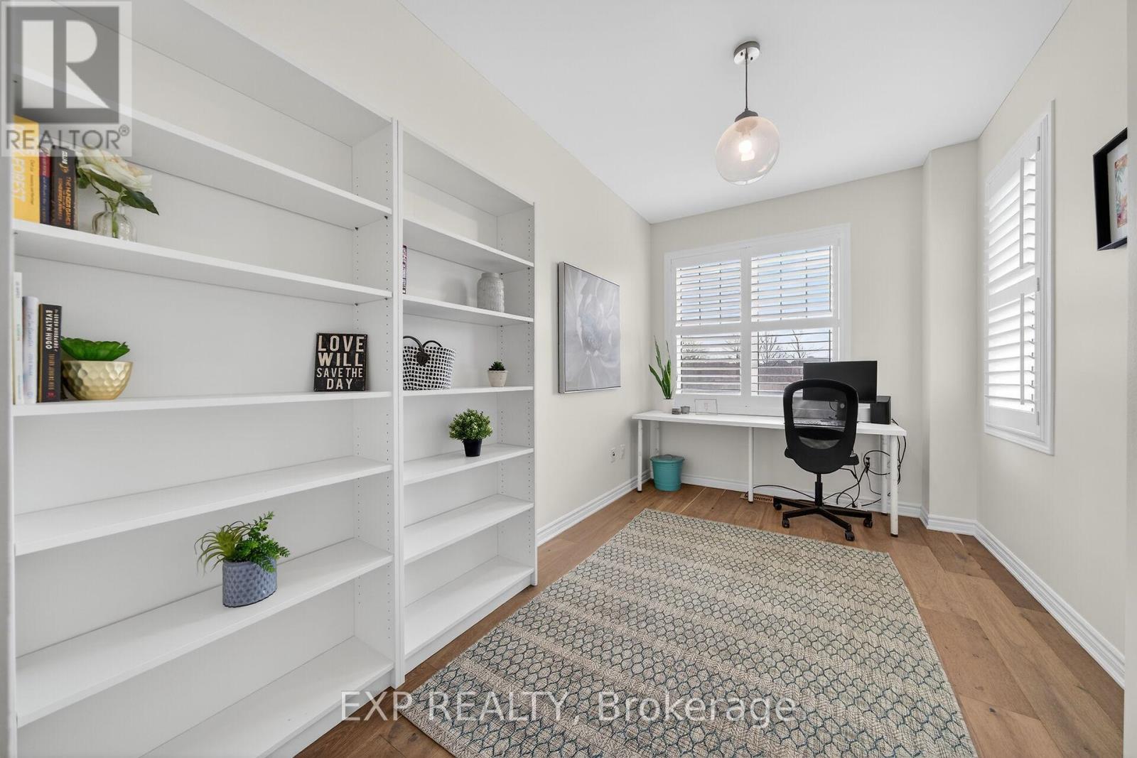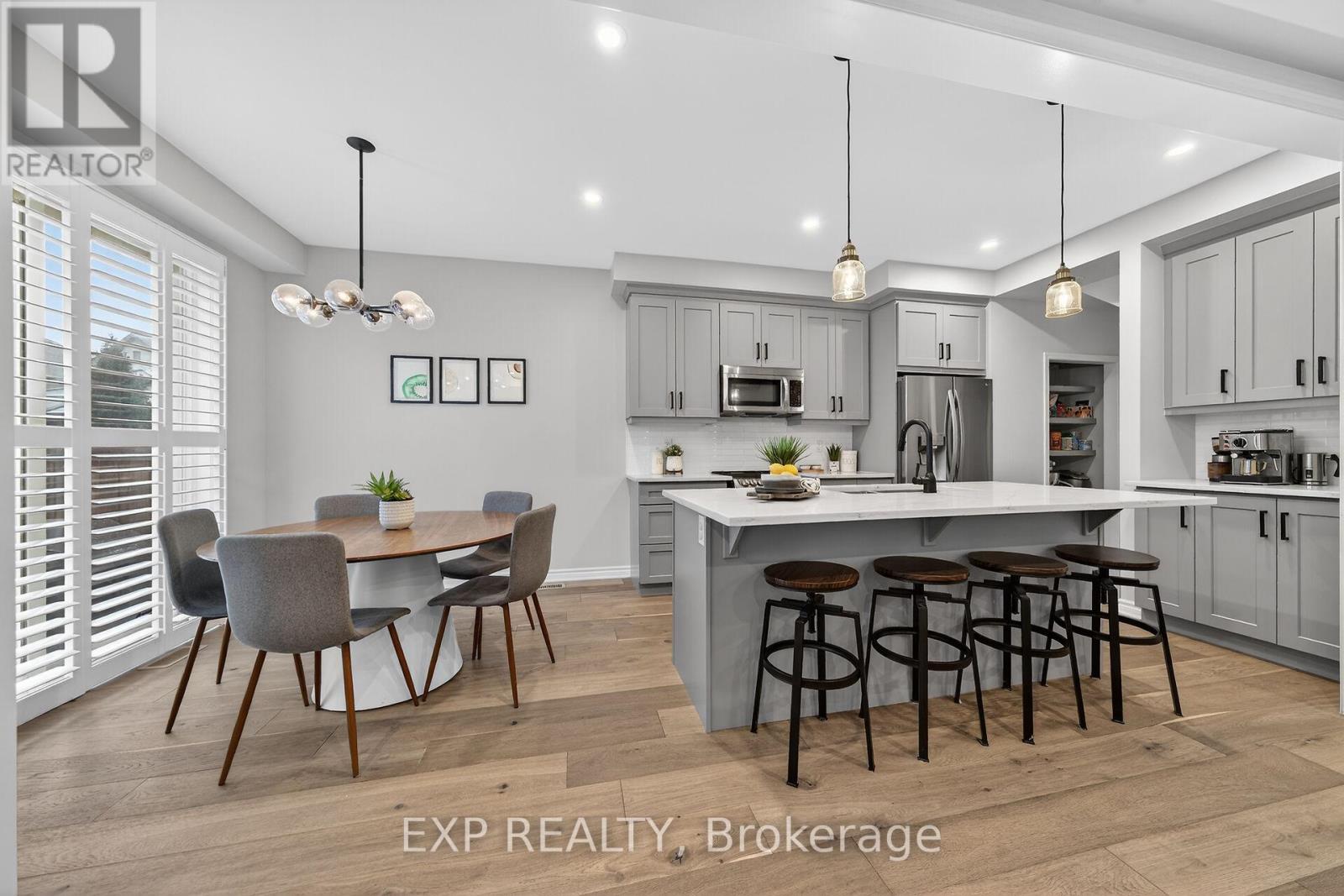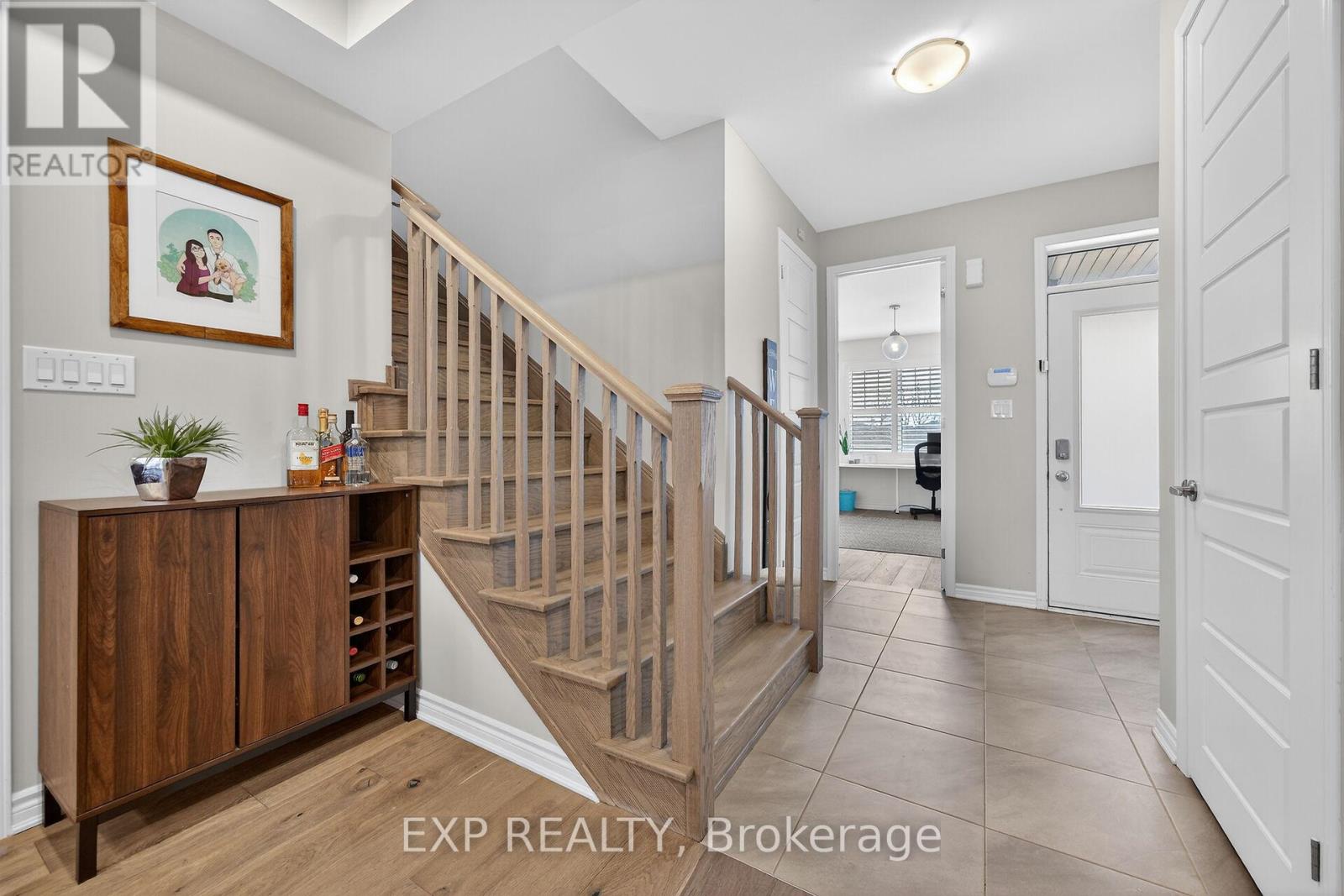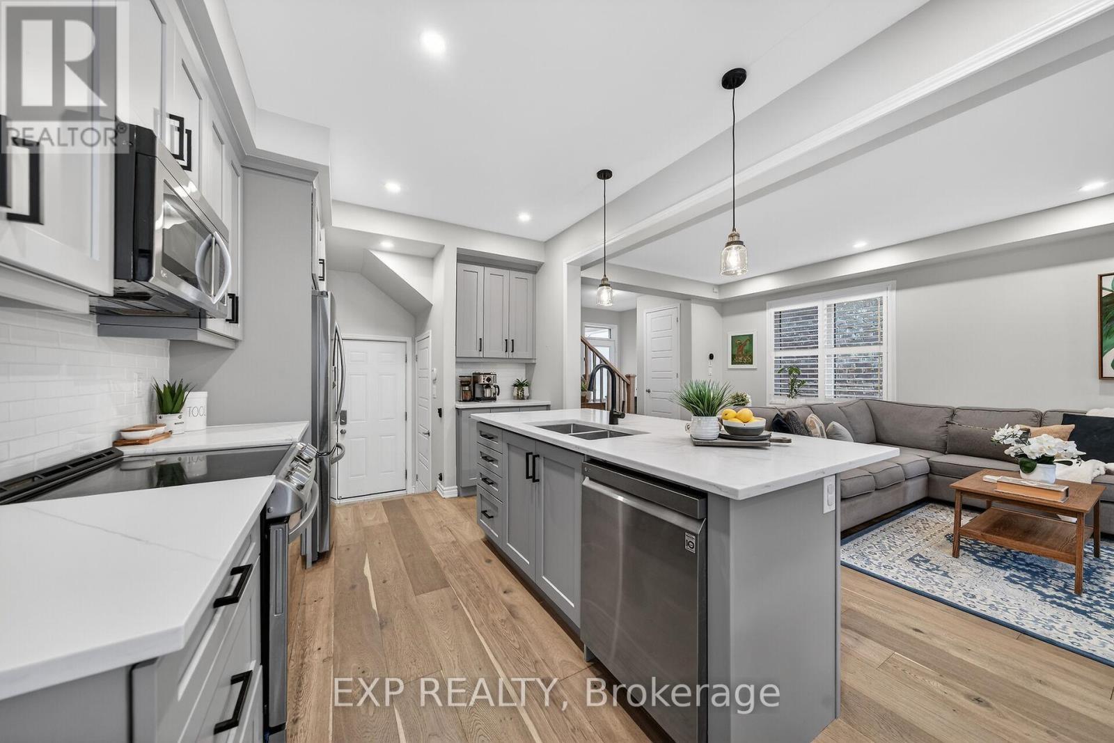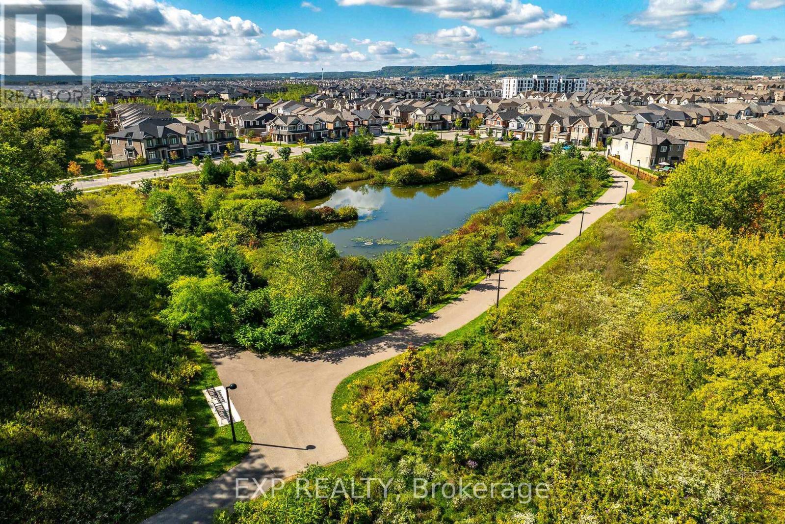 Charming detached home in a highly desirable Milton neighbourhood overlooking the pond and steps to 16 Mile Creek and scenic walking trails. This 4+1 bedroom, 3 bathroom home offers a spacious open-concept layout with wide plank hardwood floors, a modern kitchen with breakfast bar, dining area, and bright living room with cozy fireplace. Upstairs features four generously sized bedrooms, including a primary suite with large walk-in closet and spacious ensuite. The unspoiled basement with large windows offers excellent potential for additional living space. Enjoy professionally completed patio hardscaping (2022) in the front and backyard-providing parking for two additional cars and a great outdoor setting for relaxing or entertaining. (id:64974)