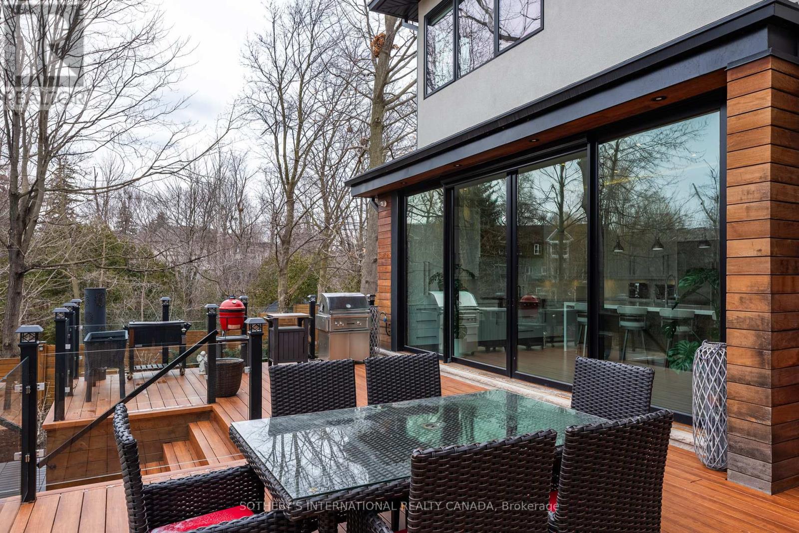 A home that effortlessly commands attention, defined by bold contemporary architecture and refined curb appeal. Set within South-East Oakville's Morrison neighbourhood, the striking exterior blends natural cedar and stone-creating a sophisticated façade that feels both modern and timeless, offering over 5,700 sqft of finished living space. The dramatic 21ft foyer with floating glass staircase sets the tone, leading into an open-concept main level with 10-foot ceilings. With its prized southern exposure, the main living spaces are framed by a wall of floor-to-ceiling glass sliding doors with phantom screens-introducing remarkable scale while seamlessly inviting the outdoors in. The chef's kitchen is anchored by a 12ft island and features premium Wolf and SubZero appliances, along with a walk-through servery complete with wine fridge and access to the dining room. The great room impresses with custom built-ins, a gas fireplace, and a statement walnut feature wall. Also on the main level, a quiet office, powder room, convenient laundry room and mudroom entry from the double car garage. Upstairs, four spacious bedrooms offer ensuite access, including a luxurious principal retreat with double walk-in closets and a spa-like ensuite. The fully finished lower level adds exceptional versatility with a large recreation space, built-ins, electric fireplace, fifth bedroom or gym, and a 3-piece bathroom with a steam shower. The backyard, enveloped by a lush canopy of trees, where the gentle sights and sounds of the nearby creek create a serene retreat immersed in nature. Privacy, serenity and beautifully landscaped, the deck and stone patio are perfectly designed for entertaining. Additional highlights include 10 vehicle parking, irrigation system, and a fully integrated smart home with built-in speakers, Lutron lighting, and motorized blinds throughout. A rare offering in one of Oakville's most sought-after enclaves, just moments to top-rated schools, parks, and downtown. (id:64974)