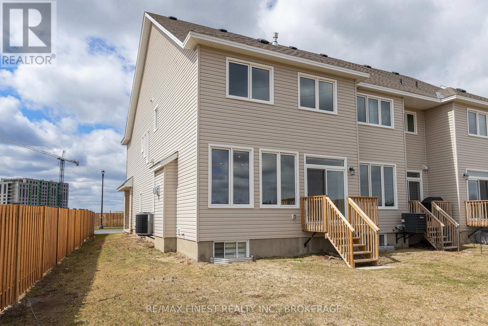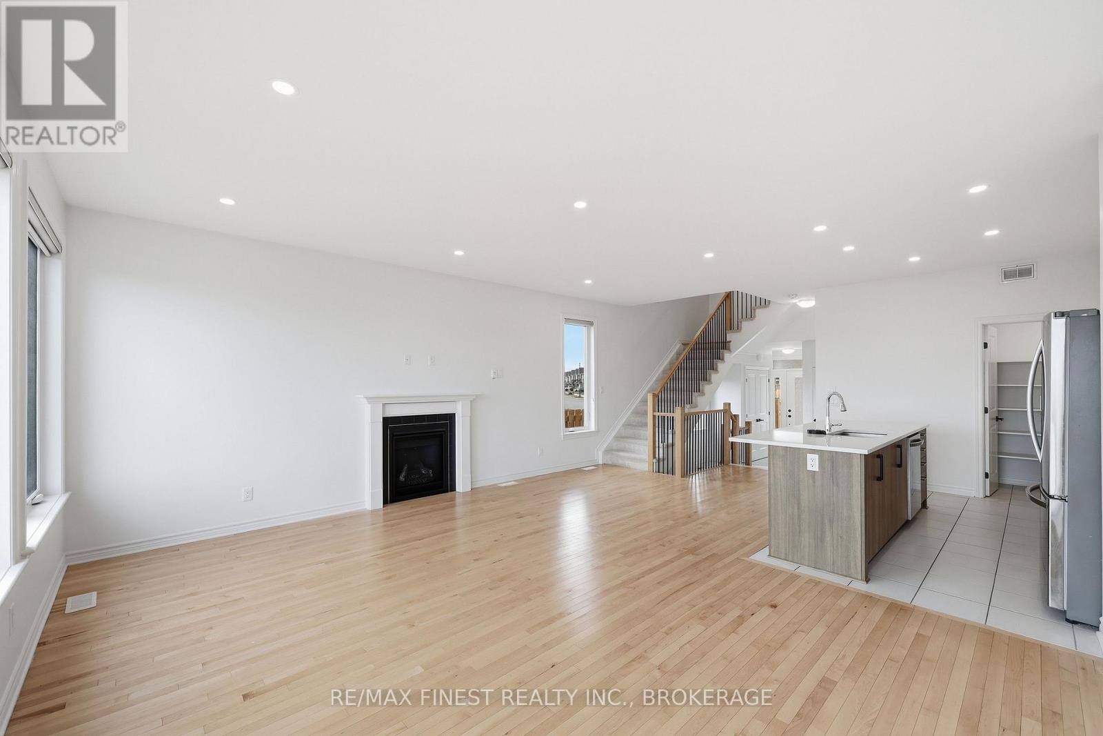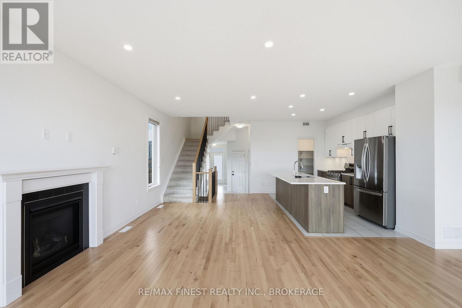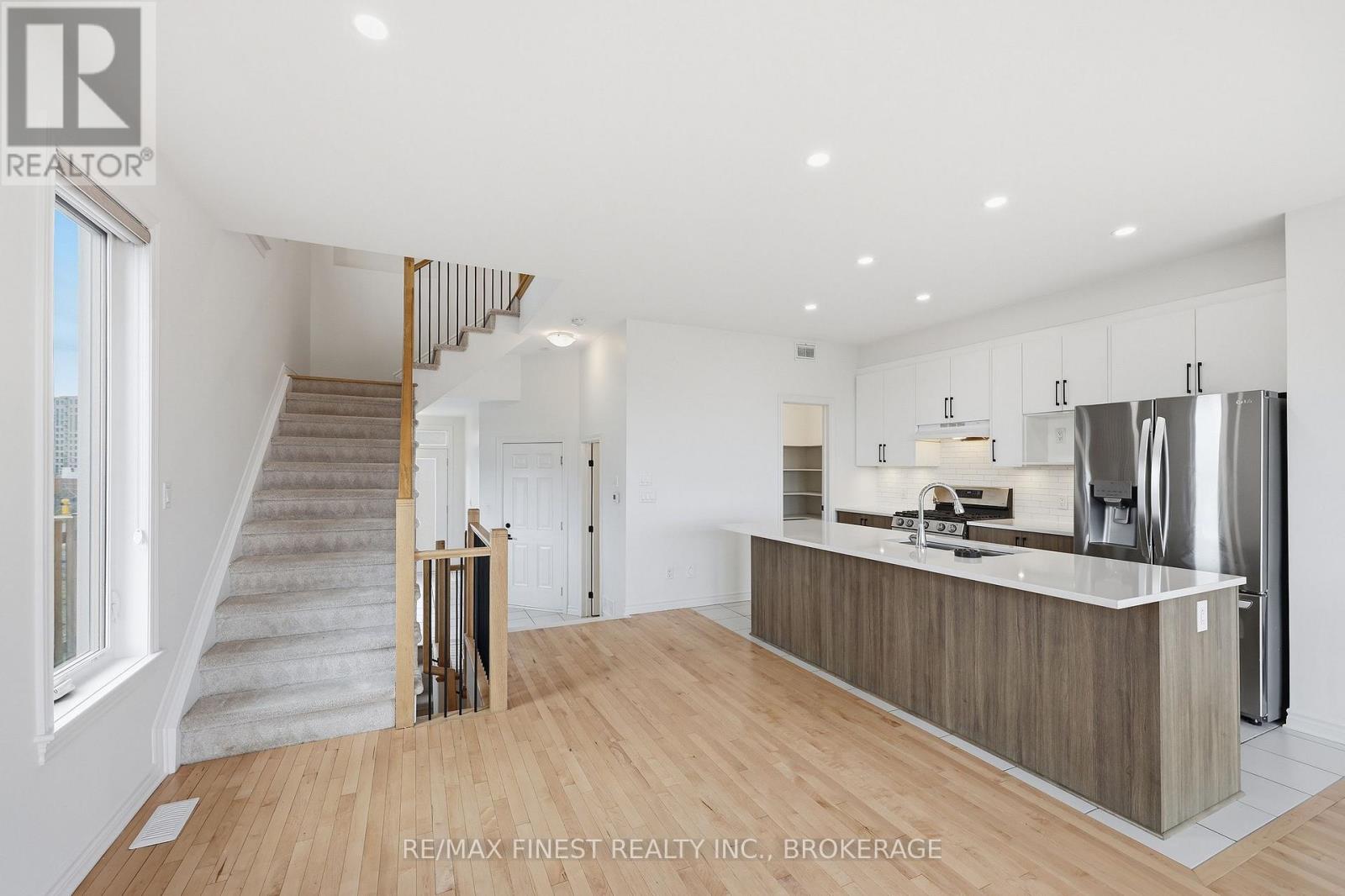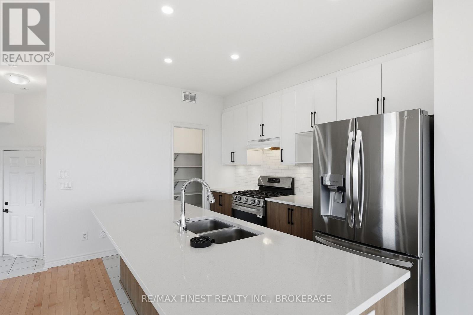 This fantastic end unit townhouse is a beautiful home to settle in and enjoy all of the features it has to offer! Impeccably built, with over 2155 sq ft of finished living space on three levels, the neutral and calming design is the perfect place to call your own! The main floor features an open concept design with gas stove, quartz counter tops, tile backsplash, large island, pantry, beautiful kitchen cabinets. There are pot lights throughout the main floor and a cozy gas fireplace in the living room for you to enjoy. On the upper level, the primary bedroom is very spacious and has an amazing walk-in closet with a spa-like ensuite! Soaker tub, custom tiled glass shower & large vanity perfect for storage, finishes it off! The two additional bedrooms also offer fantastic space and have good sized closets for storage. In the lower level you will find a finished rec room that is perfect for movie night, kids play area, office or additional storage space. There is a bonus rough-in for a bathroom as well. This home is also situated on a premium lot that is pie-shaped and has so much space and potential for your summer enjoyment! This property is worth your time to come and take a peek! (id:64974)