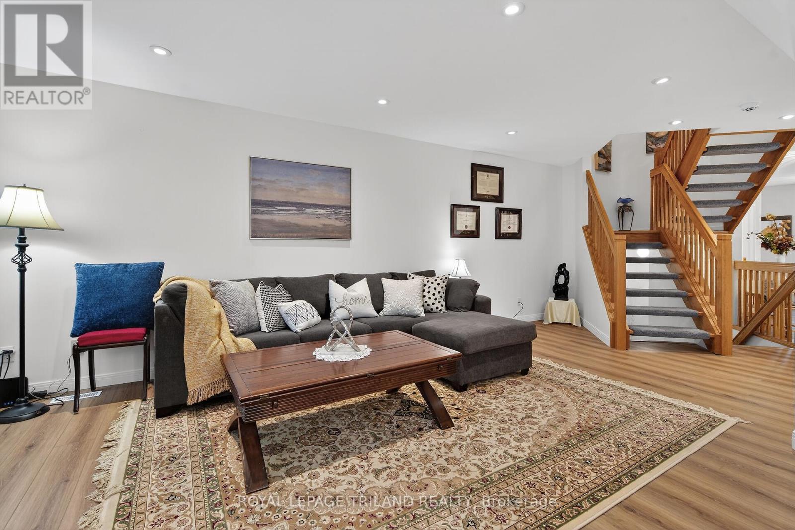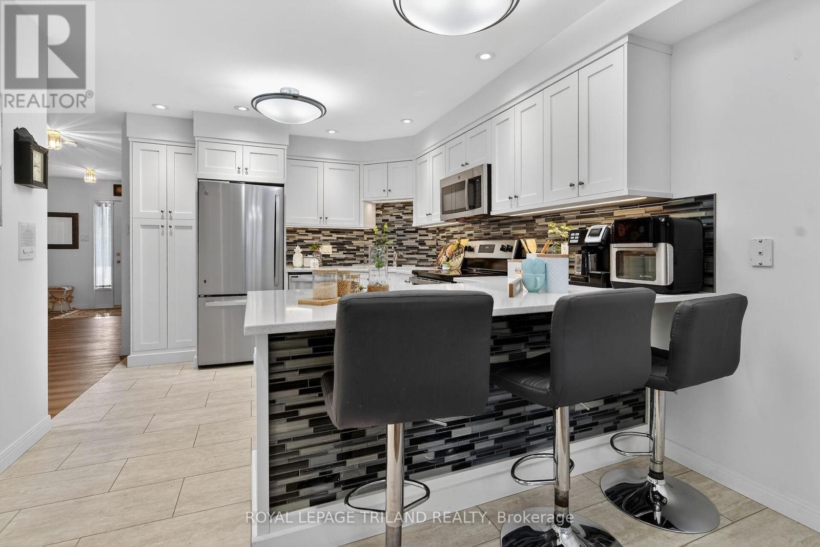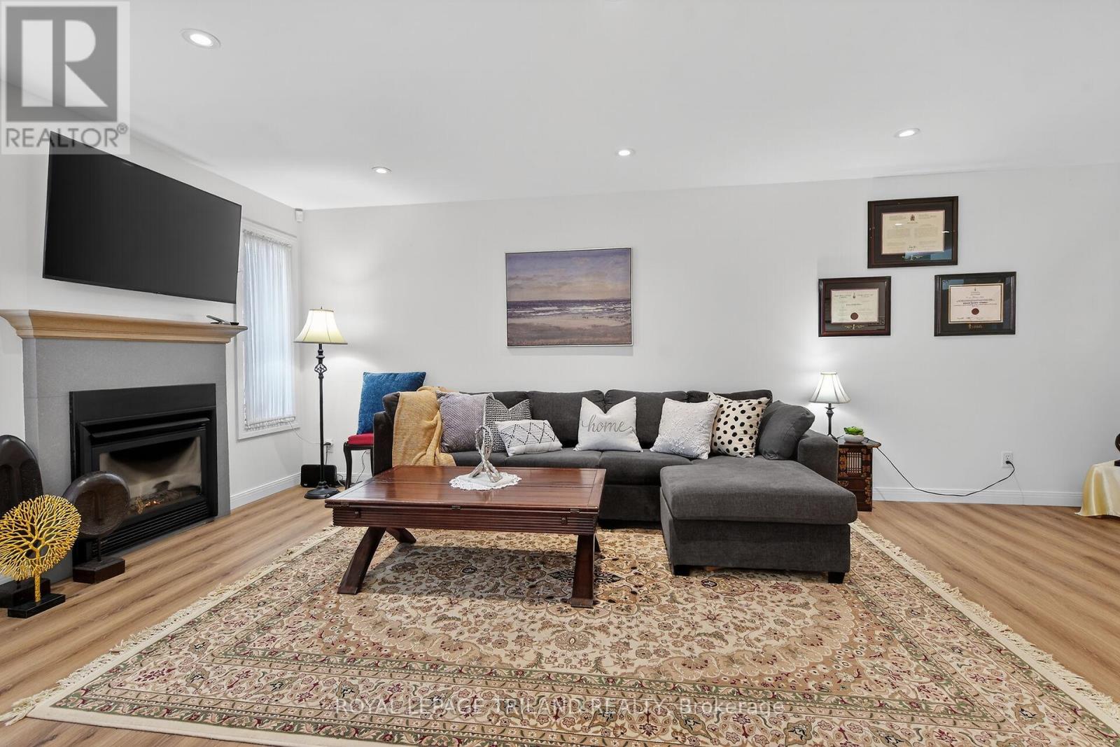 Welcome to this beautifully updated two-storey townhouse tucked away on a quiet cul-de-sac in the heart of Northridge. Surrounded by mature trees and exceptional privacy, this home offers direct access to a scenic 5.2 km trail system along the Thames River-perfect for walking, running, or cycling. The bright, south-facing entryway opens into a warm and inviting living room highlighted by a contemporary gas fireplace. The renovated kitchen (2023) features sleek cabinetry, quartz countertops, a glass tile backsplash, and stainless steel appliances, with the adjoining dinette leading to a private L shaped deck nestled among the trees. As a middle unit, this home benefits from natural shade and improved insulation, helping maintain comfortable temperatures and reducing energy costs. The second floor includes a spacious primary bedroom with a generous walk-in closet, along with two additional well-sized bedrooms. The finished basement adds even more versatility with a recreation room complete with built-in TV and speakers, a full four-piece bathroom, a dedicated laundry room, and ample storage. This well-managed community provides low-maintenance living with landscaping, snow removal, and grass cutting included. Recent improvements-new A/C (2021), luxury vinyl plank flooring throughout the second level (2024), new washer and dryer (2024), duct cleaning (2024), and fresh paint (2024) - ensure a move-in-ready experience. Ideally located in everyday amenities and top-rated schools, this home offers the perfect balance of convenience, comfort, and natural surroundings. (id:64974)