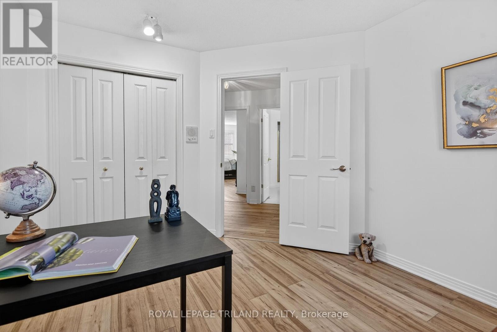 Welcome to this beautifully updated two-storey townhouse tucked away on a quiet cul-de-sac in the heart of Northridge. Surrounded by mature trees and exceptional privacy, this home offers direct access to a scenic 5.2km trail system along the Thames River - perfect for walking, running, or cycling. The bright, south facing entryway opens into a warm and inviting living room highlighted by a contemporary gas fireplace. The renovated kitchen (2023) features sleek cabinetry, quartz countertops, a glass tile backsplash, and stainless steel appliances, with the adjoining dinette leading to a private L shaped deck nestled among the trees. As a middle unit, this home benefits from natural shade and improved insulation, helping maintain comfortable temperatures and reducing energy costs. The second floor includes a spacious primary bedroom with a generous walk in closet, along with two additional well sized bedrooms. The finished basement adds even more versatility with a recreation room complete with built in TV and speakers, a full four-piece bathroom, a dedicated laundry room, and ample storage. This well managed community provides low maintenance living with landscaping, snow removal, and crass cutting included. Recent improvements - ne A/C (2021), luxury vinyl plank flooring throughout the second level (2024), new washer and dryer (2024), duct cleaning (2024), and fresh paint (2024), ensure a move-in ready experience. Ideally located in everyday amenities and top rated schools, this home offers the perfect balance of convenience, comfort, and natural surroundings. (id:64974)
