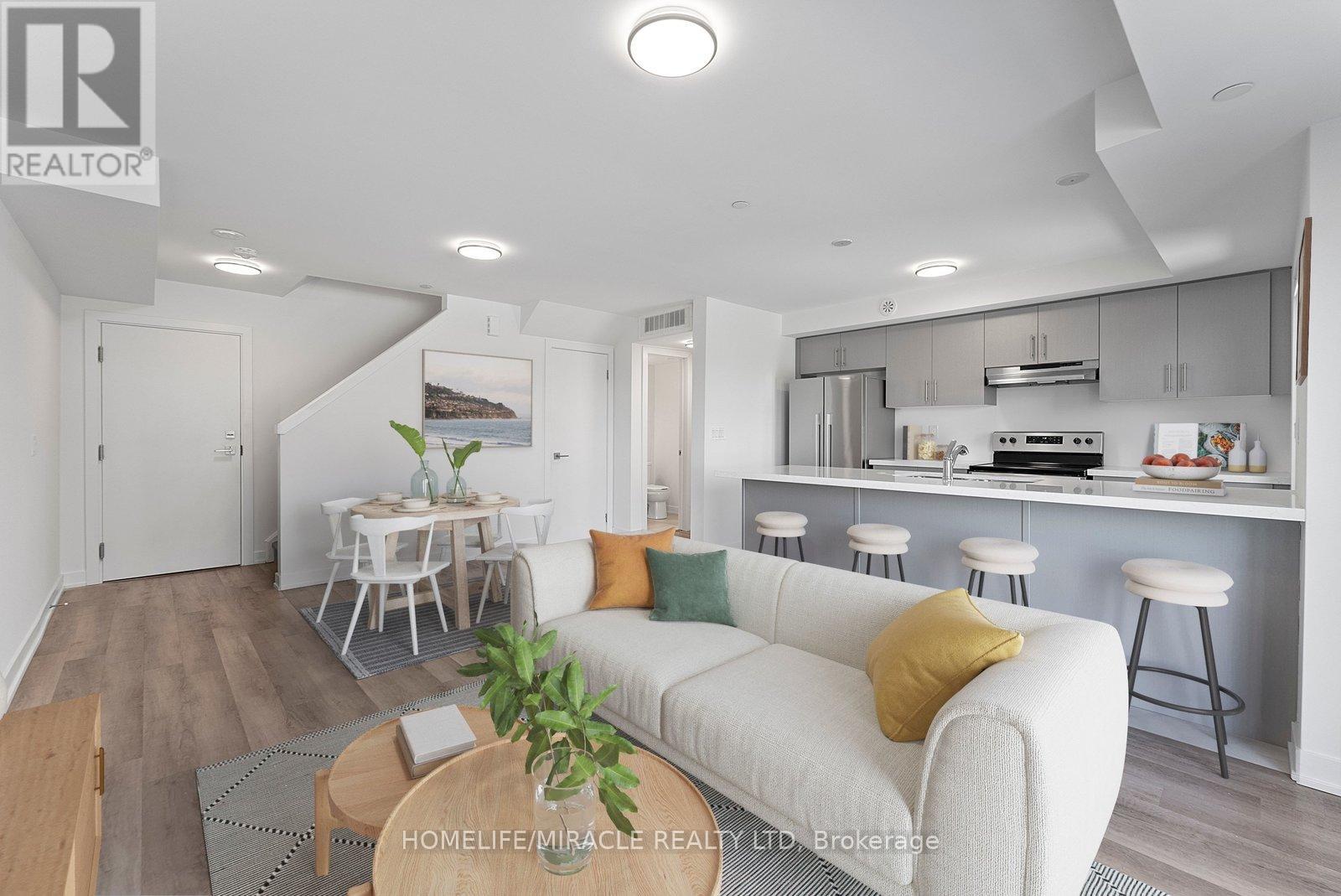 Discover this stunning modern townhouse featuring a stylish brick exterior and a bright, open-concept layout with 2 bedrooms, 2 bathrooms. The contemporary kitchen is equipped with quartz countertops and stainless steel appliances, while the private balcony offers a lovely spot to relax and enjoy the view. Located in a highly sought-after neighborhood, this home is close to banks, daycare, shopping plazas, Mount Pleasant GO Station, schools, soccer fields, and parks everything you need just minutes away! An ideal choice for first-time buyers, downsizers, or anyone seeking a low-maintenance lifestyle in a vibrant, family-friendly community. (id:64974)