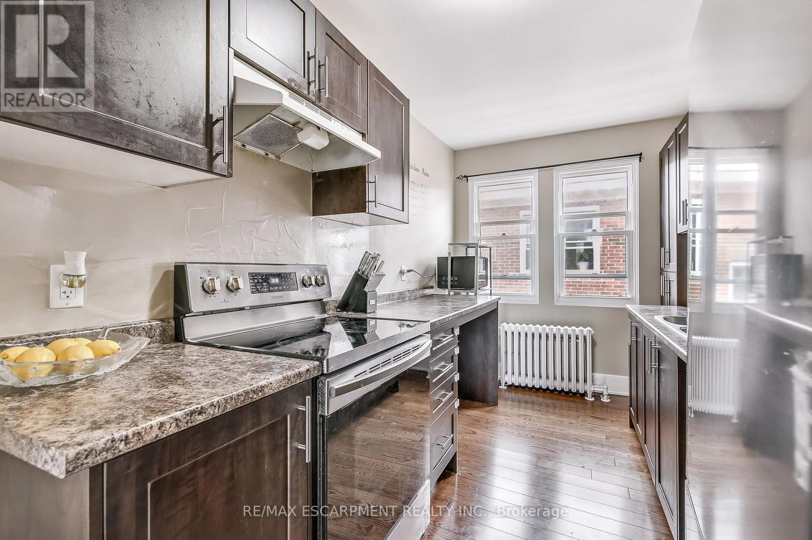 Fabulous 2 Bedroom Condo with Escarpment Views! Bright and spacious approx. 950 sqft. top-floor corner unit offering stunning west and south-facing views over the city and escarpment. This beautifully renovated condo features hardwood flooring throughout, a large sun-filled living room, separate dining area, and a functional kitchen with laundry hook-up. Enjoy two generous bedrooms and a full 4-piece bath. Permit parking available. Conveniently located close to walking trails, public transit, and St. Joseph's Hospital, perfect for professionals or downsizers seeking comfort and accessibility. (id:64974)