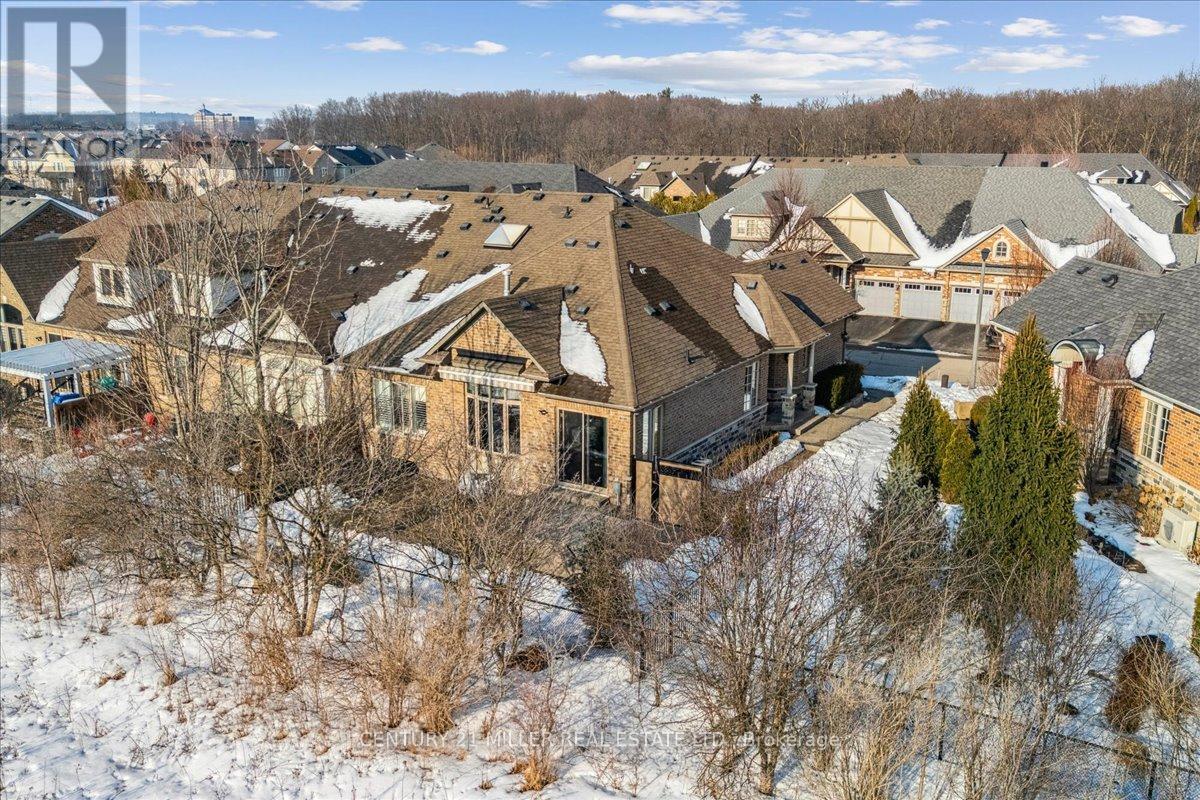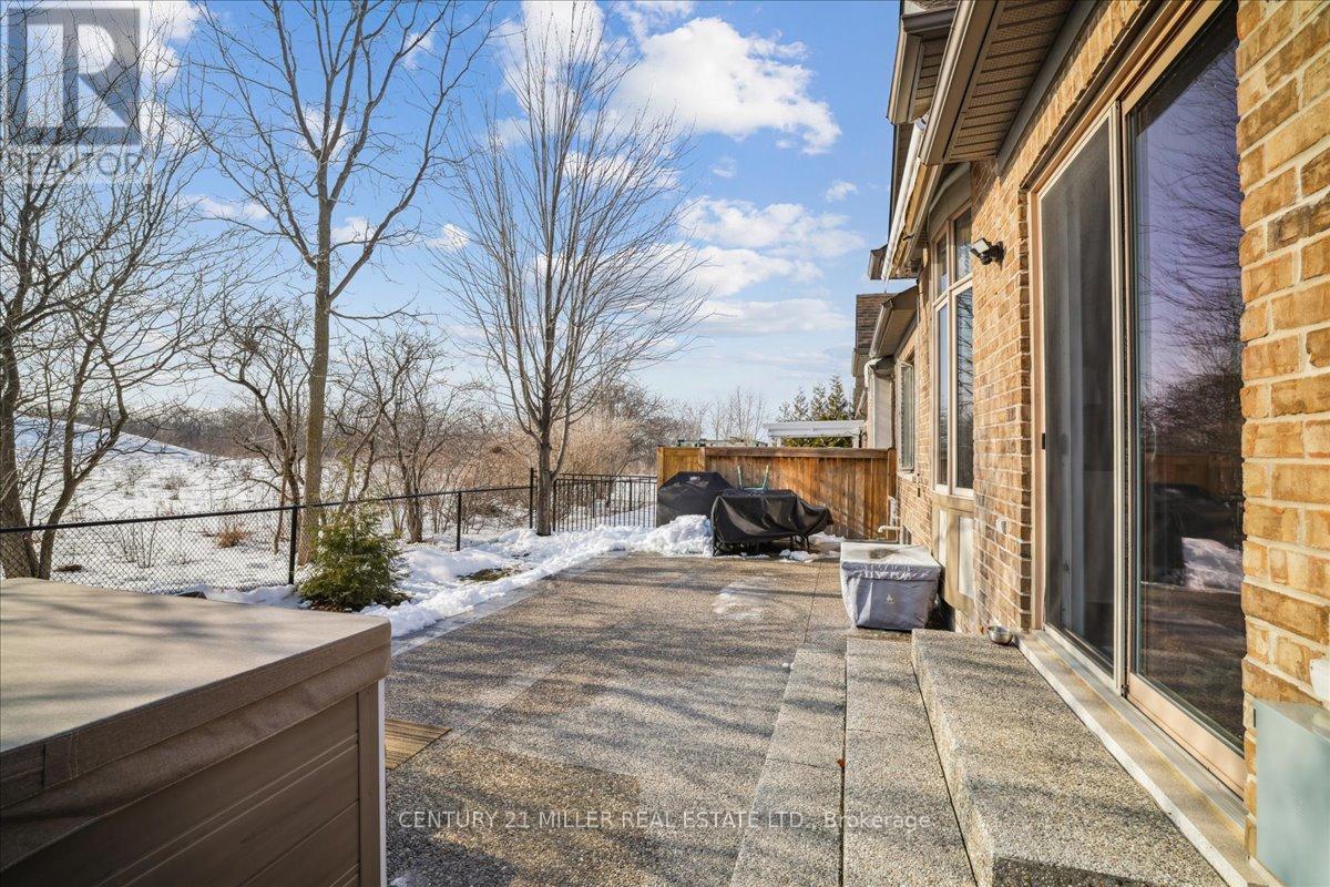 Tucked within an exclusive enclave, this rare and sought-after bungaloft offers premium sunset rear exposure overlooking Bronte Creek Provincial Park. With over 3,900 sq. ft. of bright, open living space, this executive family home showcases hardwood floors, pot lights, and upgraded fixtures throughout. A formal dining room with cathedral ceilings flows into the stunning living room with soaring ceilings and a gas fireplace, seamlessly connected to the designer kitchen featuring two-tone cabinetry, stainless steel appliances, granite counters, island with breakfast bar, backsplash, valance lighting, and walkout to a private yard with lush greenery and exposed aggregate patio. The main floor primary suite offers a walk-in closet, two-way fireplace, and spa-like ensuite with double sinks, soaker tub, and glass shower. A versatile second main-level bedroom or home office features semi-ensuite access to an updated 3-piece bathroom with heated floors, while the convenient main floor laundry enhances everyday functionality. Upstairs, a bright loft with skylight overlooks the living and dining areas below, along with an additional bedroom and a well-appointed 4-piece bath. The professionally finished lower level offers a spacious rec room with a separate family room area featuring an electric fireplace, a breakfast area, and a dedicated gym space, along with two additional bedrooms, a 4-piece bath, and a separate storage room. Double garage with inside entry, double driveway and exposed aggregate walkway. Close to hiking and biking trails, parks, schools, shopping. Minutes to Bronte GO Station, near Oakville Trafalgar Hospital and easy access to QEW and 407. Furnace (2020), and owned water heater. (id:64974)