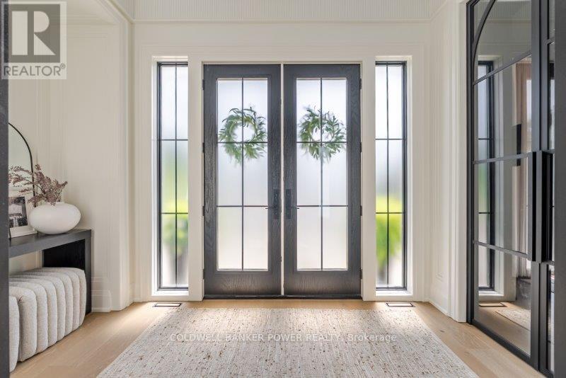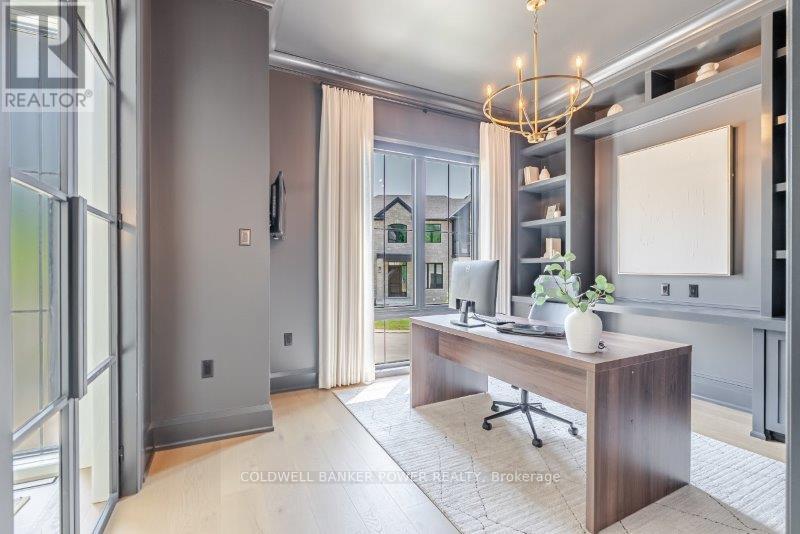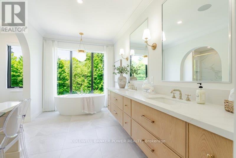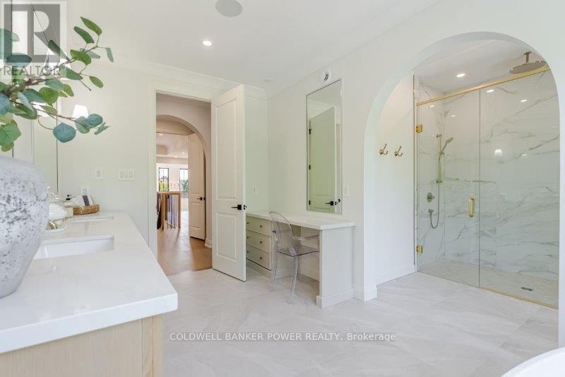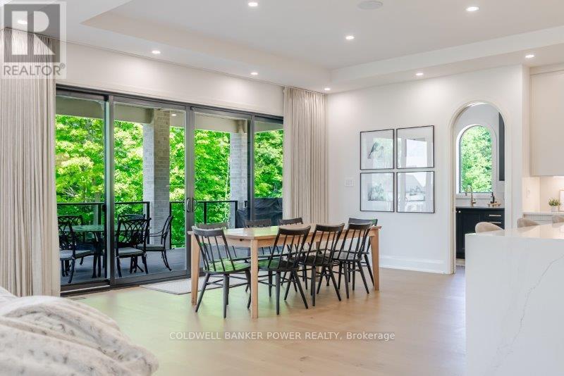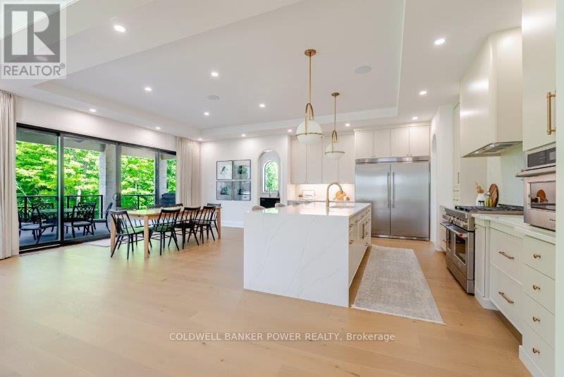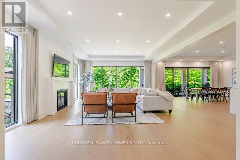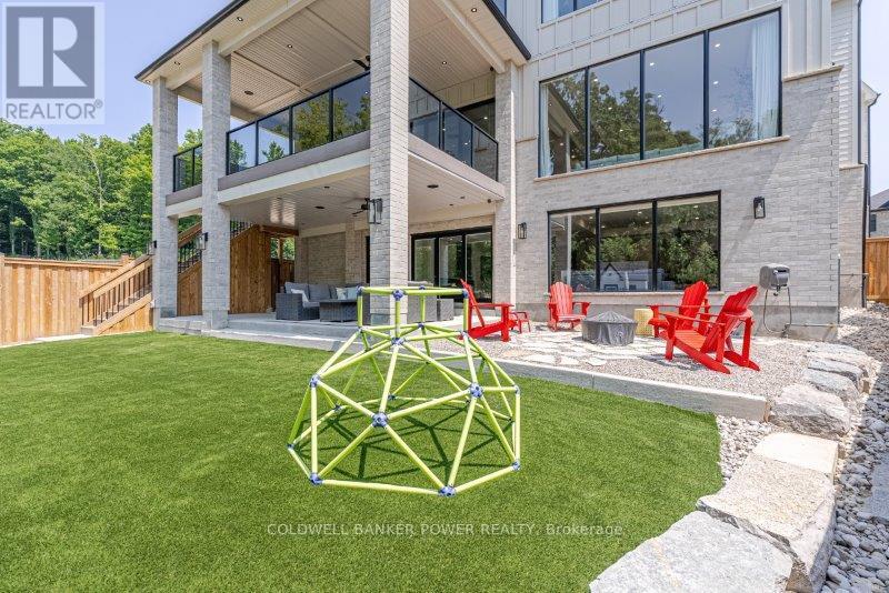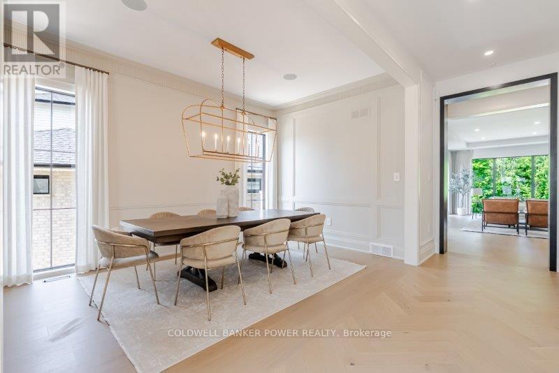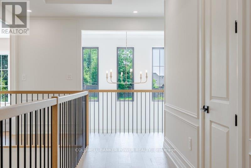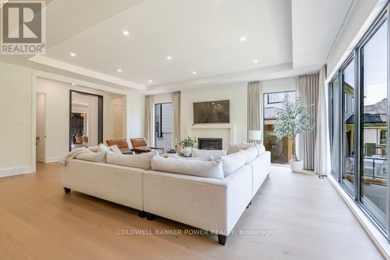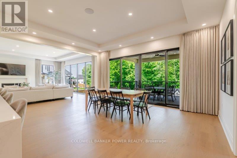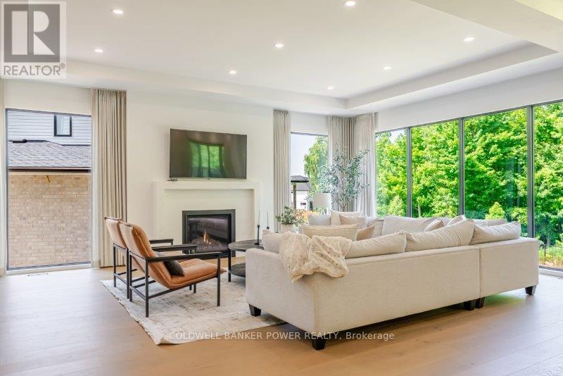 Prepare to be amazed. This 2023 custom built home by MCR Homes is unlike anything else in London. A rare blend of striking architecture thoughtful design & finishes that raise the bar for luxury living. Set on a premium walkout lot backing onto protected green space the home delivers privacy elegance & breathtaking natural views from every angle. Stunning sight lines & finishes is something yo see in person!The front elevation is a showpiece of design with bold roof pitches precast banding & stonework that set the tone for the property. A landscaped front yard finished with low maintenance artificial turf provides a polished welcome that matches the homes exceptional presence.The grand foye rmakes an immediate statement w/ crown moldings detailed trim & a curved staircase over herringbone floors. Off the entrance the office features custom glass doors by Mark Deren built in cabinetry integrated audio & designer window treatments. The formal dining room is framed with coved ceilings.The family room is the center piece. Floor to ceiling windows capture views of the forest filling the space with light. A custom gas fireplace anchors the room. The kitchen crafted by Stoll Brothers includes solid wood cabinetry dovetail boxes high end appliances a large island & separate prep kitchen with walk in pantry. Expansive glass doors open to a covered composite deck for perfect indoor outdoor living.Upstairs 9 & 10 ft ceilings extend across 4 bedrooms each with hardwood walk in closets & access to 3 luxury baths. The primary suite spans the back with gorgeous views a spa inspired ensuite featuring picture window soaker tub curbless shower dual vanities & make up desk. Laundry includes custom built ins & a steamer unit.The finished W/out basement adds a home gym rec room wine cellar stone fireplace & guest suite w: ensuite. Sliding doors lead to a landscaped yard with artificial turf saltwater pool & multiple seating areas. (id:64974)