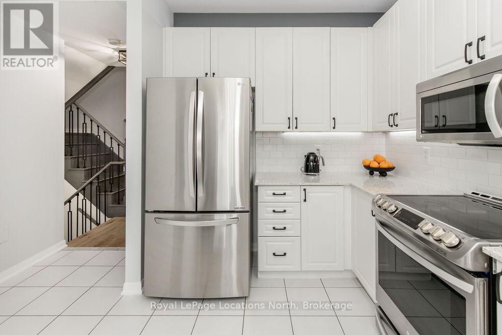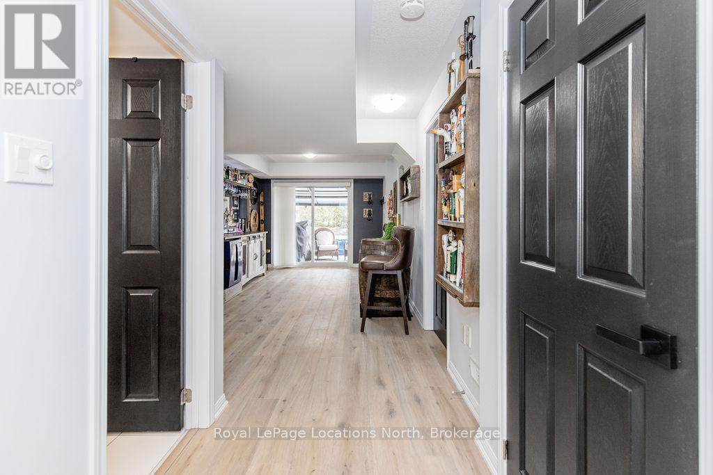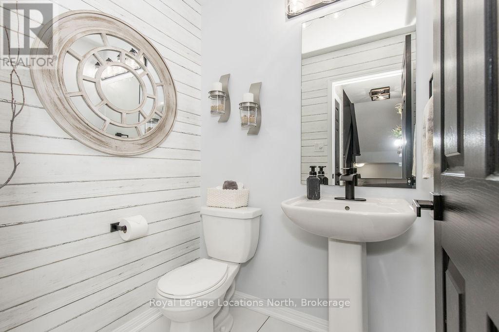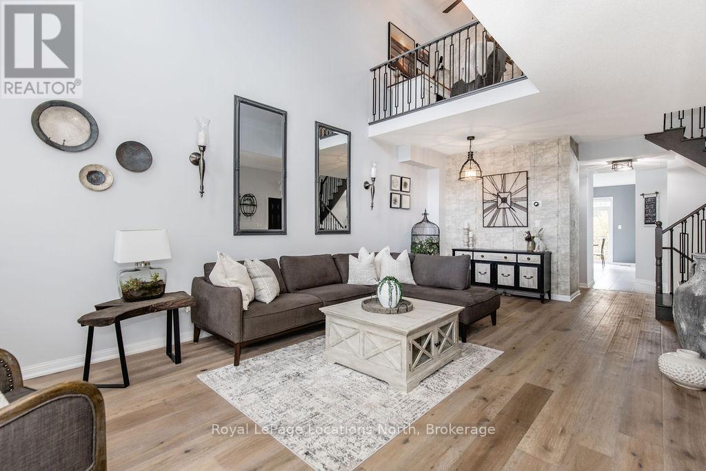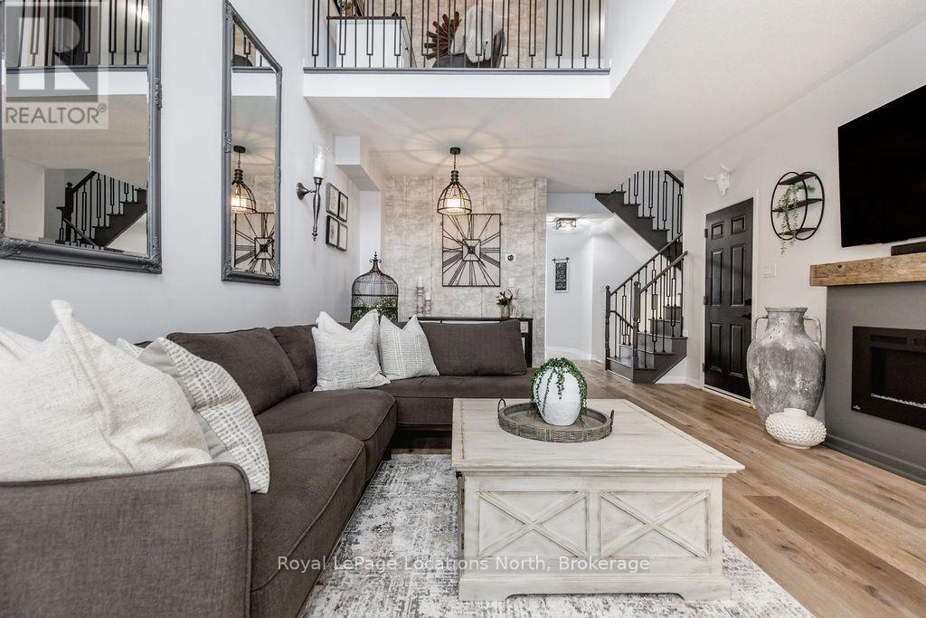 Maintenance-free living in a sought-after golf course community. A covered front porch welcomes you into the main floor, featuring engineered hardwood flooring, high ceilings, and a bright, open-concept layout with a living room centered around a fireplace. The kitchen offers granite countertops, stainless steel appliances, a skylight for added natural light, and a walkout to a private deck overlooking green space.The main floor primary bedroom includes a walk-in closet and a 4-piece ensuite with custom shower. The second level features a loft-style space suitable for a home office or additional living area, along with a spacious bedroom and a 4-piece bathroom. The finished walkout basement provides additional living space with a rec room, games room, bedroom, full bathroom, and access to the backyard.Additional features include an owned reverse osmosis system, and inside entry from the garage. Low-maintenance living with exterior maintenance(roof, windows) snow plowing, grass cutting, landscaping and common elements included. Located in a desirable community close to golf, trails, and local amenities, plus exciting growth in the area including a new high school, the twin-pad arena, and a modern library and event space bringing even more convenience and community life to Wasaga Beach. (id:64974)