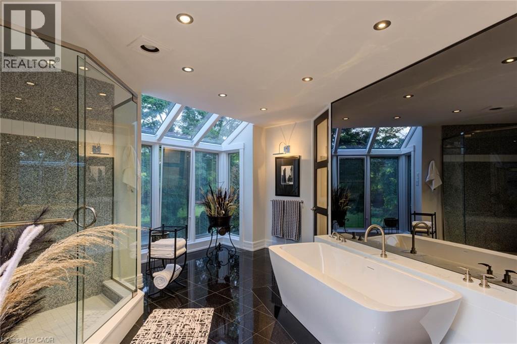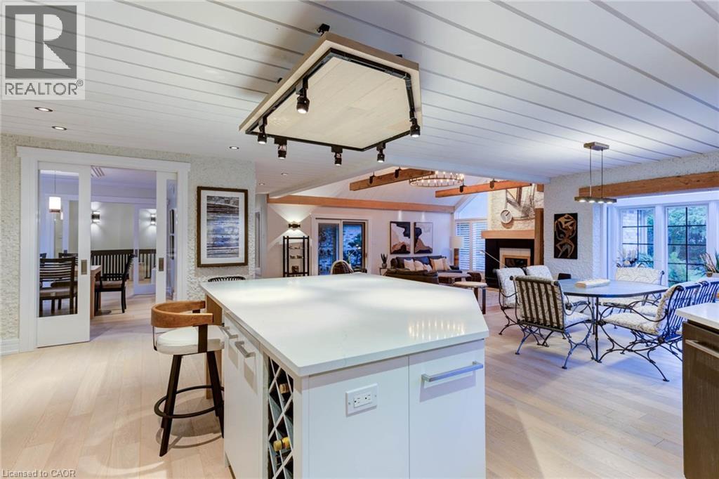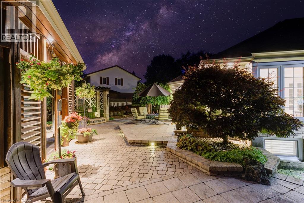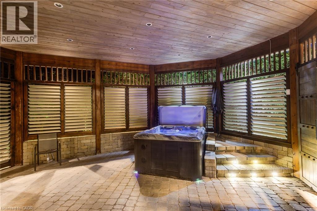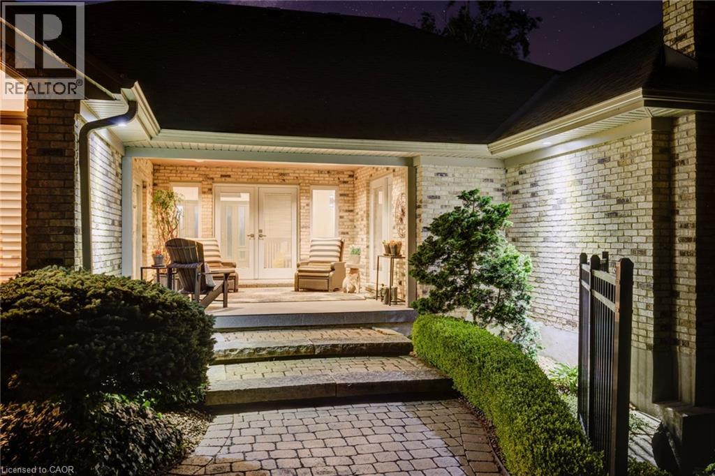 Luxurious Multi-Generational Living in Heidelberg. This custom-built bungalow blends West Coast Boho flair with rustic modern elegance, offering over 6,435 sq. ft. of extraordinary living space. Tucked away on a desirable private street just minutes from St. Jacobs Farmers’ Market and North Waterloo, this expansive home is designed for both lifestyle and comfort. The oversized double-car garage provides direct access to a fully finished in-law suite—ideal for multi-generational living or hosting guests. A grand foyer opens to an airy layout with a formal dining area and a sunken great room featuring vaulted ceilings, custom beams, and a wood-burning fireplace, all overlooking the chef-inspired kitchen with a spacious island. A tucked-away laundry room and powder room add convenience. The main level offers three bedrooms/home office options, including a primary retreat with its own fireplace and a stunning atrium-inspired ensuite filled with natural light. Three full bathrooms complete this floor. The walkout lower level has been newly updated with lighter paint, a wet bar, desk area, and modern finishes, enhancing its potential as a private suite. It includes an additional bedroom, full bathroom, and versatile living space. Outdoors, the beautifully landscaped yard is a true sanctuary with rock gardens, perennials, fire pit, waterfall, gazebo, and hot tub. With three separate patios, a shed with gas hookup, and a yard with pool potential, the possibilities for entertaining and recreation are endless. Gas lines for a BBQ or heater are already in place. A home of unparalleled character and function—this one is a must-see. Book your private showing today! (id:64974)