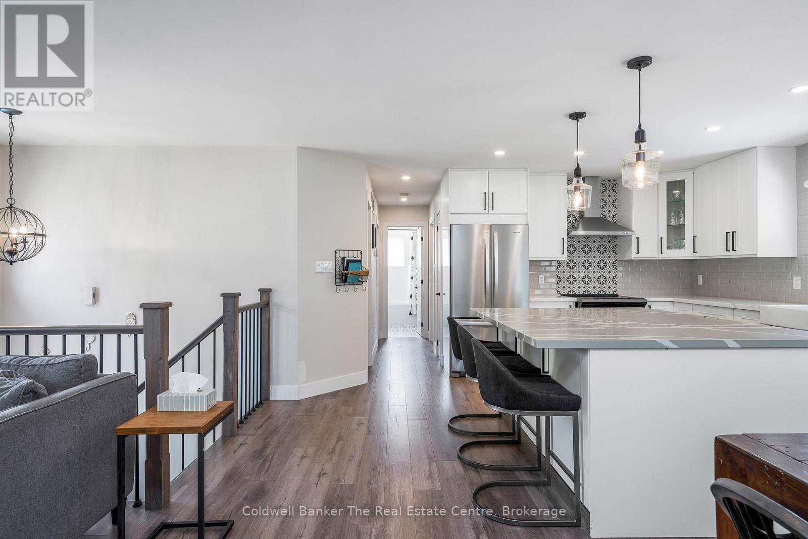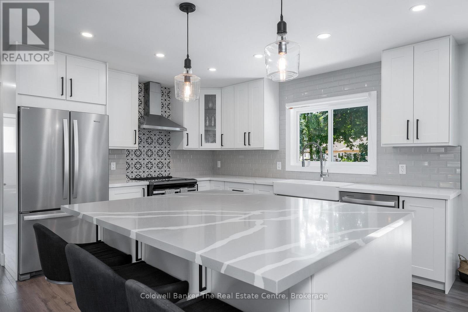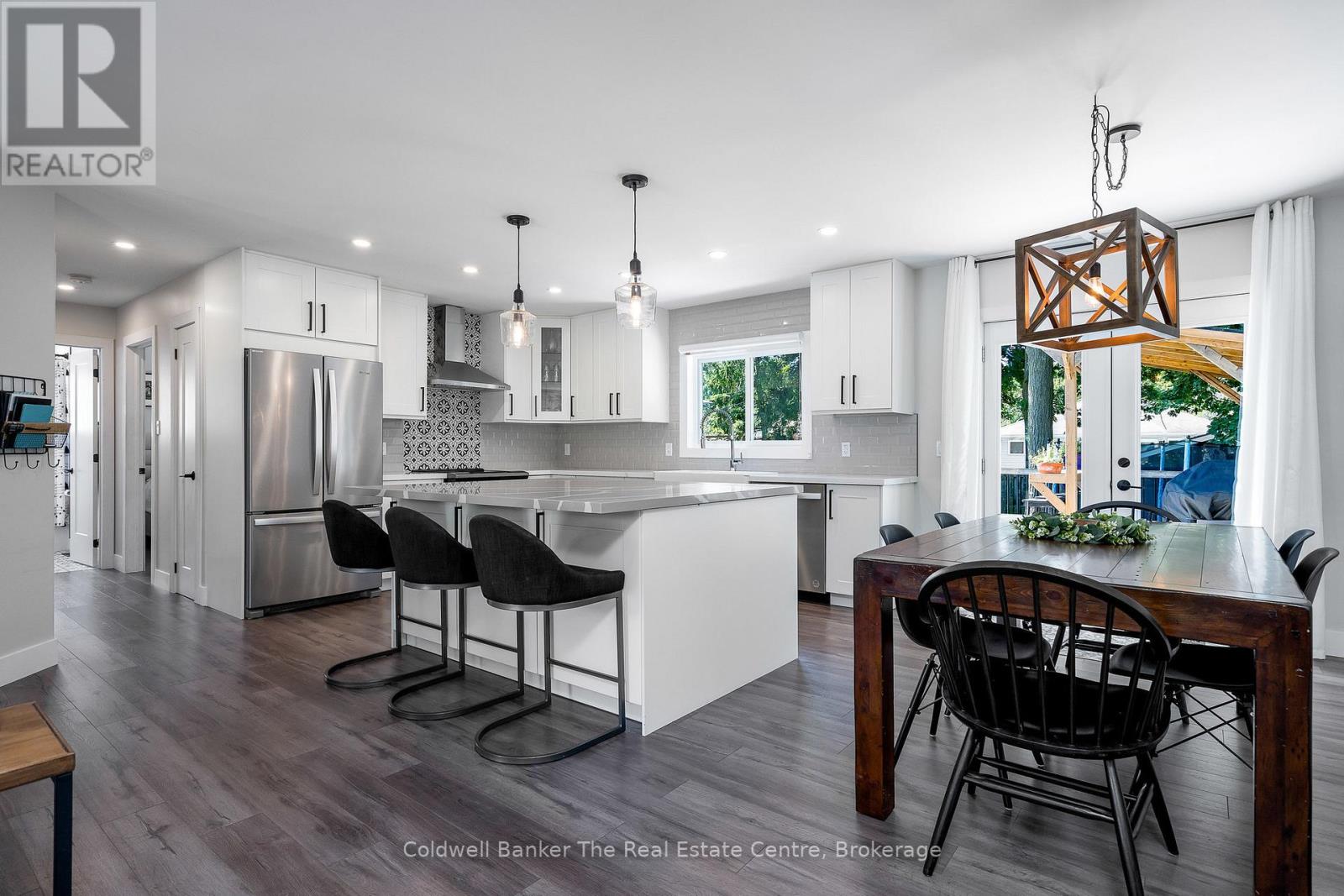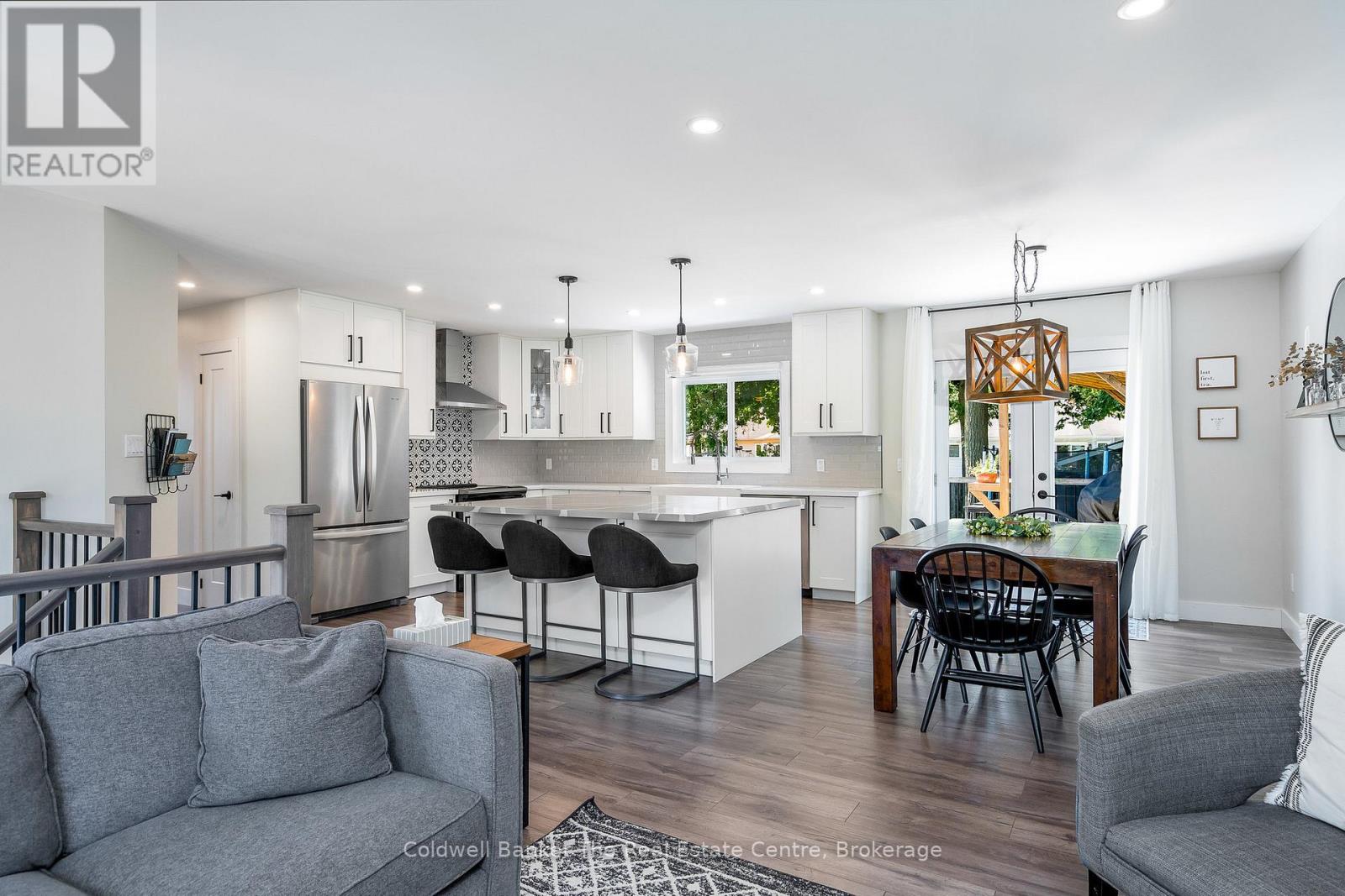 Welcome to this fully renovated raised bungalow nestled in a mature, family-friendly area of Wasaga Beach. Surrounded by tall, established trees and set in a quiet, convenient location, this home offers the perfect balance of comfort, style, and lifestyle amenities. The property features three well-appointed bedrooms on the main floor and a bright, open-concept layout designed for modern living. The heart of the home is the newly renovated kitchen, showcasing a large quartz island, updated cabinetry, and contemporary finishes-ideal for cooking, gathering, and entertaining. This space flows effortlessly into the main living and dining areas, creating a warm and inviting environment filled with natural light. This home has been thoughtfully updated throughout, including new electrical completed in 2019 and new windows installed in 2021 and 2022, providing improved efficiency and peace of mind. New Garage Door 2019 with R16. New shingled roof 2016, Updated Furnace 2014. The finished basement extends your living space with a cozy fireplace, perfect for relaxing evenings or hosting guests. There's also a generous workout area, providing flexibility for fitness, hobbies, or additional family space. Outside a large backyard deck that's perfect for BBQs and outdoor dining, along with a practical storage shed for tools and seasonal items. Home is located within walking distance to parks, beaches, shops and restaurants, perfect location for families, retirees and investors. (id:64974)