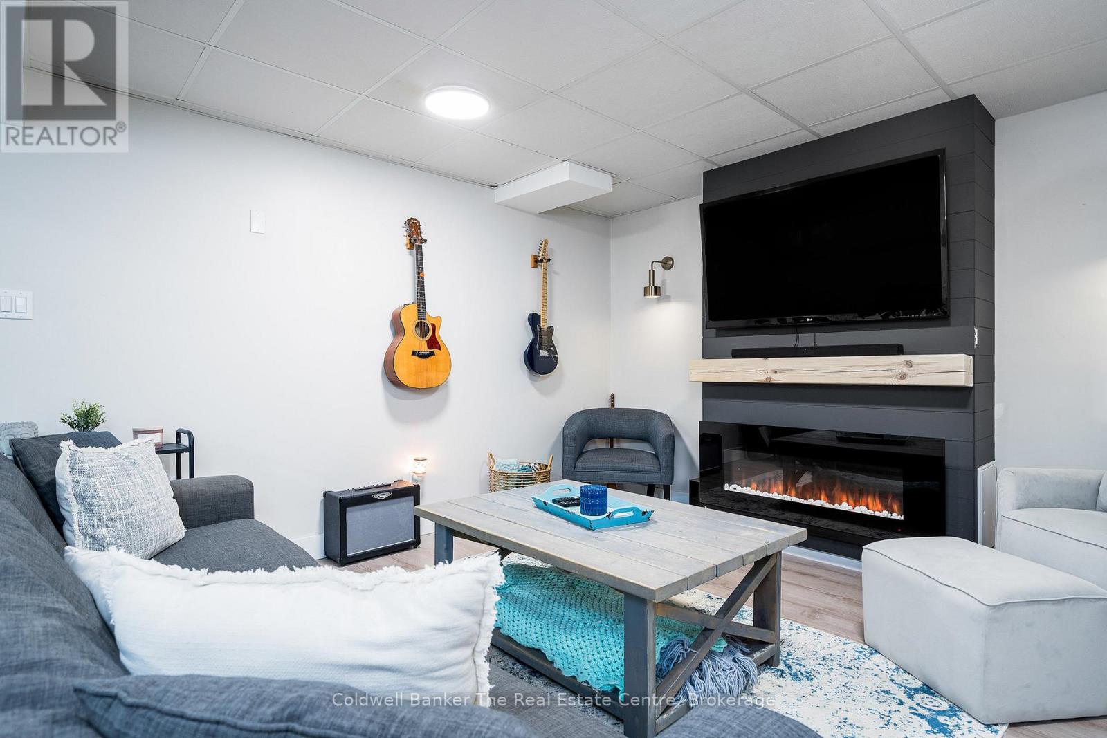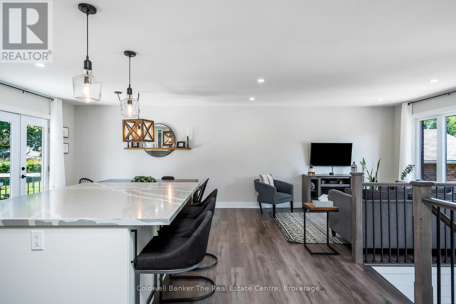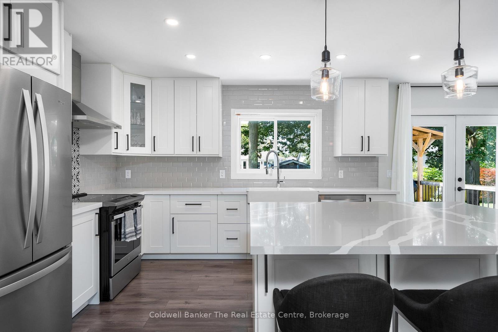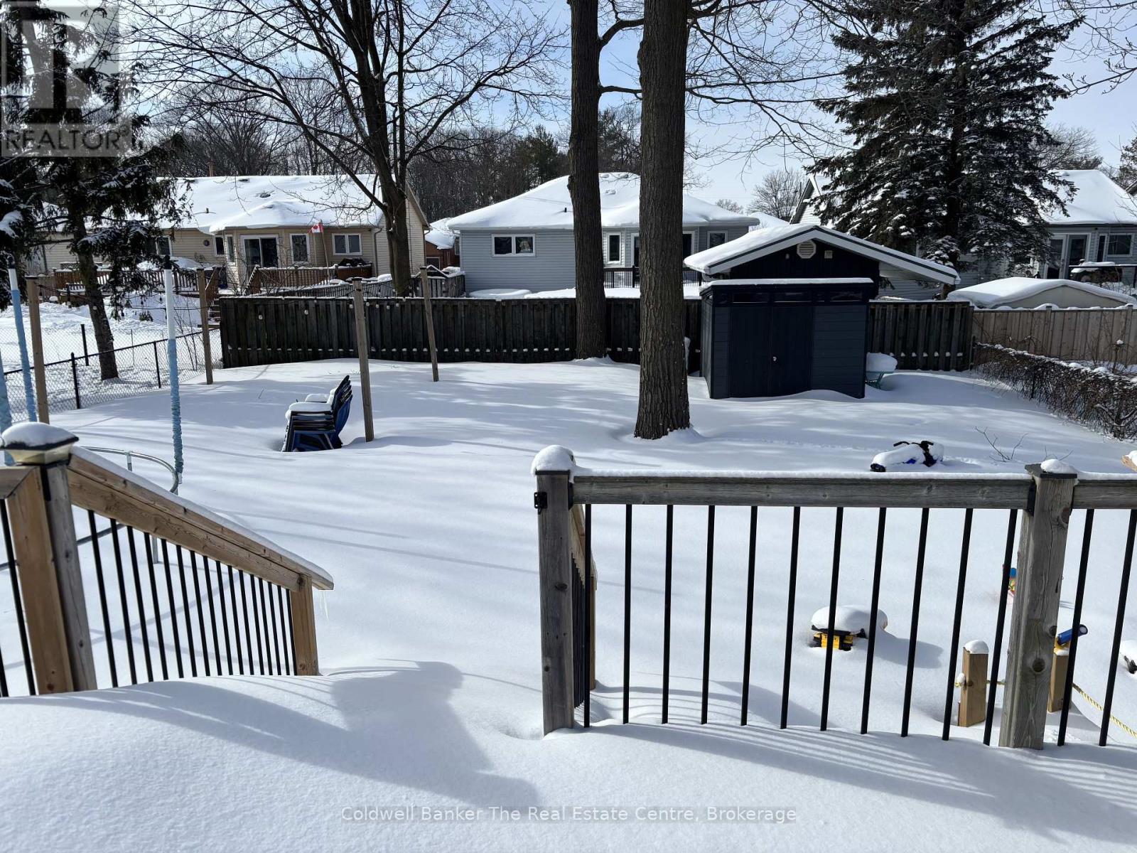 Welcome to this fully renovated raised bungalow nestled in a mature, family-friendly area of Wasaga Beach. Surrounded by tall, established trees and set in a quiet, convenient location, this home offers the perfect balance of comfort, style, and lifestyle amenities. The property features three well-appointed bedrooms on the main floor and a bright, open-concept layout designed for modern living. The heart of the home is the newly renovated kitchen, showcasing a large quartz island, updated cabinetry, and contemporary finishes-ideal for cooking, gathering, and entertaining. This space flows effortlessly into the main living and dining areas, creating a warm and inviting environment filled with natural light. This home has been thoughtfully updated throughout, including new electrical completed in 2019 and new windows installed in 2021 and 2022, providing improved efficiency and peace of mind. New Garage Door 2019 with R16. New shingled roof 2016, Updated Furnace 2014. The finished basement extends your living space with a cozy fireplace, perfect for relaxing evenings or hosting guests. There's also a generous workout area, providing flexibility for fitness, hobbies, or additional family space. Outside a large backyard deck that's perfect for BBQs and outdoor dining, along with a practical storage shed for tools and seasonal items. Home is located within walking distance to parks, beaches, shops and restaurants, perfect location for families, retirees and investors. (id:64974)