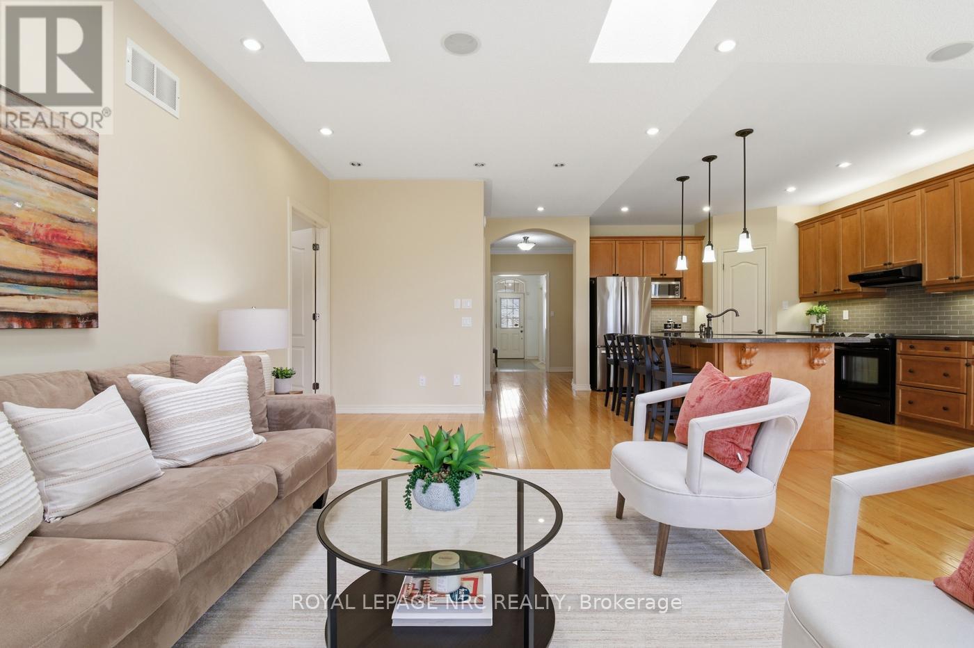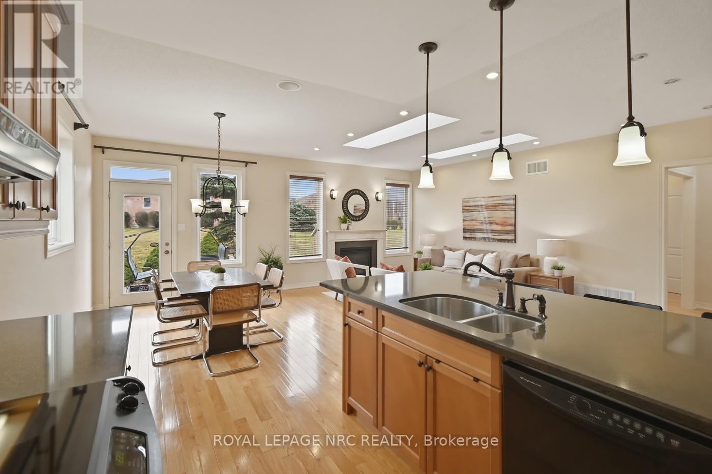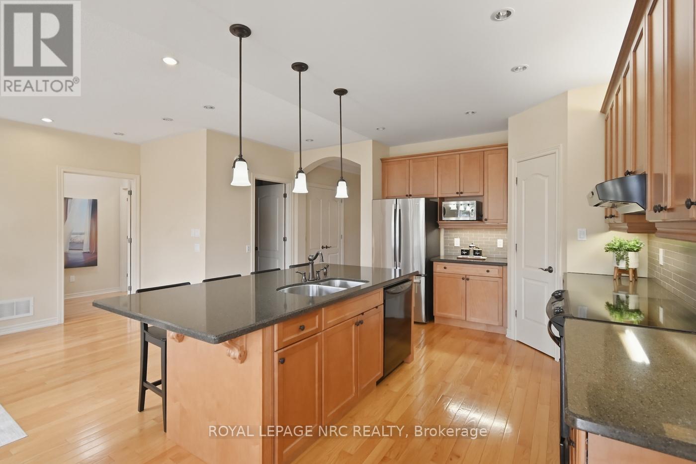 Absolutely wonderful! This end unit townhome was the model home! The upgrades and design are evident the second you pull into the double driveway. From the enchanting curb appeal of the stone work and front patio, to the exquisite interior the quality is impressive. This meticulously maintained end unit rests on a pie shaped lot with plenty of yard space to enjoy your summer months here. This great community has a clubhouse with sweet amenities including an indoor saltwater pool, hot tub, sauna, library, large party room with kitchens, pickle ball courts, tennis courts, and work out facilities. The monthly association fee of $300 covers monitored home security, snow removal all the way to your front door, grass cutting and trimming, and access to the community centre. Your first glimpse inside reveals the extra wide hallway and large foyer. The terrific vaulted ceilings, open concept and wide hallways show off this spacious home. You'll feel like you are in a detached home with the ease of a townhome. The end unit, of course provides loads of natural light throughout. Two full bathrooms on the main are great for guests. The front bedroom could also be a main floor office or dedicated dining room. Smart hardwoods throughout the main floor for easy cleaning and freshness. The spacious kitchen/great room is an excellent place for entertaining. Appliances included. If more space is what you need for all your hobbies, this lower level with its high ceilings is just what you dreamt about. A rec room with its own gas fireplace and two more bedrooms are a great place for guests. An open bonus office space will keep all your work are out of sight, with yet loads more space in the utility room as well as the furnace room! You won't feel like you are downsizing here, rather, you can simplify, lock and go, and still have the space you had in your detached home, with the perks of this great community and clubhouse. (id:64974)