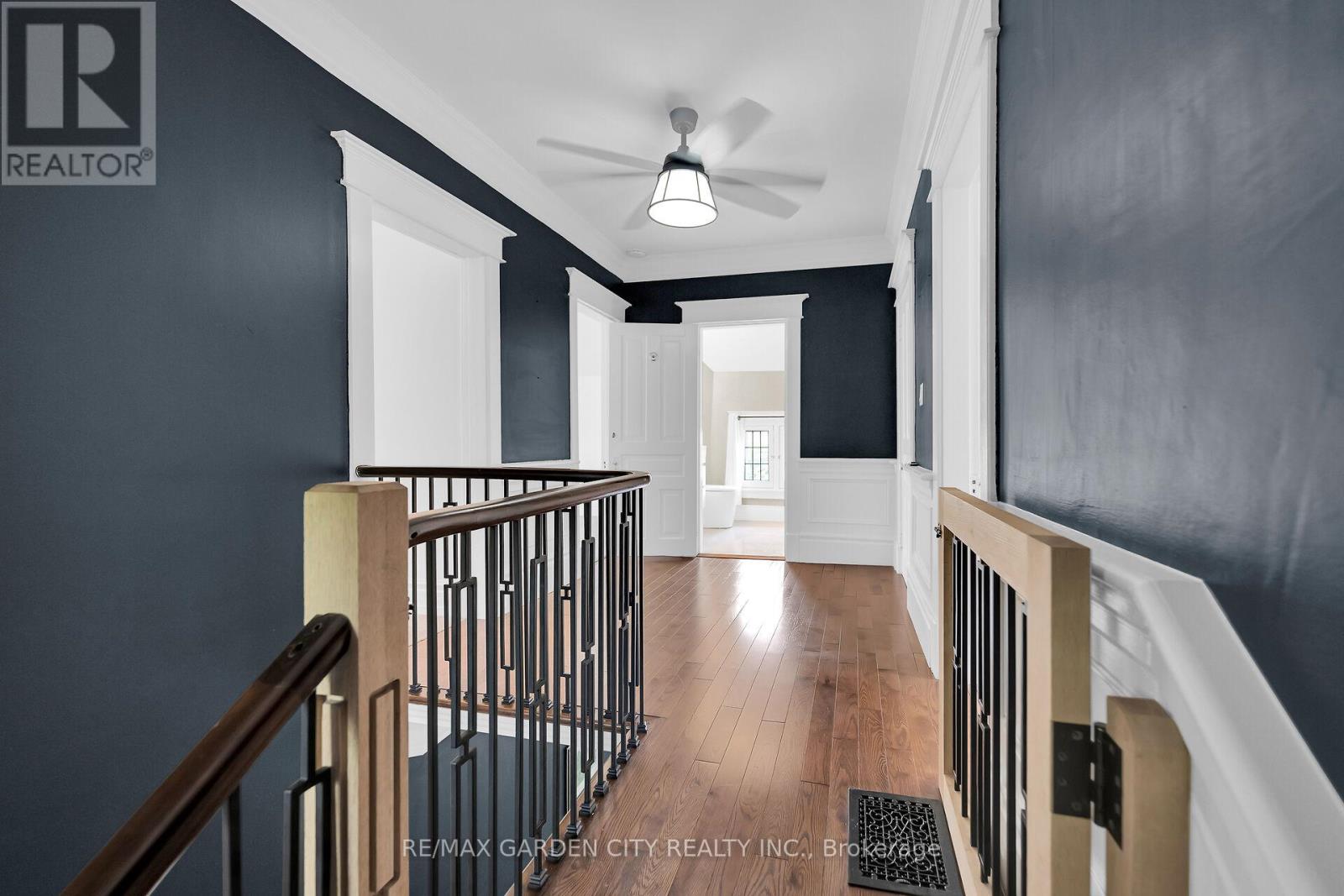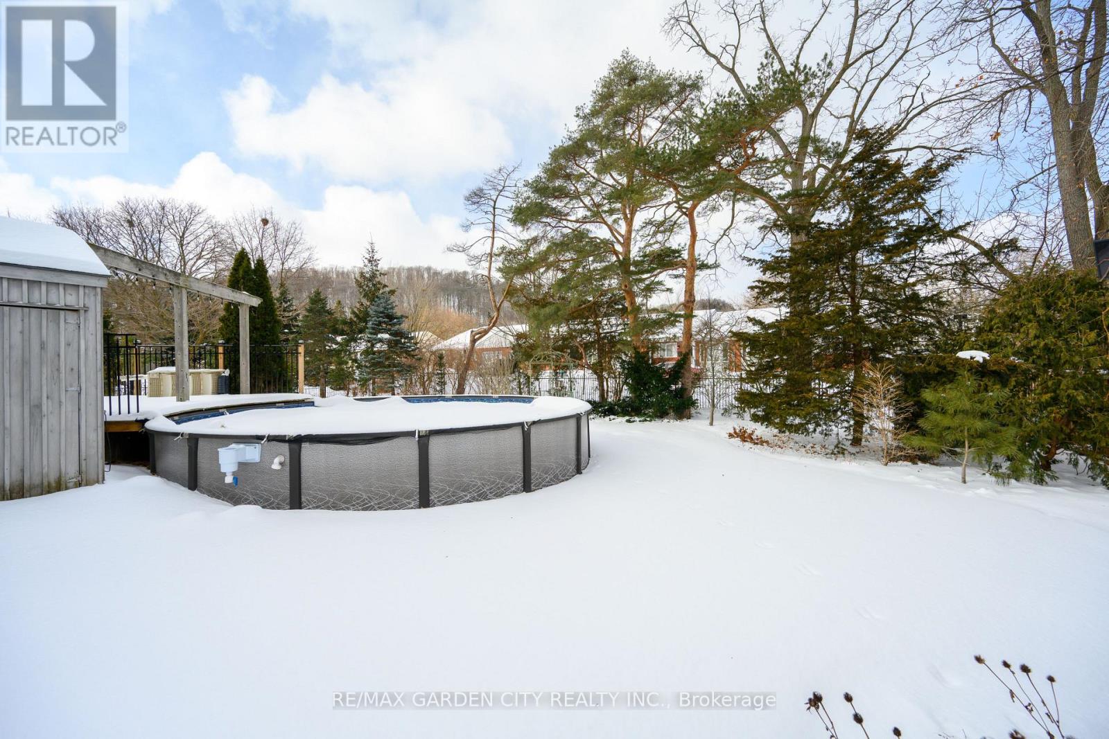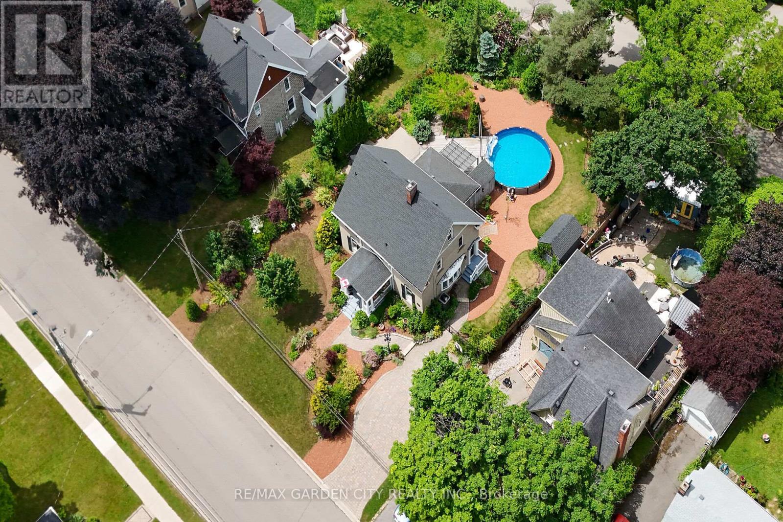 STATELY 2 1/2 STORY GEORGIAN STYLE DESIGNATED HISTORICAL HOME. Built in 1905, known as the Helen Gibson House. Located on large property in the heart of the downtown core on quiet tree-lined street below the escarpment among other character homes. Beautifully updated throughout! The front of this home is graced by the impressive neo-classical vaulted portico with pillars. Spacious foyer opens to large family room with newly installed wood burning fireplace insert in 2023 and oversized leaded glass bay window to bring in the light. Formal dining room with leaded glass windows overlooking the gardens. New kitchen installed in 2023. Main floor laundry, 2PC bath, main floor den/office with wall-to-wall bookcases. Double sliding doors lead to deck, patios & backyard oasis complete with pool & gazebo. Open staircase to upper-level leads to primary bedroom with walk-in closet & ensuite bath. Two additional bedrooms & bath. Second staircase leads to attic (764 square foot space) great potential to create extra living space. OTHER FEATURES INCLUDE: hardwood floors, new roof shingles 2018, new above ground pool 2024, new hot tub 2024, stainless steel appliances in kitchen, washer/dryer, 2 1/2 baths, 200 amp service. Heat pump, A/C & new on-demand water heater (owned) 2023. Long interlock double driveway (fits 4 cars), EV charger, walkway & patios. Two garden sheds. Perfectly situated a block from the downtown core and a short stroll to the Bruce trail & park. This heritage home is surrounded by its award-winning gardens. Calling all historians: It will take only one visit for you to fall in love with this rare offering! (id:64974)