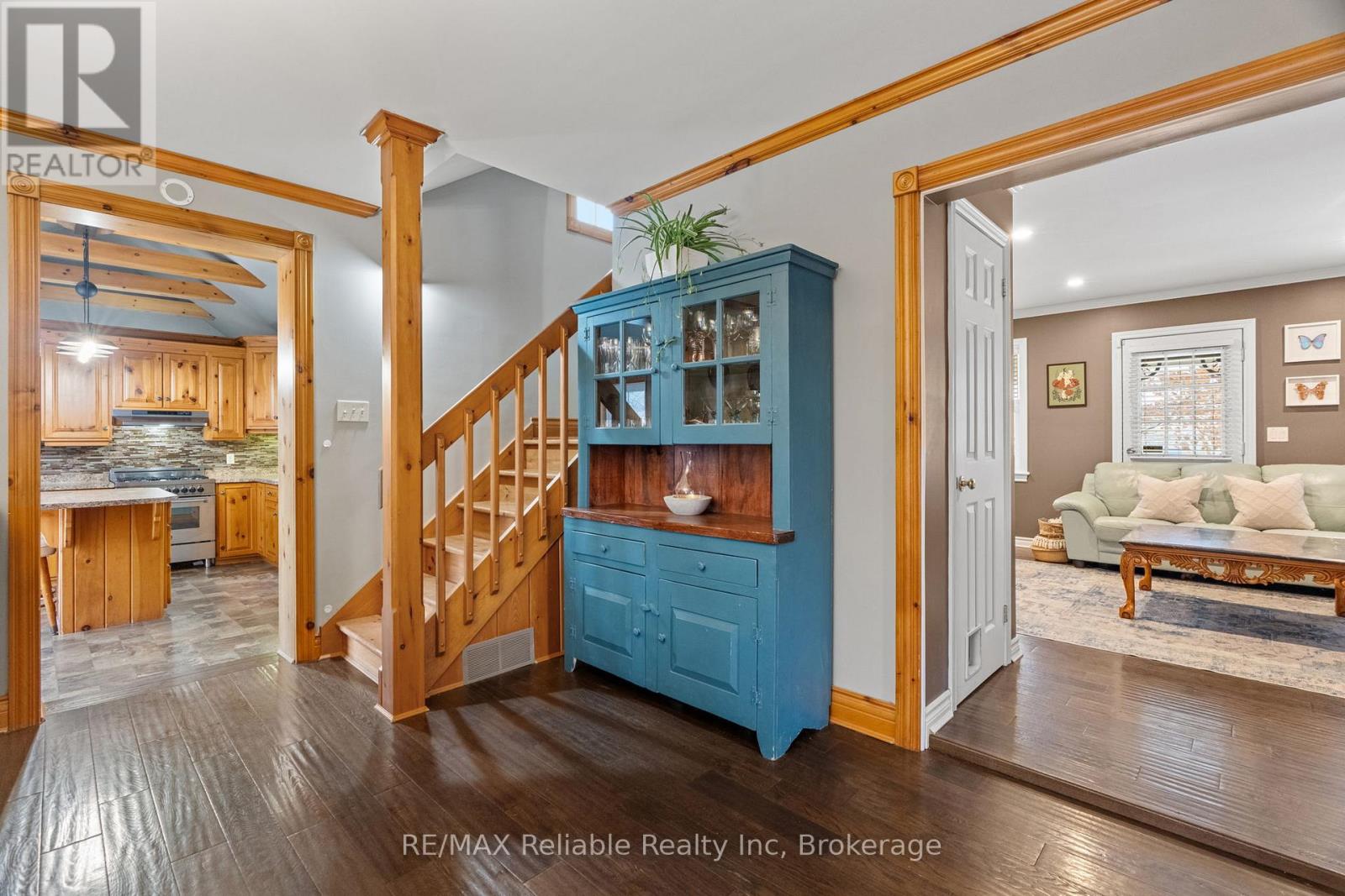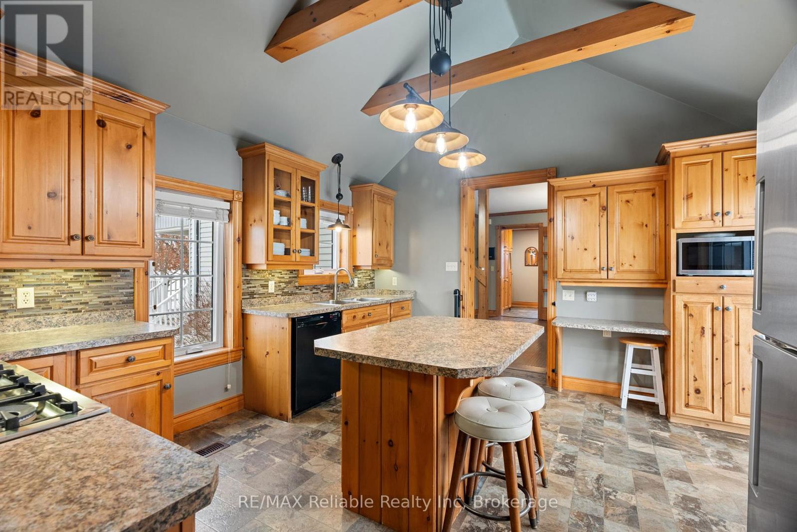 Welcome to this charming, move-in-ready home that's truly cute as a button! Start your mornings with coffee on the wraparound porch and unwind in the evenings in your private, beautifully landscaped backyard. This home blends character and style with a functional layout designed for comfortable living and effortless entertaining. Ideally located in a walkable, small-town setting, the main level features a spacious living room with a cozy gas fireplace and a generous dining room perfect for hosting family and friends. The standout kitchen offers ample cabinet space, a centre island, vaulted ceilings with exposed wood beams, and direct rear access to the deck, hot tub, and pergola. Upstairs, the inviting primary bedroom includes an ensuite with a relaxing soaker tub, while two additional bedrooms make this an ideal family home. Don't miss your chance to own this special property-book your showing today! (id:64974)