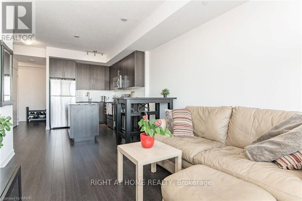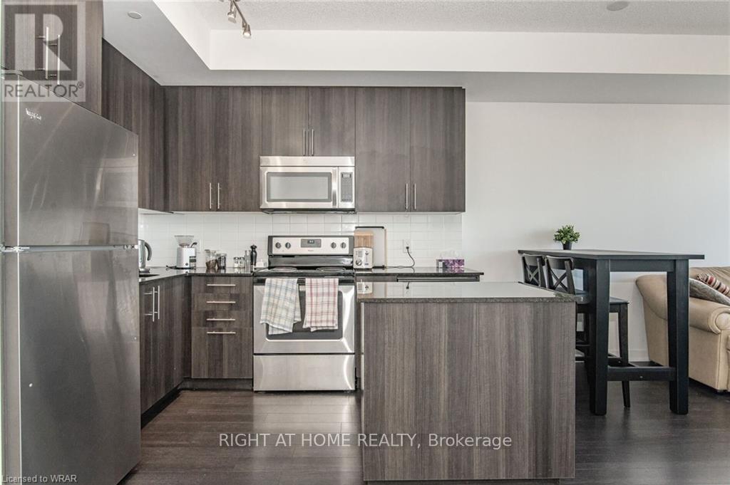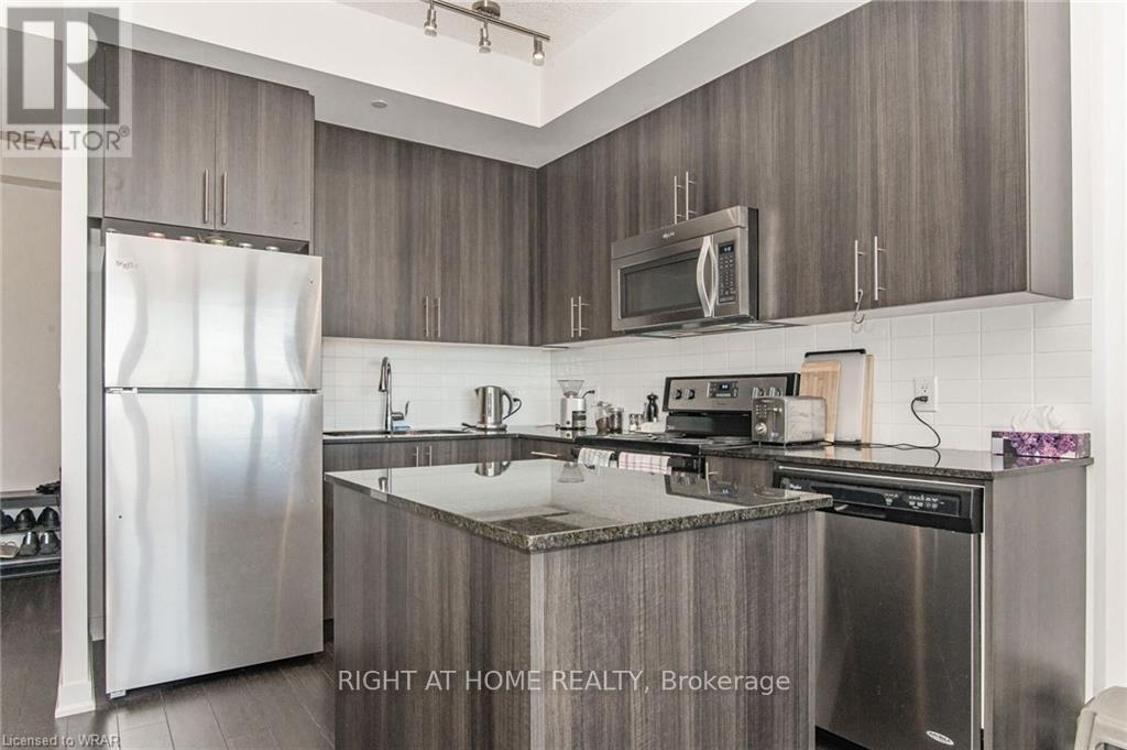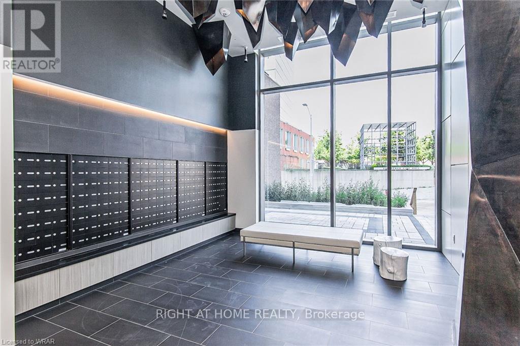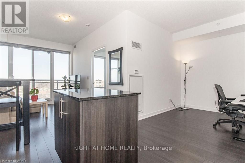 Welcome to this stunning, modern One Bedroom Plus Den In Downtown Kitchener. Elegant hardwood flooring and beautiful floor to ceilings windows. The living room is a versatile space, with walkout to your private balcony with excellent view. The den can be used as an office area or bedroom. Open to the living room is your kitchen, with stainless steel appliances, granite finishes and a spacious island. This condo has beautiful 9 foot ceilings and provides in-suite laundry. UnitComes With One Parking and One Locker. Steps public transit, LRT, Shops, Library, Victoria Park.Close To Go Stations And Tech Community (id:64974)