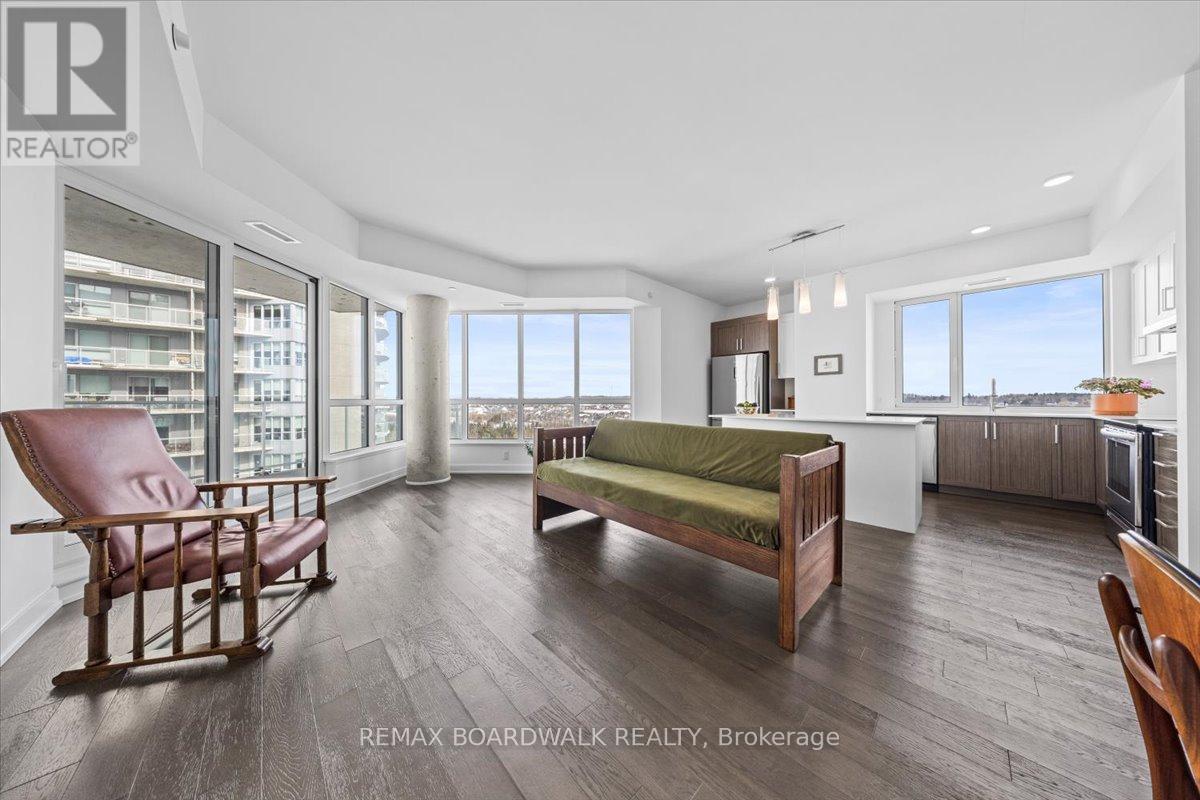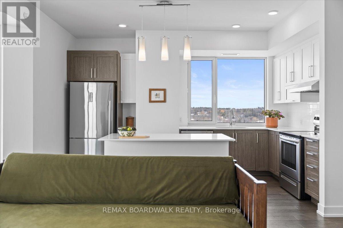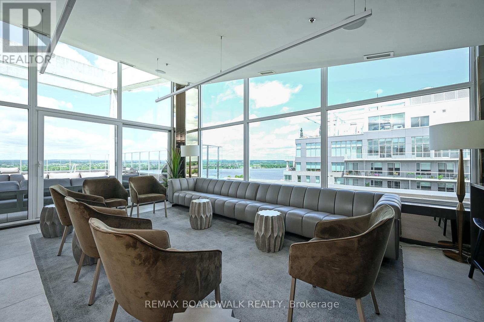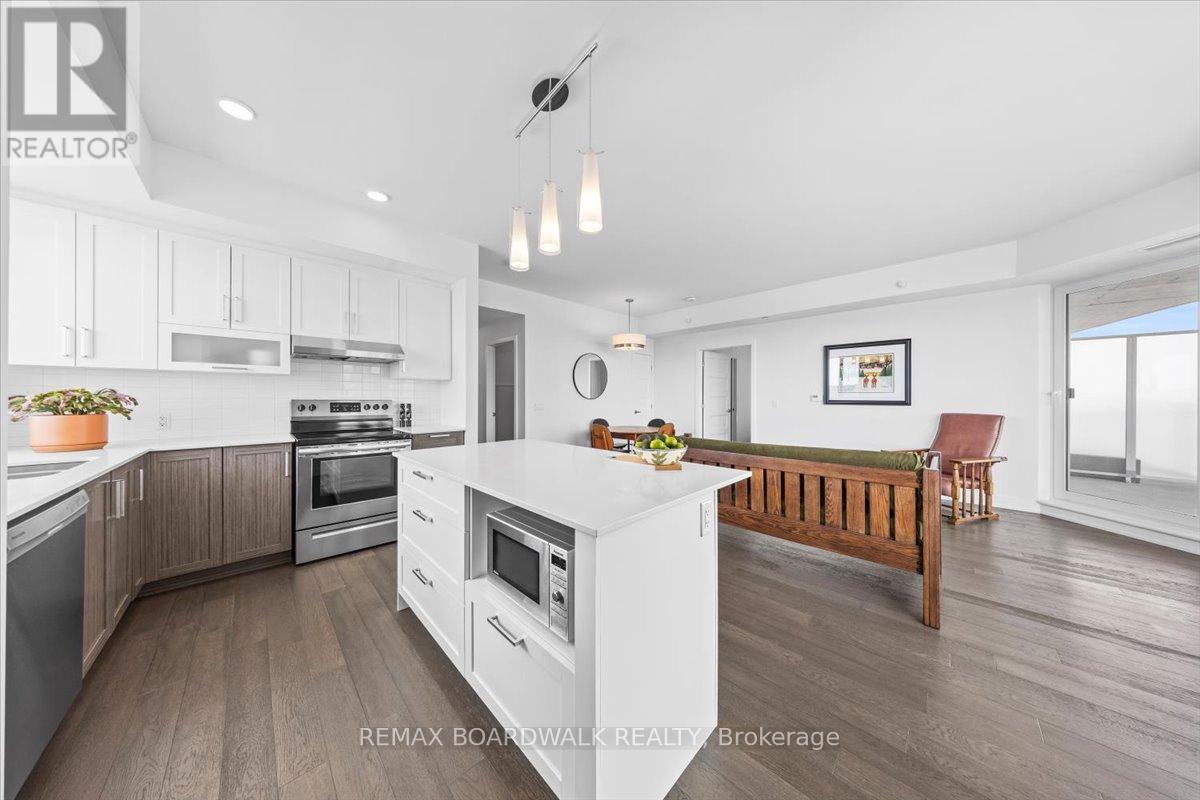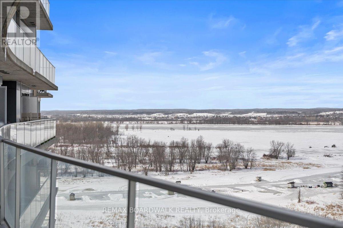 Architecturally composed corner residence w/dual covered balconies, southern exposure, & elevated Ottawa River views. This two-bedroom suite is thoughtfully designed for both form & function, offering refined materials & intentional spatial flow, 37.5" wide entry door introduces a welcoming foyer w/closet storage, setting a tone of accessibility & understated sophistication. Wide-plank engineered hardwood & oversized ceramic tile run throughout, complemented by flat ceilings, boxed baseboards, recessed pot lighting, & modern five-panel interior doors, centre-island kitchen anchors the living space w/quartz surfaces, breakfast bar seating, pot drawers, & two-tone shaker cabinetry w/integrated garage feature. A recessed double sink positioned beneath an oversized window captures natural light & river vistas. The living room's corner glazing frames panoramic water views & morning sun, while the dining area integrates a walk-in pantry for seamless entertaining, primary suite is designed as a private retreat w/its own patio door, walk-through double-sided closet, & a five-piece ensuite featuring twin vanities & a glass-enclosed shower w/rain head & European wand. The second bedroom offers a private balcony, walk-in closet, & pocket-door access to a three-piece cheater ensuite w/double-wide shower, allowing flexibility for guests or workspace, full-size laundry, a separate storage locker, & the rare inclusion of two underground parking spaces enhance livability & long-term value. Residents enjoy curated amenities including a fitness studio w/sunset views, an elegant lounge, rooftop pool, hot tub, & outdoor terrace w/BBQ area. All positioned to embrace the natural landscape of the Ottawa River. A residence defined by light, proportion, & elevated riverside living. 24 hour irrevocable on all offers. (id:64974)