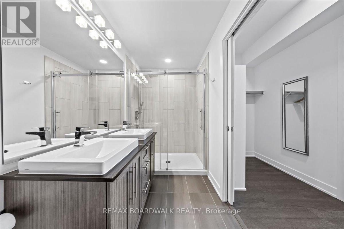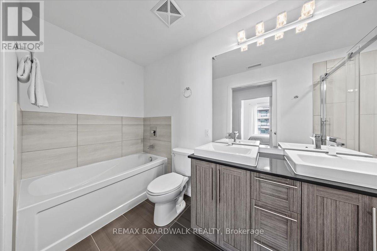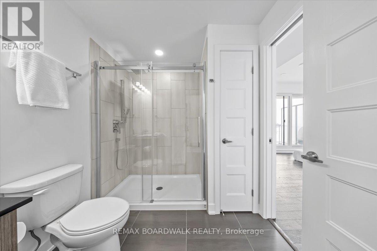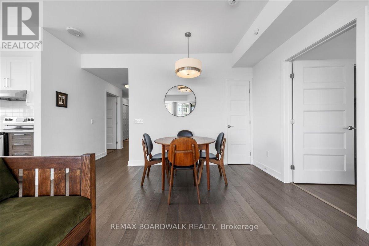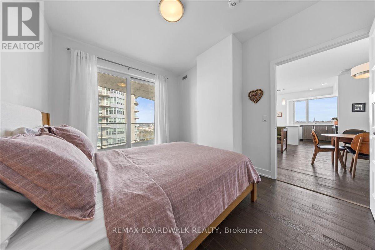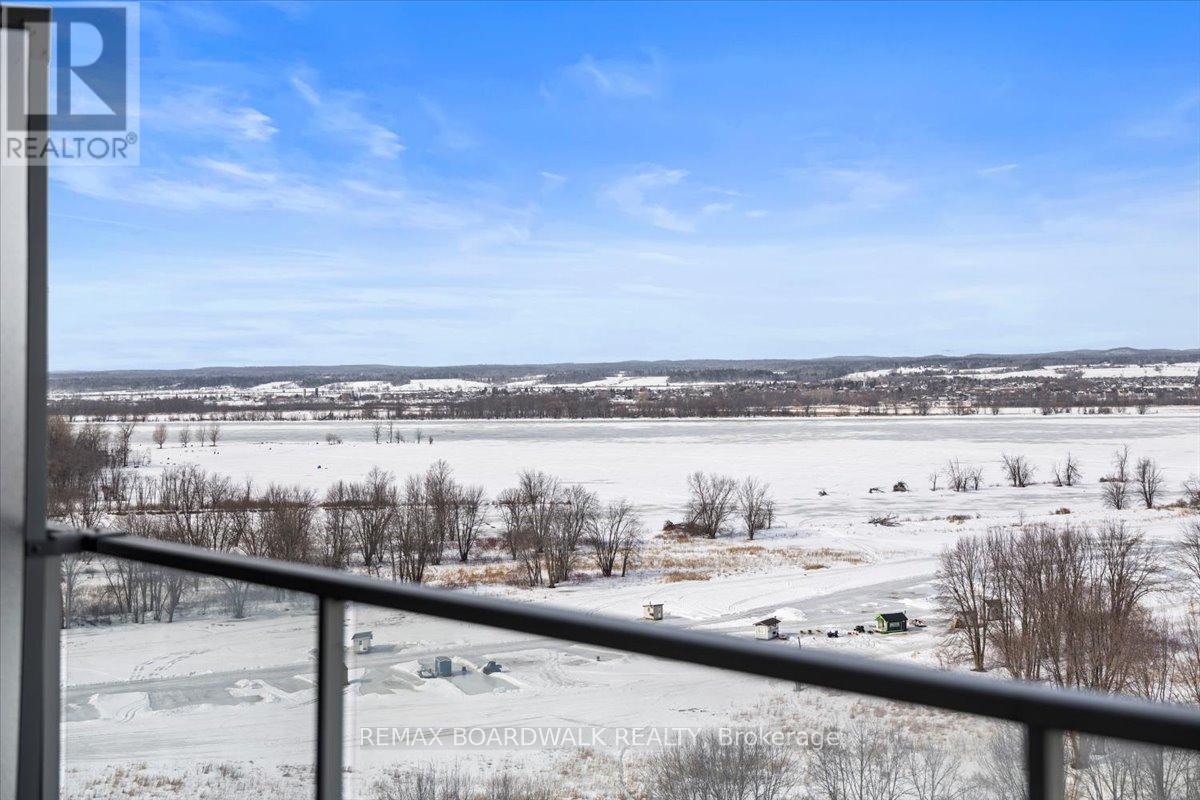 Architecturally composed corner residence w/dual covered balconies, southern exposure, & elevated Ottawa River views. This two-bedroom suite is thoughtfully designed for both form & function, offering refined materials & intentional spatial flow, 37.5" wide entry door introduces a welcoming foyer w/closet storage, setting a tone of accessibility & understated sophistication. Wide-plank engineered hardwood & oversized ceramic tile run throughout, complemented by flat ceilings, boxed baseboards, recessed pot lighting, & modern five-panel interior doors, centre-island kitchen anchors the living space w/quartz surfaces, breakfast bar seating, pot drawers, & two-tone shaker cabinetry w/integrated garage feature. A recessed double sink positioned beneath an oversized window captures natural light & river vistas. The living room's corner glazing frames panoramic water views & morning sun, while the dining area integrates a walk-in pantry for seamless entertaining, primary suite is designed as a private retreat w/its own patio door, walk-through double-sided closet, & a five-piece ensuite featuring twin vanities & a glass-enclosed shower w/rain head & European wand. The second bedroom offers a private balcony, walk-in closet, & pocket-door access to a three-piece cheater ensuite w/double-wide shower, allowing flexibility for guests or workspace, full-size laundry, a separate storage locker, & the rare inclusion of two underground parking spaces enhance livability & long-term value. Residents enjoy curated amenities including a fitness studio w/sunset views, an elegant lounge, rooftop pool, hot tub, & outdoor terrace w/BBQ area. All positioned to embrace the natural landscape of the Ottawa River. A residence defined by light, proportion, & elevated riverside living. 24 hour irrevocable on all offers. (id:64974)
