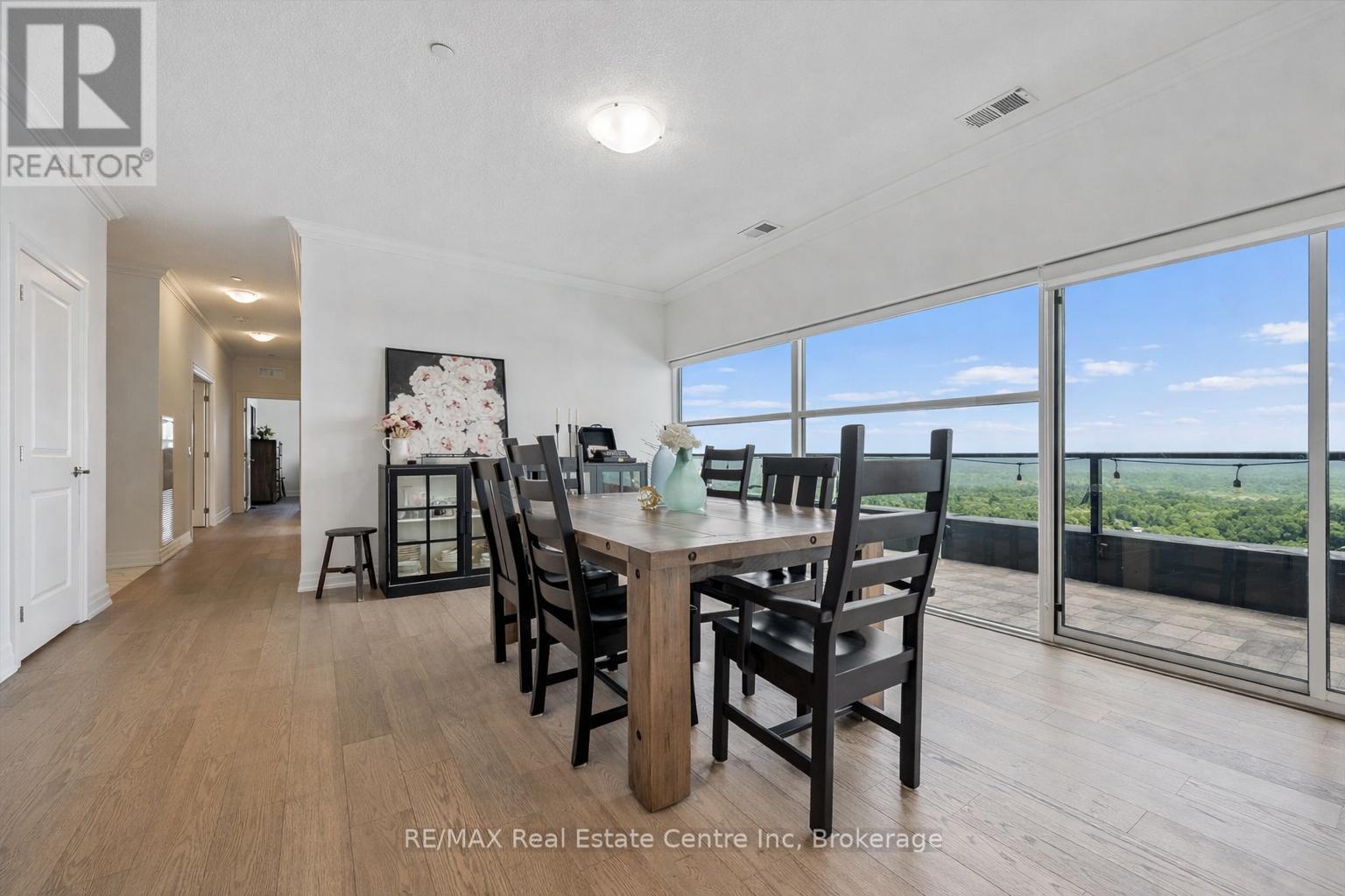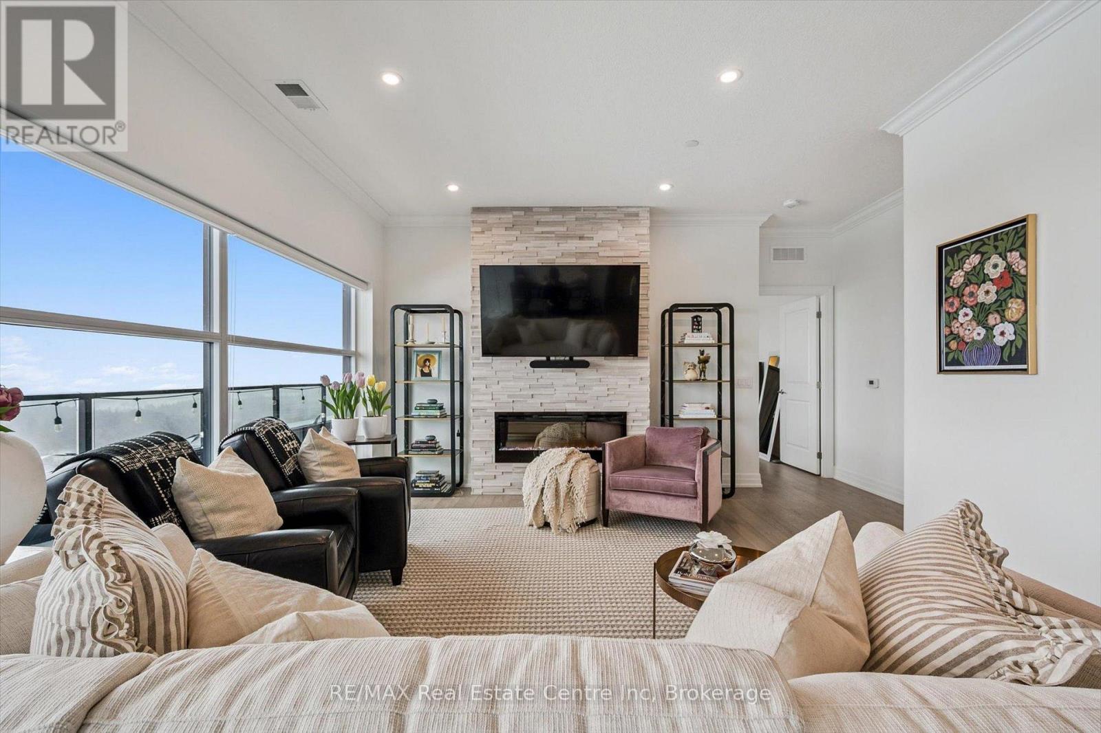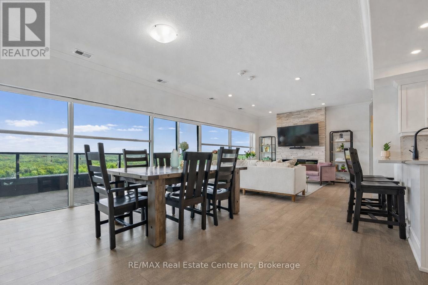 Spectacular 3-bdrm + den residence offering 2006sqft of refined living space in Guelph's most sought-after south-end addresses! Nestled within esteemed prof. managed building W/resort-style amenities, this exceptional penthouse delivers perfect balance of luxury, comfort & convenience. Breathtaking wall of floor-to-ceiling windows span living & dining areas flooding the home W/natural light & framing treetop views. Open-concept layout feels expansive yet welcoming ideal for everyday living & entertaining. Dining area flows seamlessly into living room where fireplace adds warmth & architectural interest. Sliding doors lead to massive 1042sqft south-facing private terrace offering unobstructed views over lush greenspace, tranquil water & miles of trails. Designed for unforgettable gatherings or peaceful moments, this space accommodates multiple seating areas. Whether hosting under the stars or enjoying morning coffee, this terrace isn't just an extension of living space, it's your serene retreat from hustle & bustle of everyday life! Chef-inspired kitchen W/white cabinetry is complemented by elegant backsplash, quartz counters & island W/breakfast bar seating. High-end S/S appliances, range hood & B/I microwave complete a space that is functional & beautiful. Primary bdrm W/dramatic wall of windows & serene views, W/I closet & ensuite W/dbl quartz vanity, soaker tub & W/I glass shower. 2 add'l bdrms offer large windows & closet space. Glass French doors open to den perfectly suited for home office or reading room. 4pc main bath W/quartz counters & W/I glass shower. 2pc bath completes the layout. Enjoy access to impressive amenities: state-of-the-art fitness centre, lounge W/kitchen & billiards, outdoor terrace, golf simulation W/bar area & guest suites. Located in the vibrant south end you'll have access to 401, UofG, GO Transit, dining, shopping & more. Penthouse 1404 is a rare offering, 1 of only 4 penthouses combining exceptional space, views & elevated lifestyle! (id:64974)