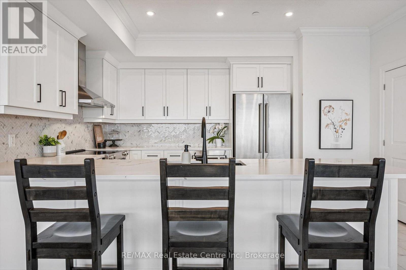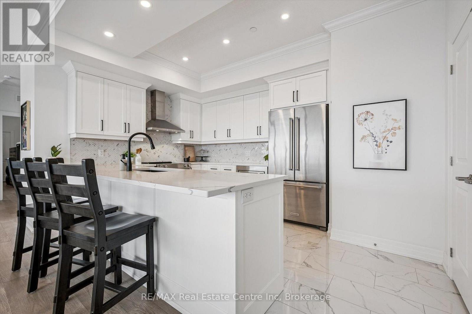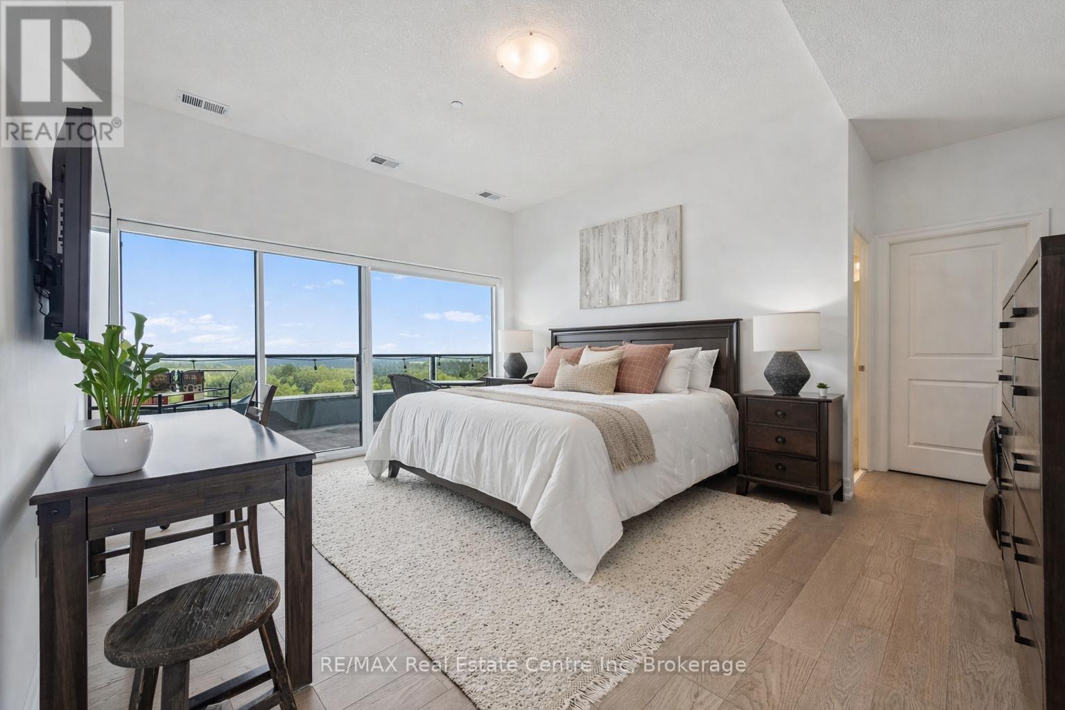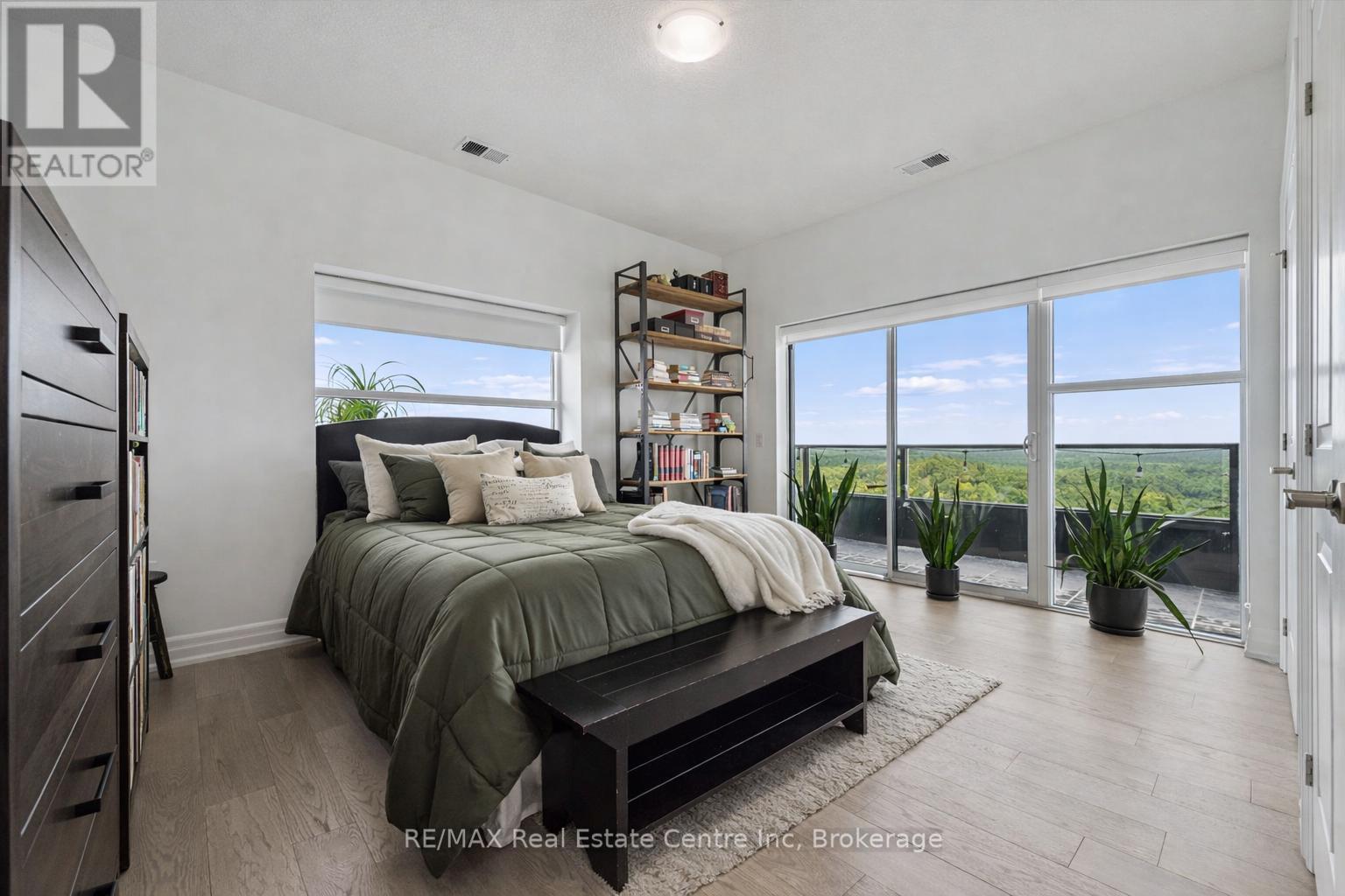 Spectacular 3-bdrm + den residence offering 2006sqft of refined living space in Guelph's most sought-after south-end addresses! Nestled within esteemed prof. managed building W/resort-style amenities, this exceptional penthouse delivers perfect balance of luxury, comfort & convenience. Breathtaking wall of floor-to-ceiling windows span living & dining areas flooding the home W/natural light & framing treetop views. Open-concept layout feels expansive yet welcoming ideal for everyday living & entertaining. Dining area flows seamlessly into living room where fireplace adds warmth & architectural interest. Sliding doors lead to massive 1042sqft south-facing private terrace offering unobstructed views over lush greenspace, tranquil water & miles of trails. Designed for unforgettable gatherings or peaceful moments, this space accommodates multiple seating areas. Whether hosting under the stars or enjoying morning coffee, this terrace isn't just an extension of living space, it's your serene retreat from hustle & bustle of everyday life! Chef-inspired kitchen W/white cabinetry is complemented by elegant backsplash, quartz counters & island W/breakfast bar seating. High-end S/S appliances, range hood & B/I microwave complete a space that is functional & beautiful. Primary bdrm W/dramatic wall of windows & serene views, W/I closet & ensuite W/dbl quartz vanity, soaker tub & W/I glass shower. 2 add'l bdrms offer large windows & closet space. Glass French doors open to den perfectly suited for home office or reading room. 4pc main bath W/quartz counters & W/I glass shower. 2pc bath completes the layout. Enjoy access to impressive amenities: state-of-the-art fitness centre, lounge W/kitchen & billiards, outdoor terrace, golf simulation W/bar area & guest suites. Located in the vibrant south end you'll have access to 401, UofG, GO Transit, dining, shopping & more. Penthouse 1404 is a rare offering, 1 of only 4 penthouses combining exceptional space, views & elevated lifestyle! (id:64974)