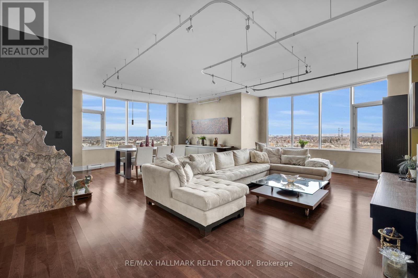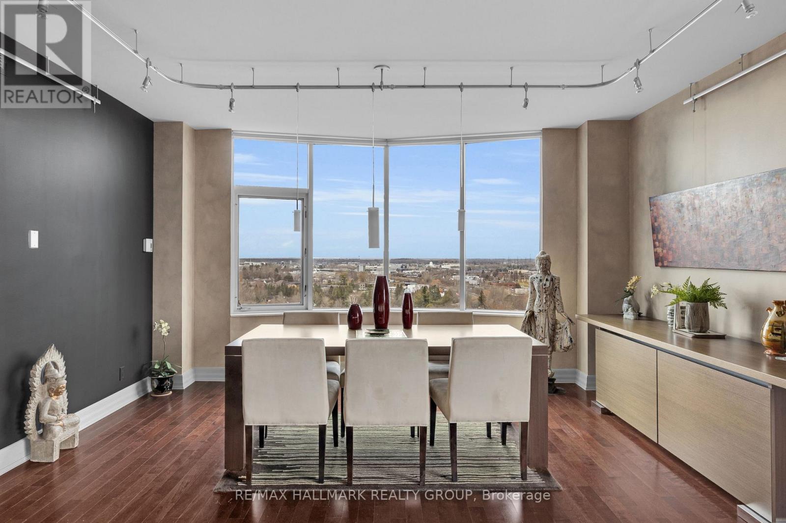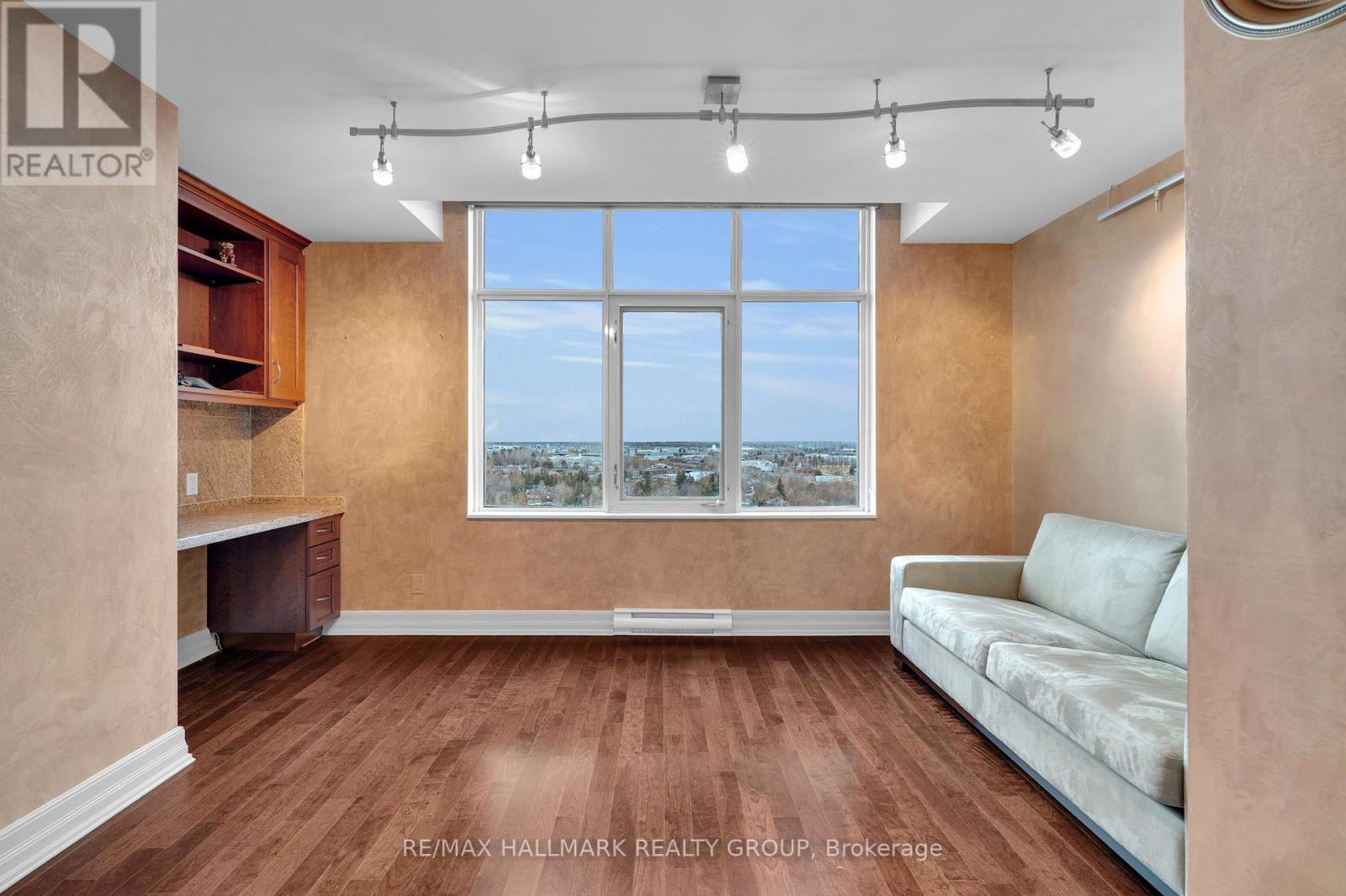 Truly one of the best condominium residences in Ottawa! Seldom available "06" layout at Riverside Gate, CORNER UNIT! Perched on the 14th floor, this unique and refined condo showcases breathtaking, open northwest vistas overlooking the Rideau River, Downtown Ottawa, and the Gatineau Hills. The original owner has modified and added upscale finishing. Ideal for art collectors. Must be seen. The Versailles offers 2169 sqft , 2 Bedroom + Den and 3 Bathrooms, 2 storage lockers, with 2 spacious parking spaces and a large, recessed, glass enclosed terrace. Secure gated community, concierge on duty, TENNIS COURTS, exercise room, indoor pool with sun terrace, sauna, party room, BBQ terrace, billiards room, library, hobby room, bicycle storage room, guest suite, underground parking with car wash bay, storage facilities on each floor. Flexible possession. 24 h irrevocable on offers. (id:64974)