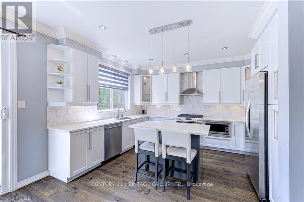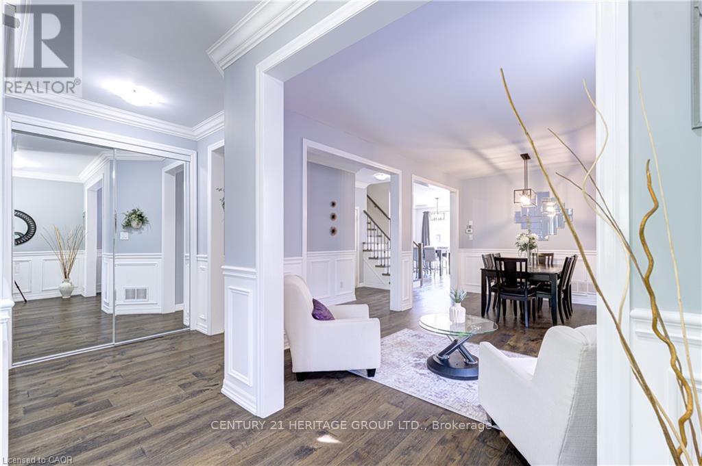 Stunning, detached home in Milton's highly sought-after Beaty neighbourhood! Offering over 4,000 sq ft of beautifully finished living space, this 4-bedroom, 4-bathroom home is designed with modern living and entertaining in mind. The main floor features engineered hardwood throughout, timeless wainscoting trim, a large dedicated office, and a beautiful, open-concept kitchen/dinette with upgraded appliances, an island w/seating, and a walkout to a wood deck and fully landscaped backyard-complete with a cabana bar/shed and wiring ready for a hot tub! The family room is anchored by a cozy gas fireplace, perfect for relaxing evenings. Upstairs also features engineered hardwood throughout, generous bedroom sizes, a spacious primary retreat with a large walk-in closet and luxurious 5-piece ensuite, and a cozy sitting area by the landing. A versatile bonus room connects two of the bedrooms-ideal as a shared playroom, office/den, or walk-in closet. The convenience of a second-floor laundry room adds even more practicality. The fully finished basement offers laminate flooring, a kitchenette equipped with an island w/seating, dining area, family room w/electric fireplace, rec room, and a 3-piece bath-perfect for extended family, teens, or entertaining. Additional features include carpet free home throughout, furnace (2020), A/C (2022), and an attached 2-car garage with inside entry. Located just steps to parks, schools, transit, and all amenities, this home is perfect for families looking for space, function, and style in one of Milton's most family-friendly communities. (id:64974)