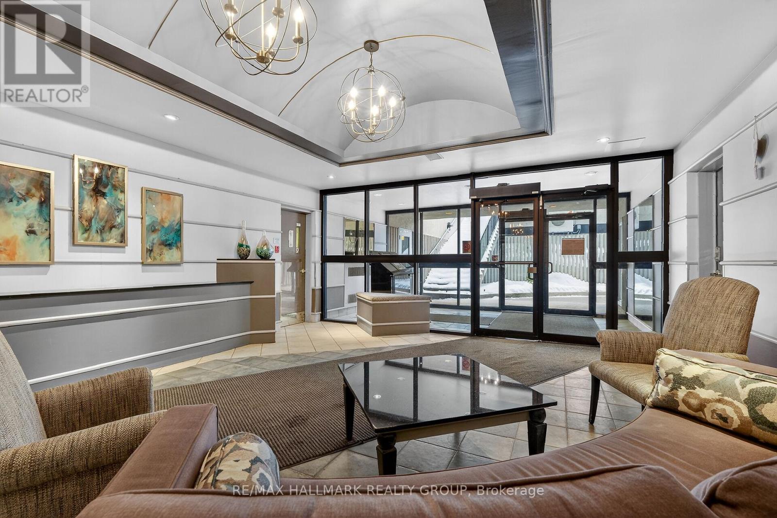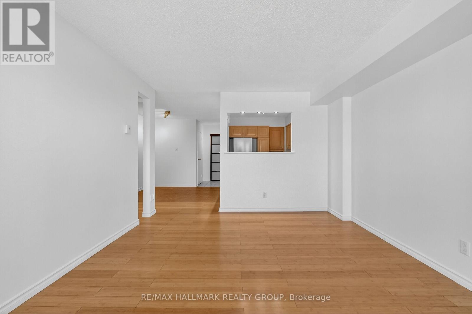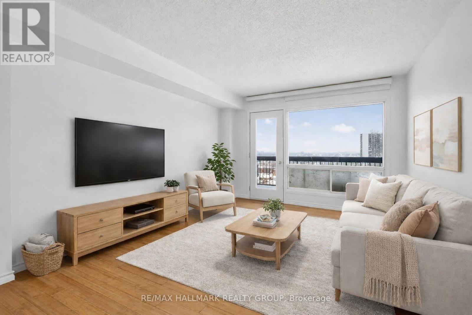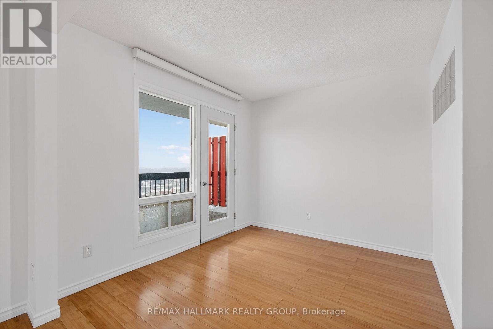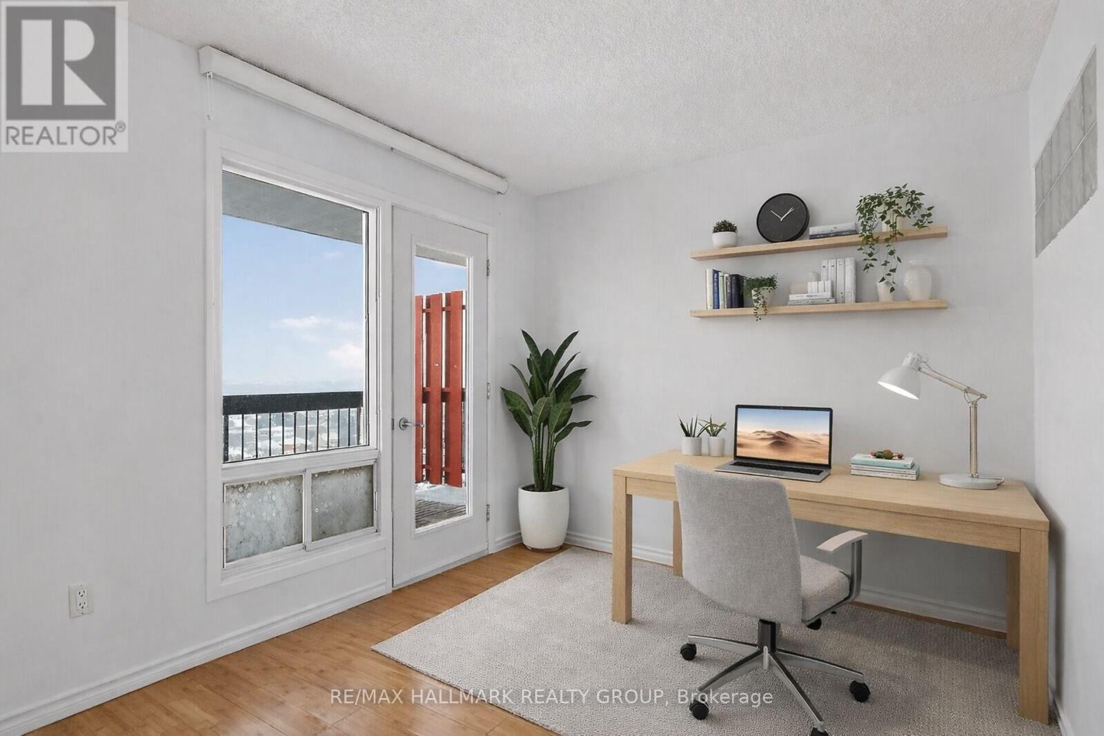 Perched on the 14th floor, this exceptional corner condo offers peaceful panoramic views with sun-filled south and east exposures. Featuring the largest floor plan in the building at just over 1,000 sq. ft., this residence stands out for both size and versatility. Enjoy two separate balconies, perfect for morning coffee or unwinding at sunset. Originally designed as a 2-bedroom plus den, the current owner removed a wall to create an expansive, studio-style primary retreat with den, ideal for those craving an oversized bedroom. Prefer a dedicated workspace or guest room? Easily reinstall the wall to restore a private den or third bedroom with direct balcony access. The suite features updated flooring throughout (carpet-free), an updated, modern bathroom with a walk-in shower, and a generous ensuite storage/pantry. Underground parking is included. The building offers outstanding amenities, including an indoor pool, full fitness centre, and even a convenience store on site, perfect for days you don't want to step outside. An unbeatable, super walkable location puts public transit just one minute away, a modern Loblaws across the street, four nearby parks, schools, and Montfort Hospital all within easy reach. (id:64974)