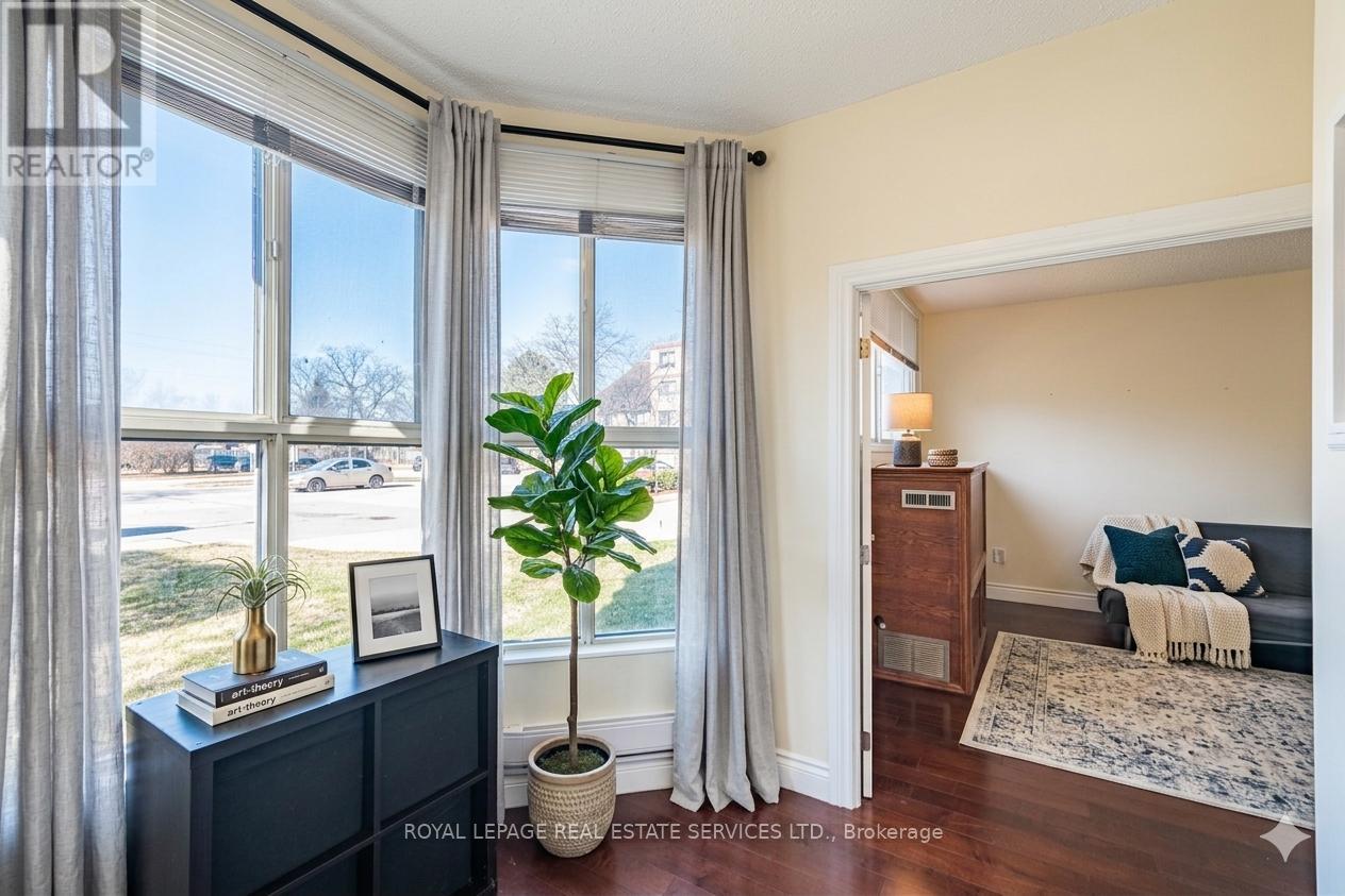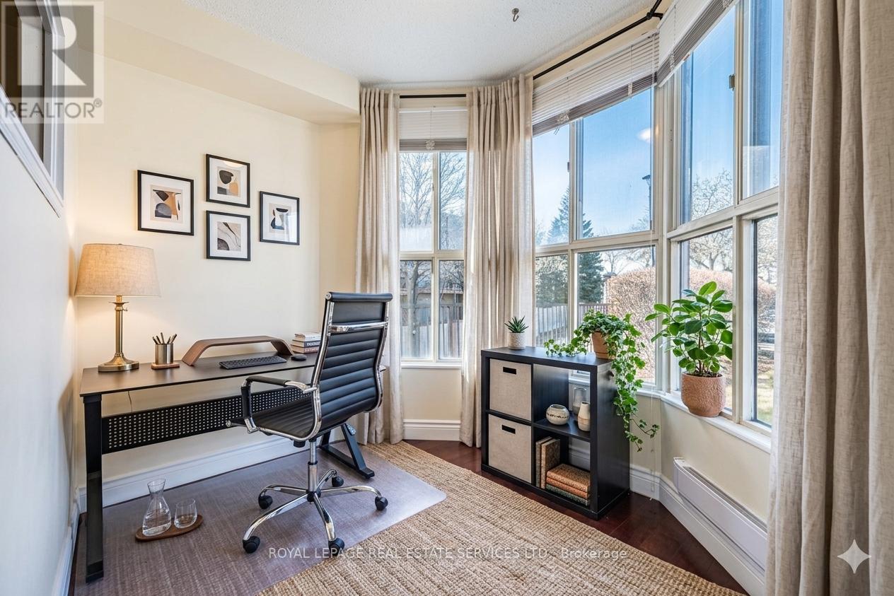 Step into comfort and charm at Camelot on the Park-a welcoming community where everyday living feels just a little more special. Ideally located at 8351 McLaughlin Rd S, you're perfectly positioned to enjoy nearby parks, a large shopping mall, transit, schools, and a variety of restaurants, all just moments from your door. This bright and beautifully maintained 1-bedroom + Den , 1-bathroom ground-floor condo offers a thoughtfully designed layout that feels both open and cozy. Sunlight pours through southwest-facing windows, creating a warm, inviting atmosphere throughout the day. The open-concept living and dining area is perfect for quiet evenings in front of an electric fireplace or hosting friends, while updated laminate flooring and a refreshed kitchen with sleek stainless-steel appliances add a modern touch. The spacious bedroom provides a peaceful retreat, and the enclosed den with elegant French doors offers wonderful flexibility, ideal as a home office, cozy reading nook, guest space, or a children's bedroom. Enjoy the added comfort of in-suite laundry and the everyday convenience of secure underground parking-especially appreciated during the winter months. Residents also have access to a fantastic selection of amenities, including an indoor pool, fitness centre, games room, library, and guest suites, along with welcoming common spaces that foster a true sense of community. Move in, settle down, and start enjoying a lifestyle that blends ease, warmth, and connection in one delightful place. (id:64974)