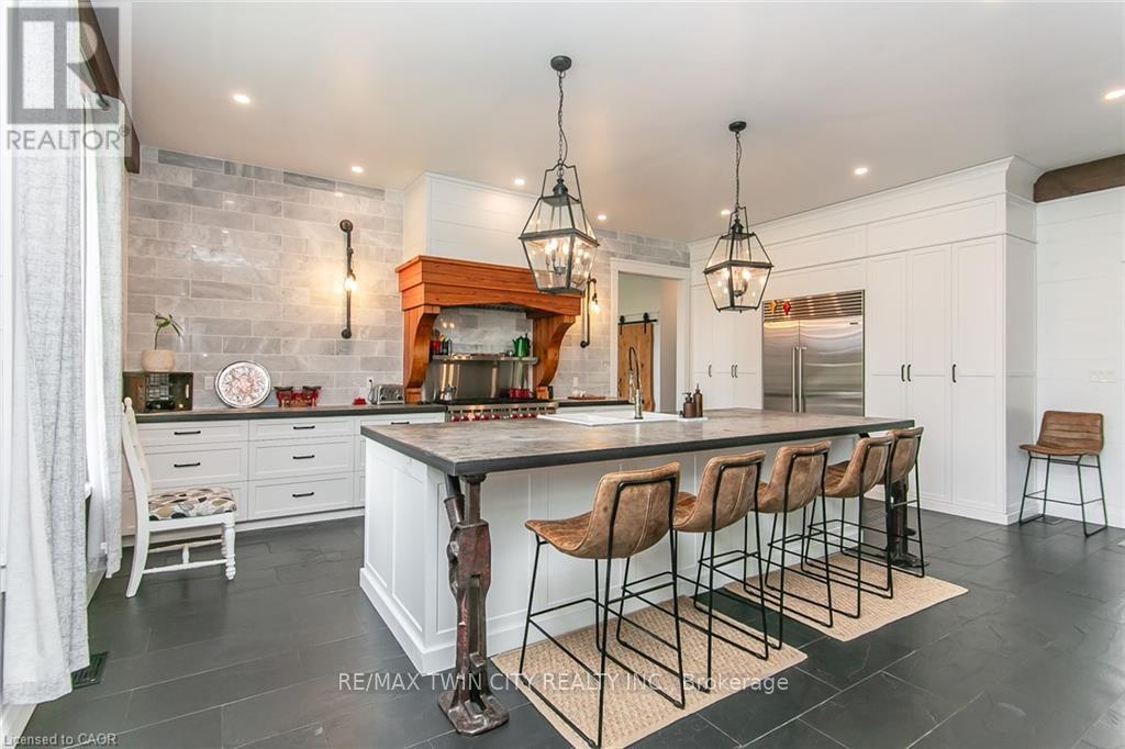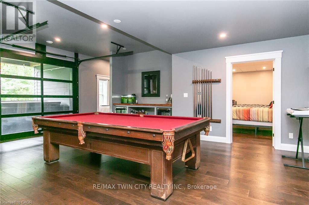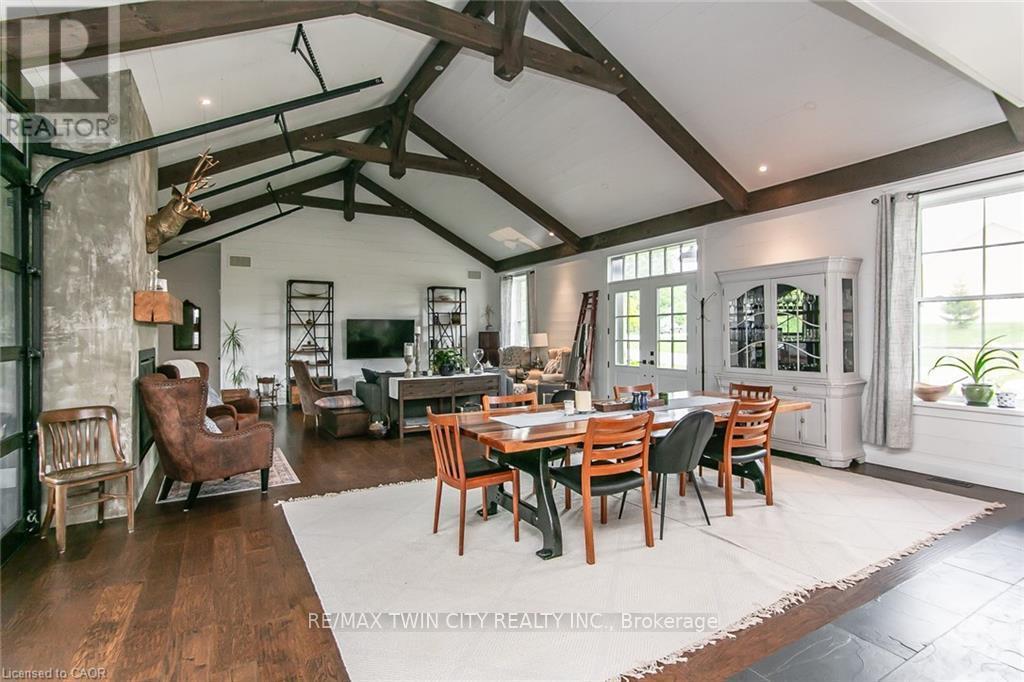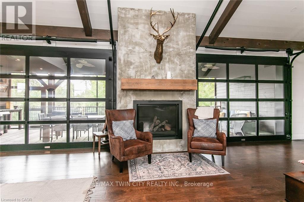 Spectacular Custom-Built Bungalow with Walk-out Basement, Triple Car Garage & Detached 2-Storey Garage & Shop on Two Acres-just 35-45 min from Waterloo! Nestled in an exclusive enclave of executive homes in Moorefield, this property offers a peaceful country setting with easy city access. Built like no other, it showcases structurally superior ICF (insulated concrete form) construction & a lifetime metal roof-the same quality extends to the det garage. Inside, the open-concept layout features exposed timber-frame details, soaring vaulted ceilings & 2 glass garage doors that open onto a 3-season porch.The kitchen, dining & living area impress w/ a stone f/p, concrete counters, oversized island & fantastic walk-in pantry w/ floor-to-ceiling storage. At its heart: an 8-burner Wolf gas stove, double ovens & upgraded range hood-over $40,000 in luxury appliances! Entertain year-round w/ the screened porch, complete w/ outdoor kitchen, brick hearth & fume hood for your bbq. The main floor also boasts a stunning primary suite w/ walk-in closet, spacious dressing rm & spa-inspired ensuite. A 2nd bedroom, currently an office, offers lovely treed views. A stylish mudrm, laundry rm & powder rm w/ live-edge barn door complete the main level. The fin w/o basement features heated floors, 2 bedrooms, 4-pc bath & expansive rec spaces-perfect for family gatherings or games night. 2 more w/o garage doors lead to the backyard & patio. For hobbyists, the 3-car gar is wired for an EV, while the sep insulated 2 storey wrkshp w/ electrical & wood stove provides endless options for projects, vehicles or gym. The nearly 2-acre property incl a pool-sized lot, new tiered deck, firepit area, treehouse & almost an acre of forest w/ a creek running through it. Your own private retreat! (id:64974)